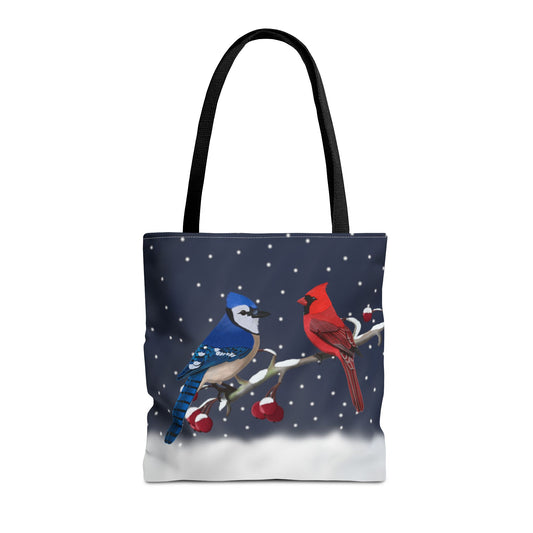 Blue jay and Cardinal on a Winter Branch Christmas Bird Tote Bag 16"x16"