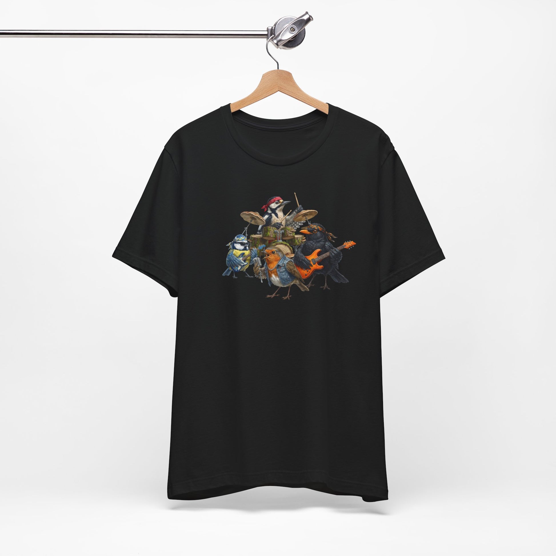 Die Gartenvögel Rockband T-Shirt – Lustiges Vogel Shirt mit Rückendruck – Amsel, Rotkehlchen, Meise, Specht – Geschenk für Musiker & Vogelfreunde