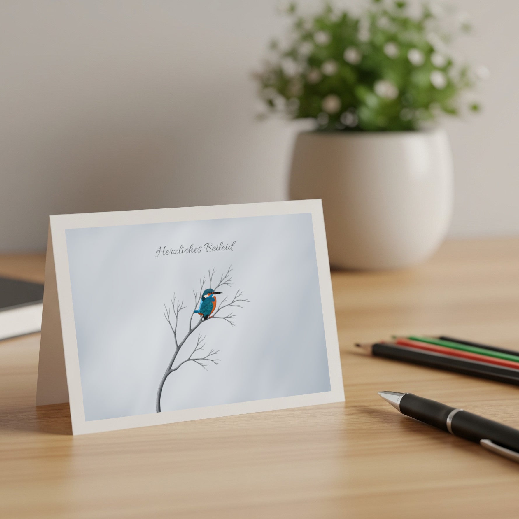 Drück dein tiefstes Mitgefühl mit unserer liebevoll handgefertigten Trauerkarte aus. Das beruhigende Vogelmotiv eines kleinen Eisvogels auf einem grauen Ast symbolisiert Frieden und Hoffnung in schweren Zeiten.