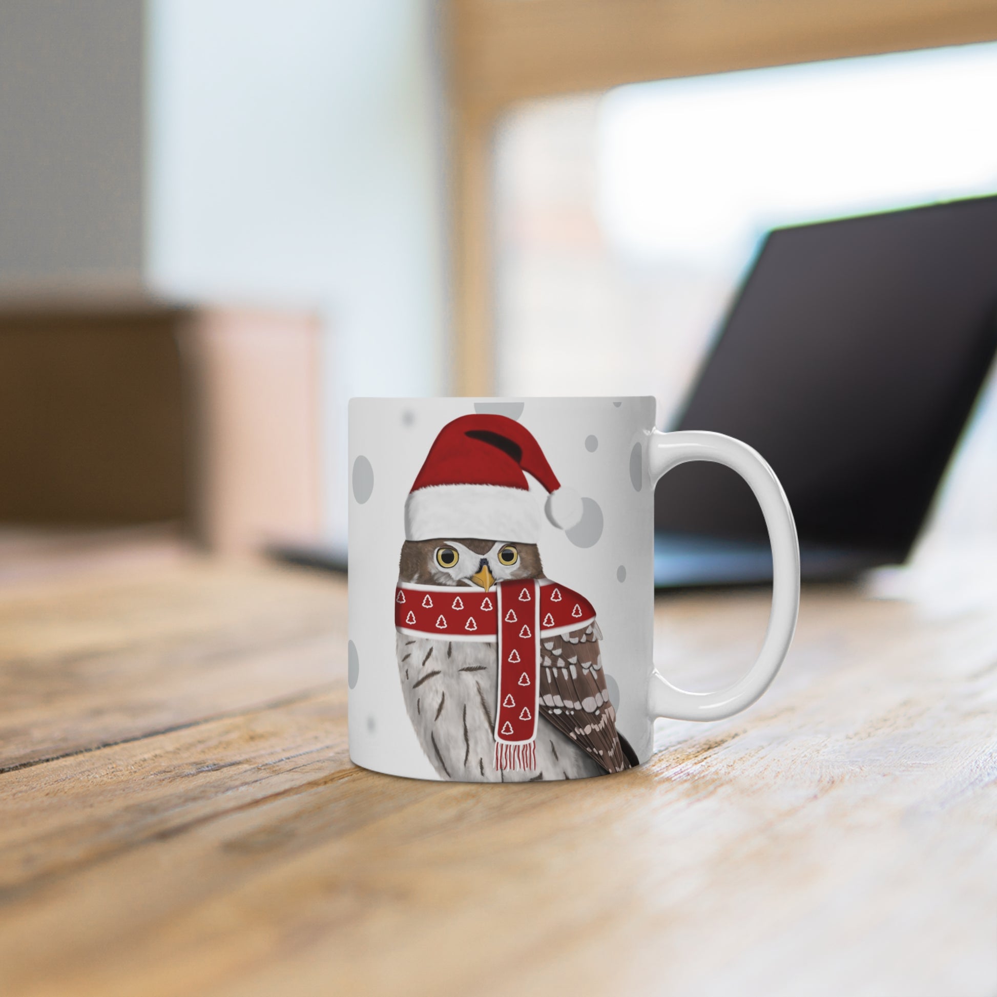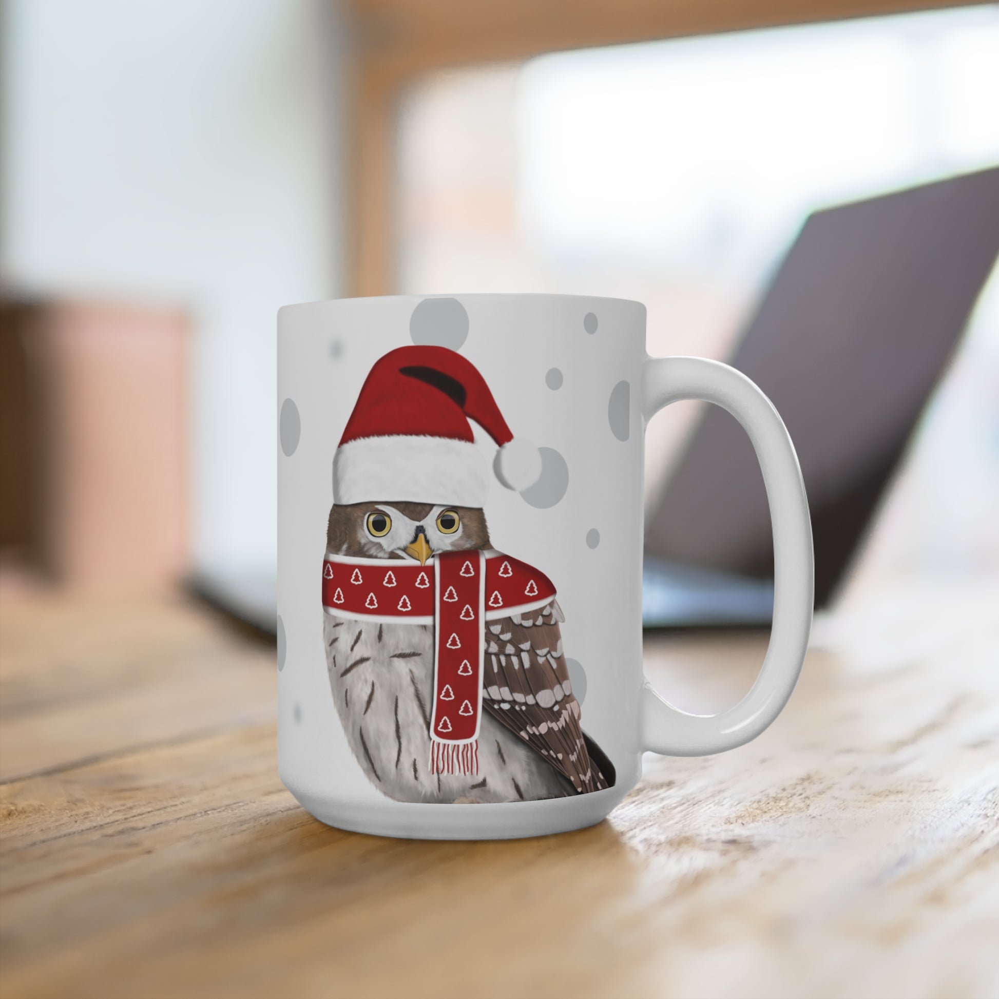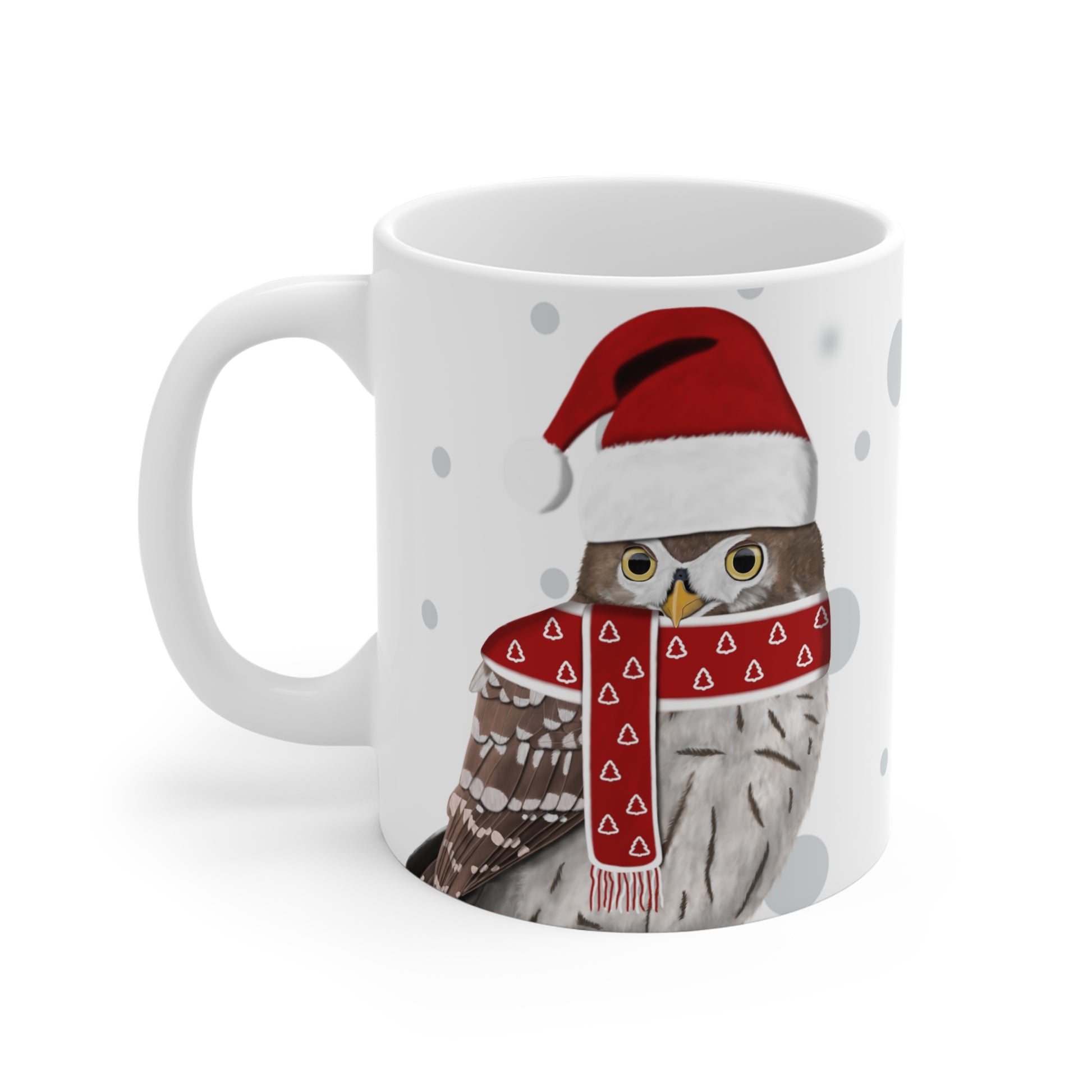 Unsere Eule als Weihnachtsmann Vogel Tasse ist perfekt für Tee und heiße Schokolade. Die klassische Tasse ist in den Größen 11 oz. (0,33l) und 15 oz. (0,44l) erhältlich und eignet sich hervorragend als Weihnachtsgeschenk für alle Vogelfreunde.