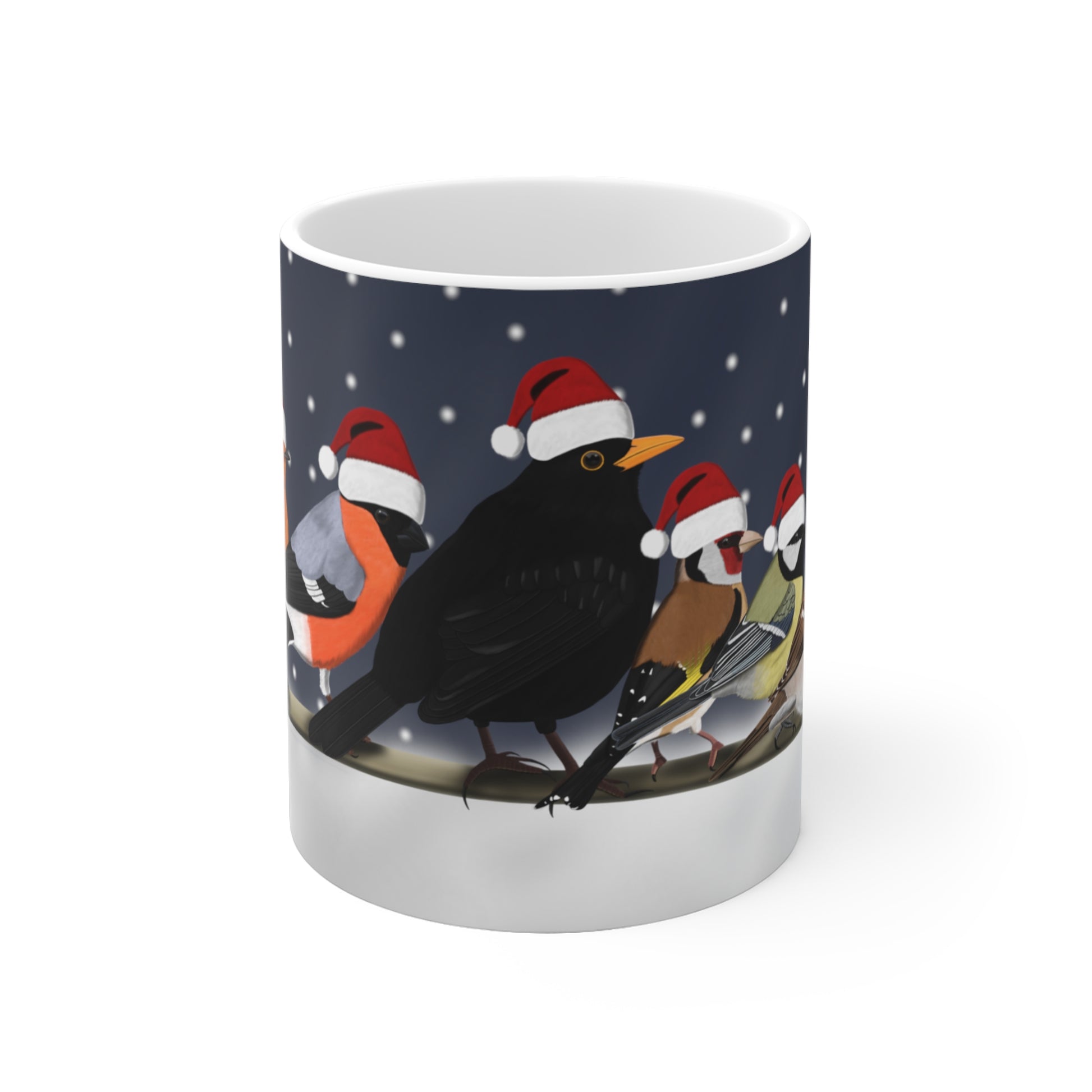 - Weihnachtliches Vogelmotiv auf beiden Seiten der Tasse