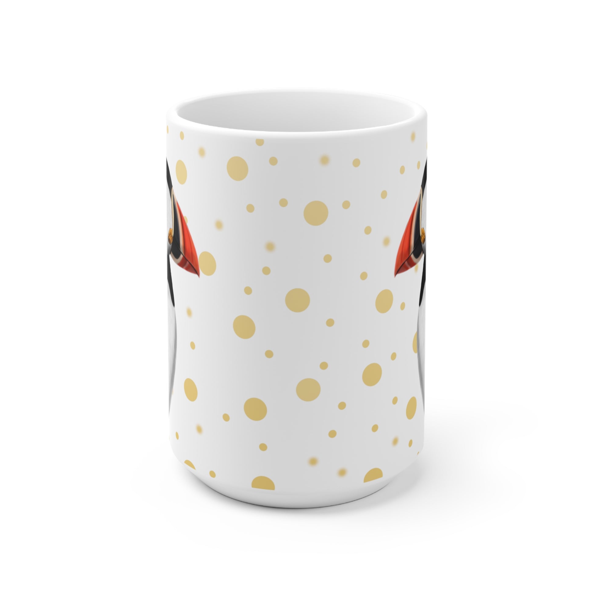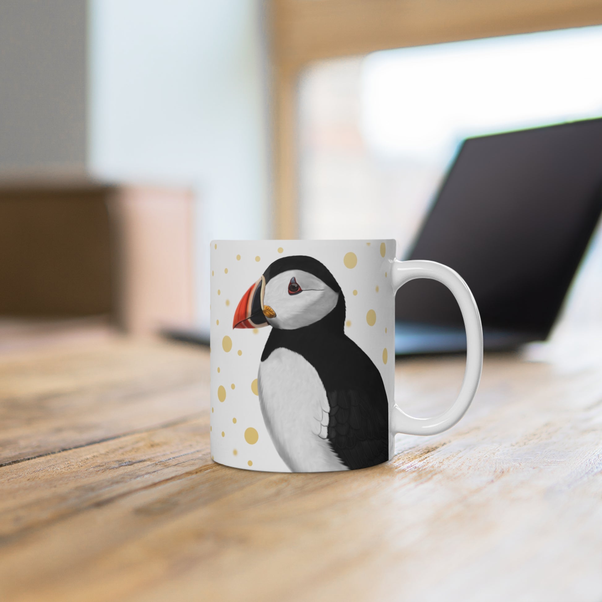 Unsere Papageitaucher mit Goldenen Punkten Vogel Tasse ist perfekt für Tee und heiße Schokolade. Die klassische Tasse ist in den Größen 11 oz. (0,33l) und 15 oz. (0,44l) erhältlich und eignet sich hervorragend als Geschenk für alle Vogelfreunde und Voglebeobachter.