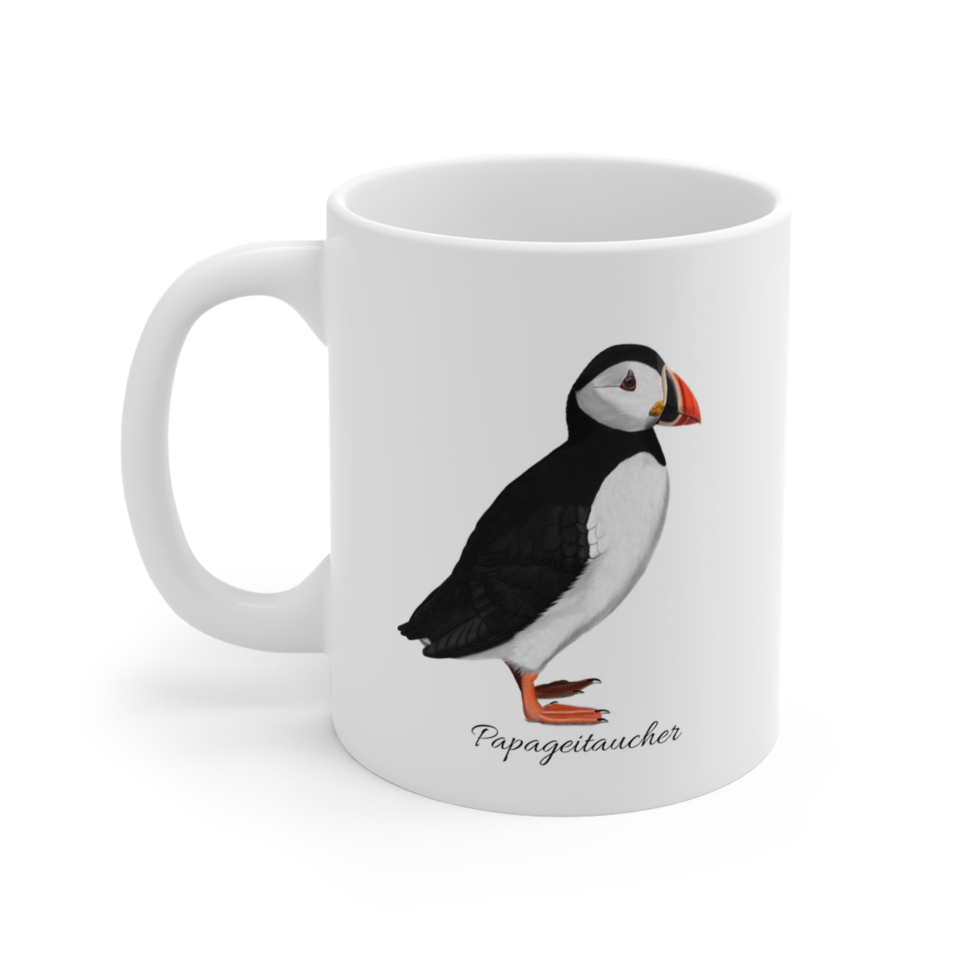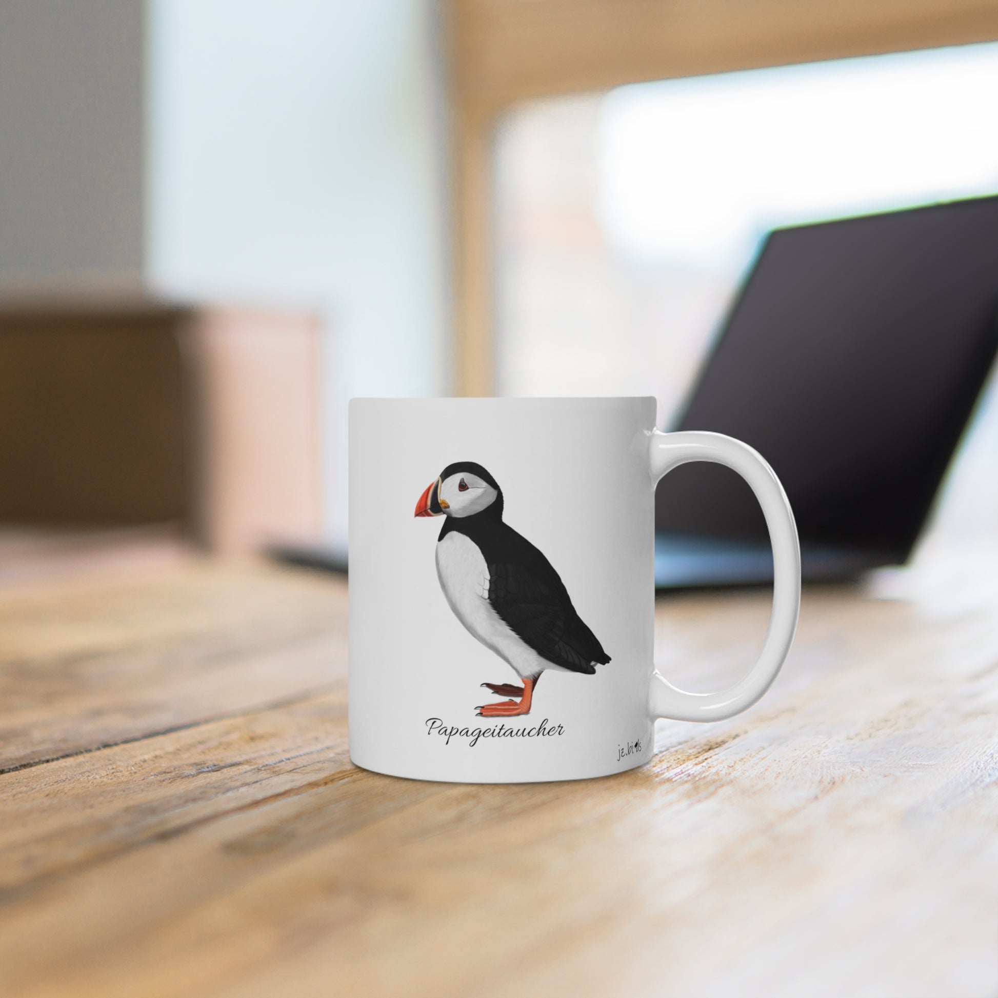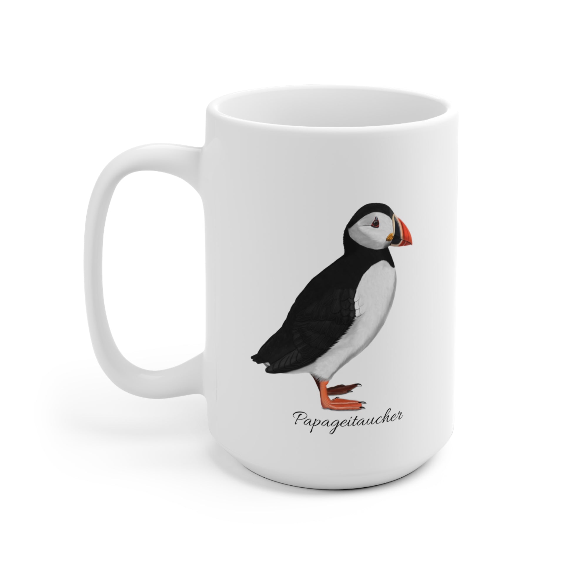 Unsere Papageitaucher Vogel Tasse ist perfekt für Tee und heiße Schokolade. Die klassische Tasse ist in den Größen 11 oz. (0,33l) und 15 oz. (0,44l) erhältlich und eignet sich hervorragend als Geschenk für alle Vogelfreunde und Vogelbeobachter.