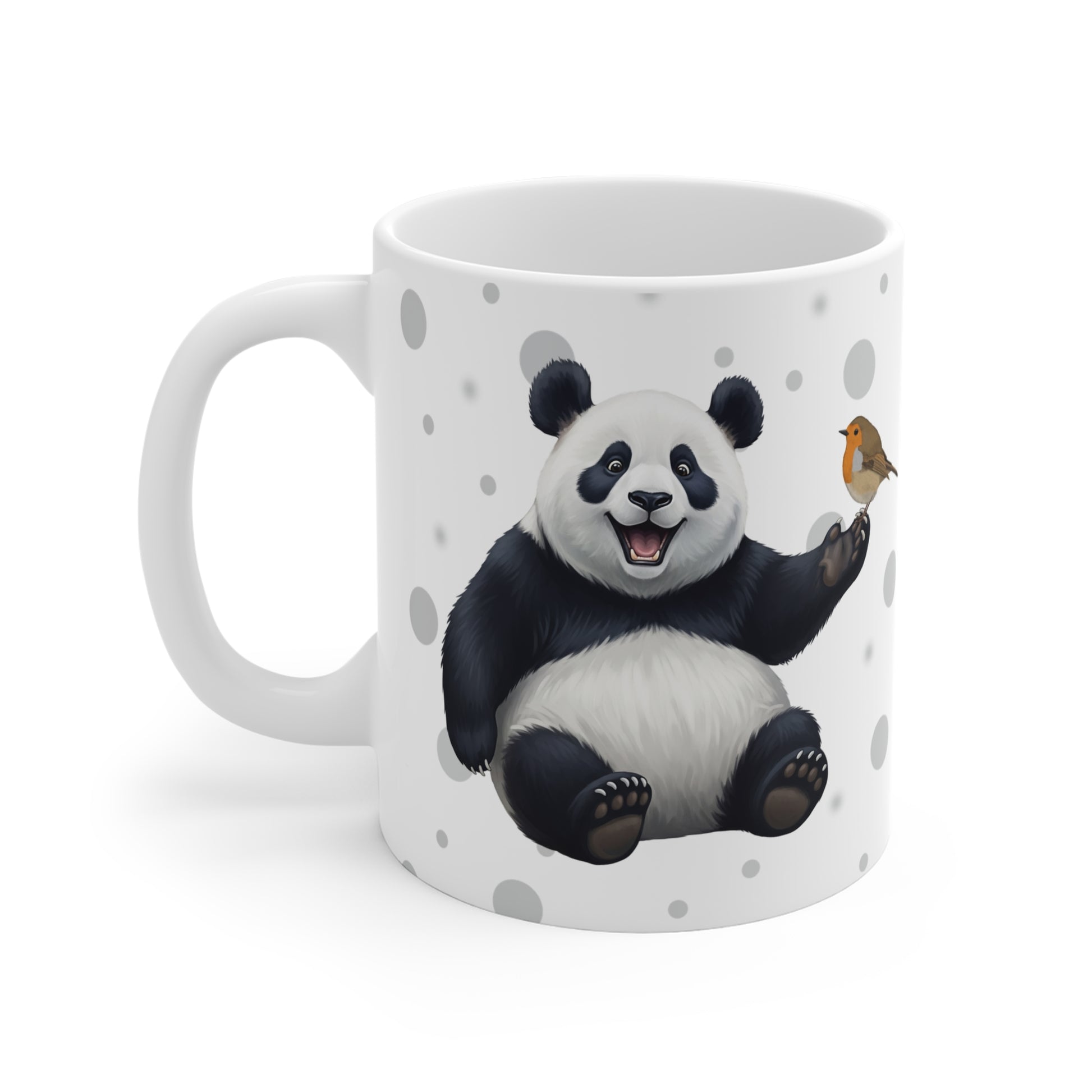 Rotkehlchen mit einem fröhlichen Panda Vogel Tiermotiv Tasse Punkte Grau