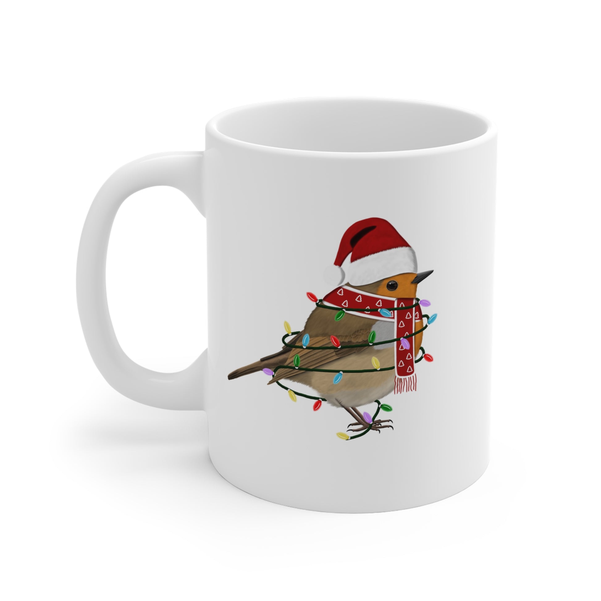 Rotkehlchen Tasse Vogel als Weihnachtsmann mit Lichterkette Weiß für Vogelfreunde