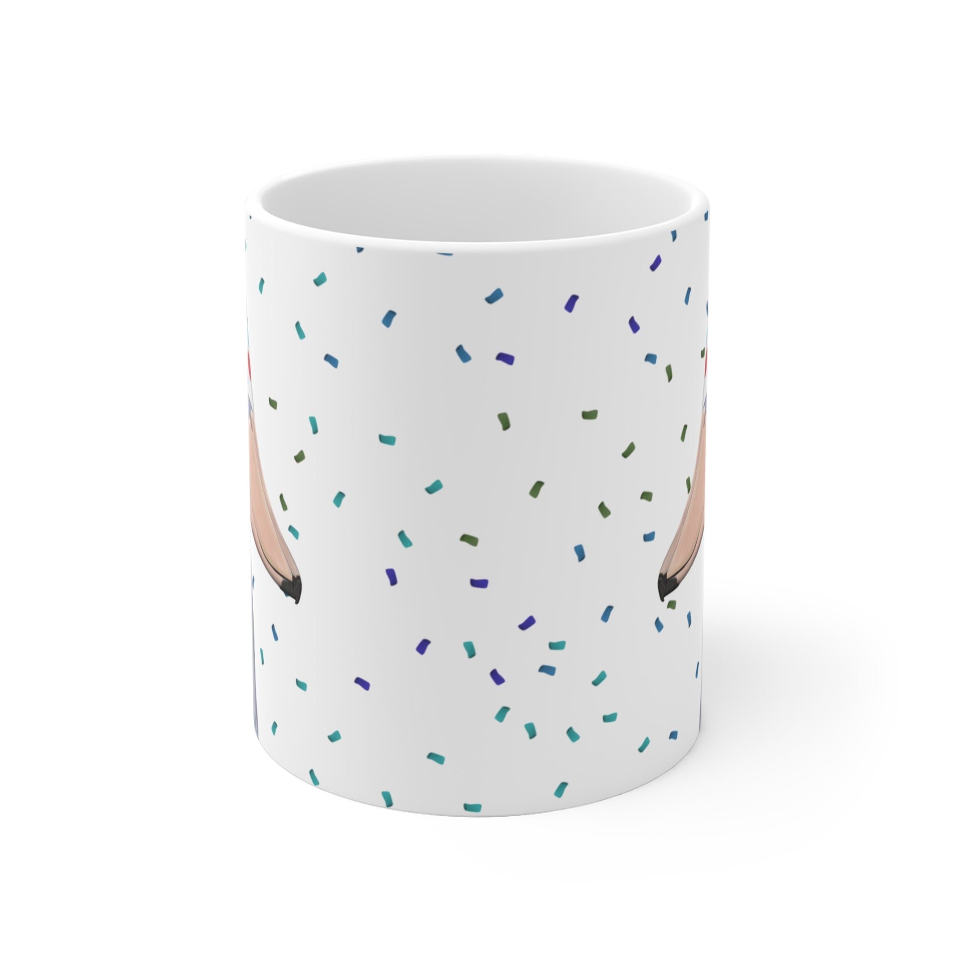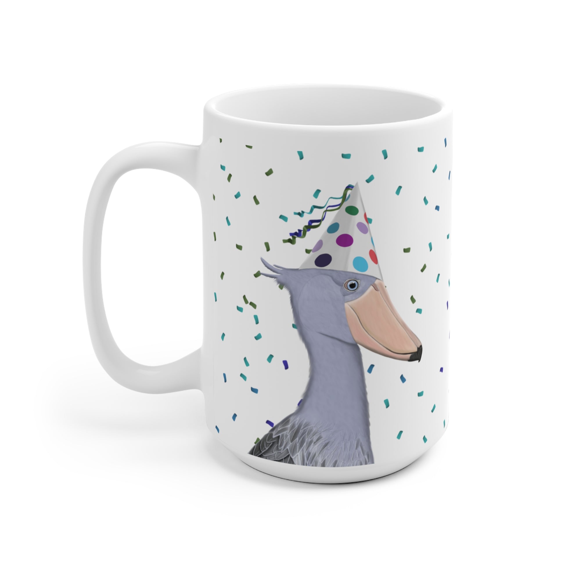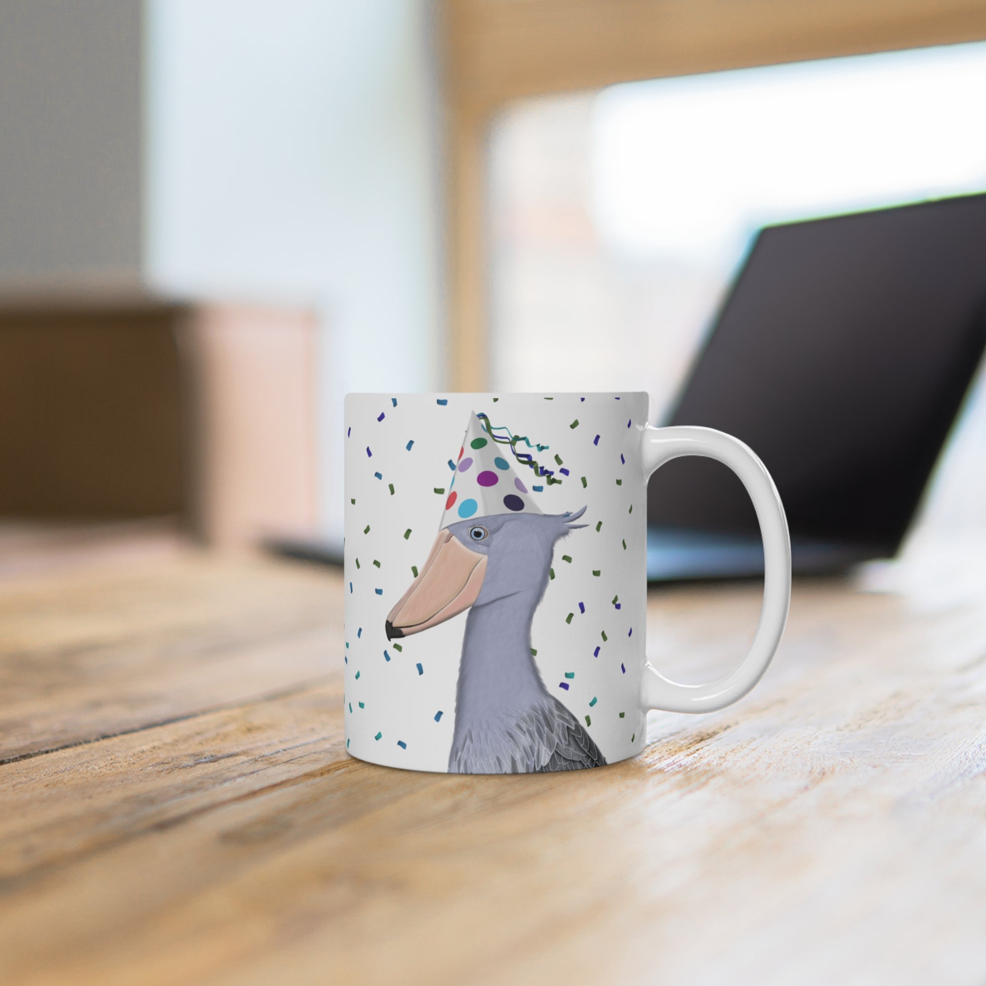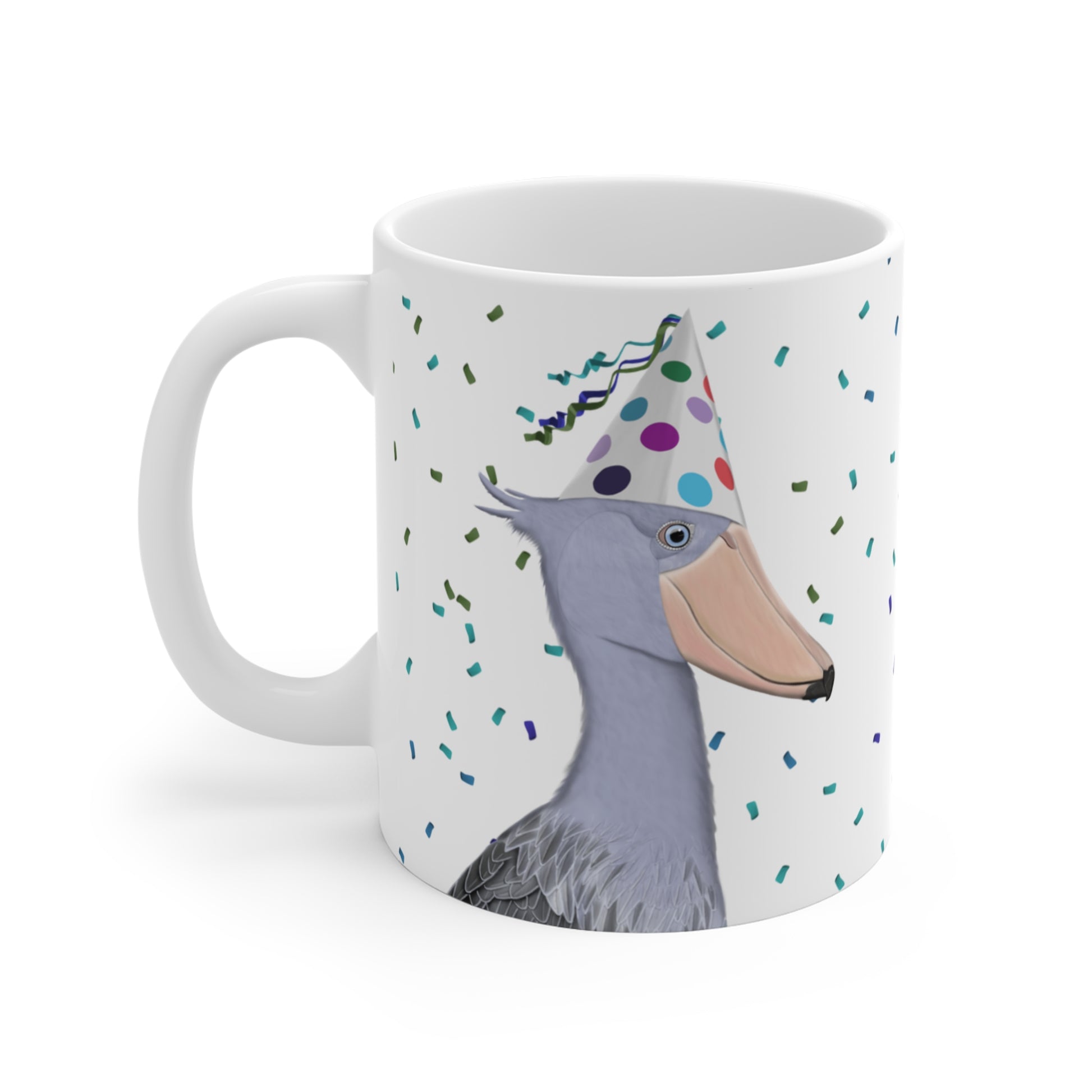 Unsere Schuhschnabel feiert Geburtstag mit Partyhut und Konfetti Vogel Tasse ist perfekt für Tee und heiße Schokolade. Die klassische Tasse ist in den Größen 11 oz. (0,33l) und 15 oz. (0,44l) erhältlich und eignet sich hervorragend als Geschenk für alle Vogelfreunde zum Geburtstag als zusätzliche kleine Überraschung.