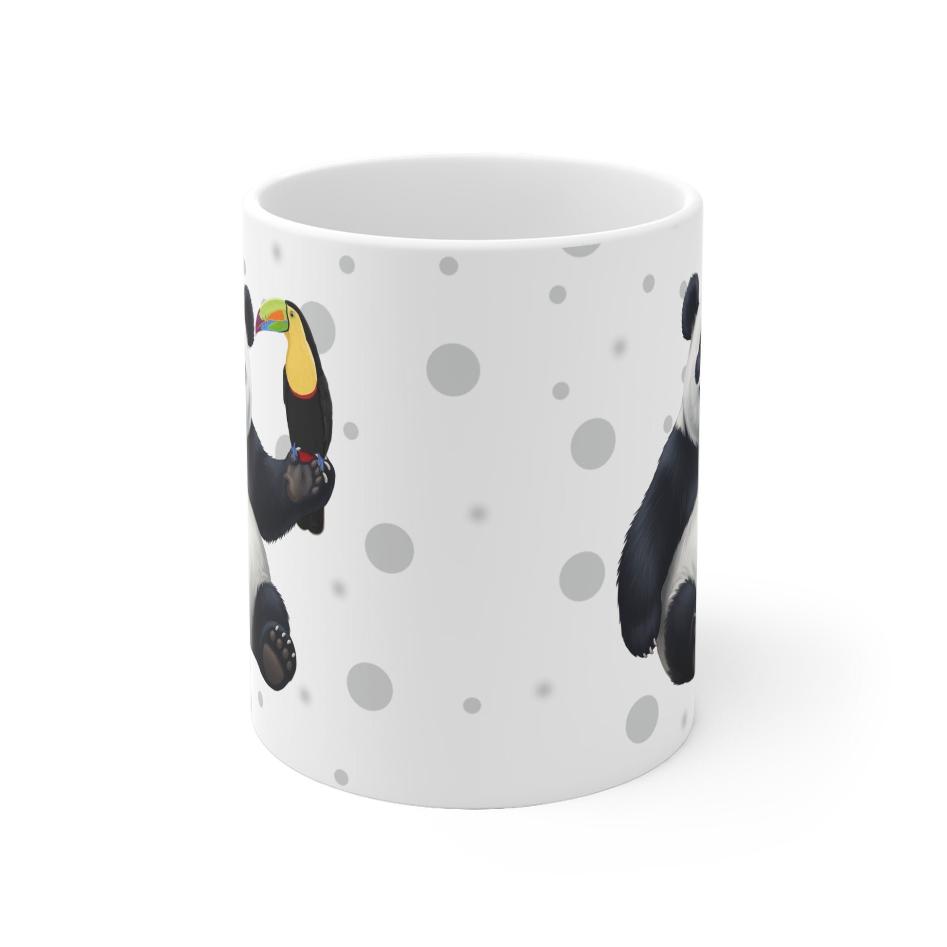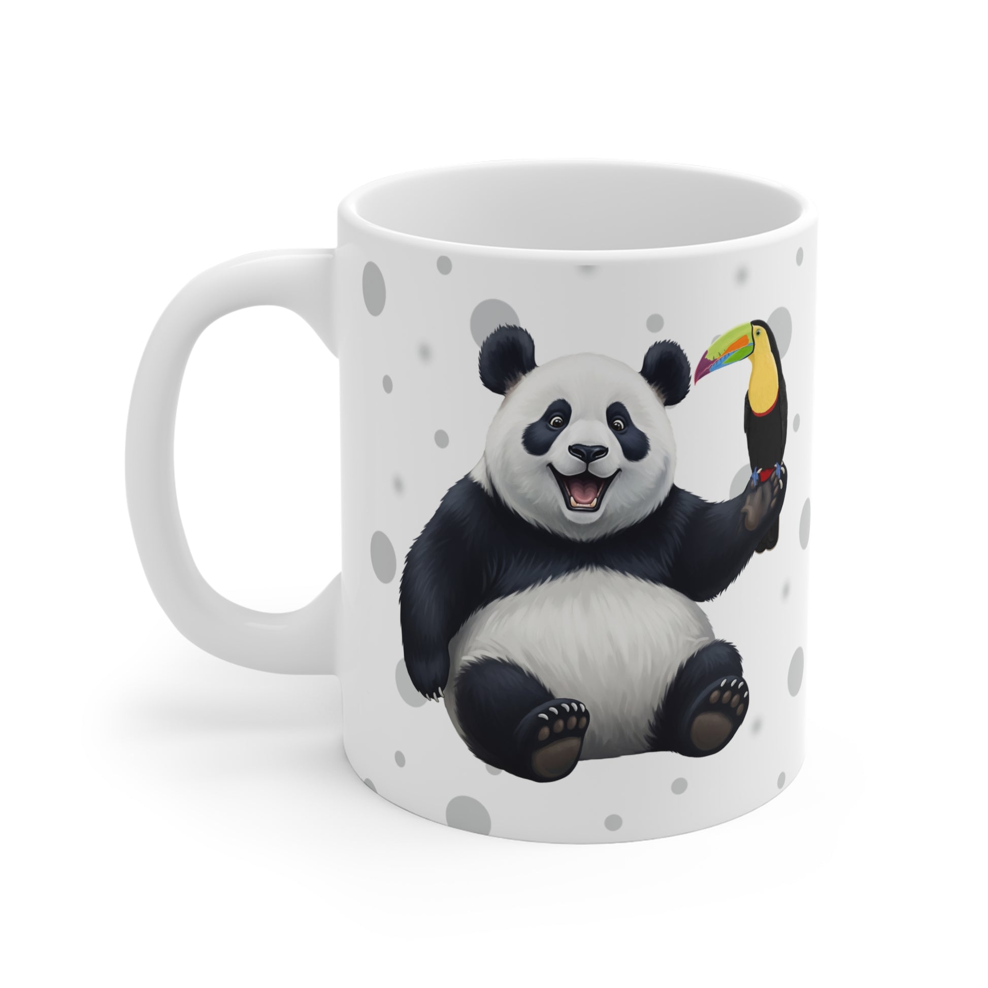 Tukan mit einem fröhlichen Panda Vogel Tiermotiv Tasse Punkte Grau
