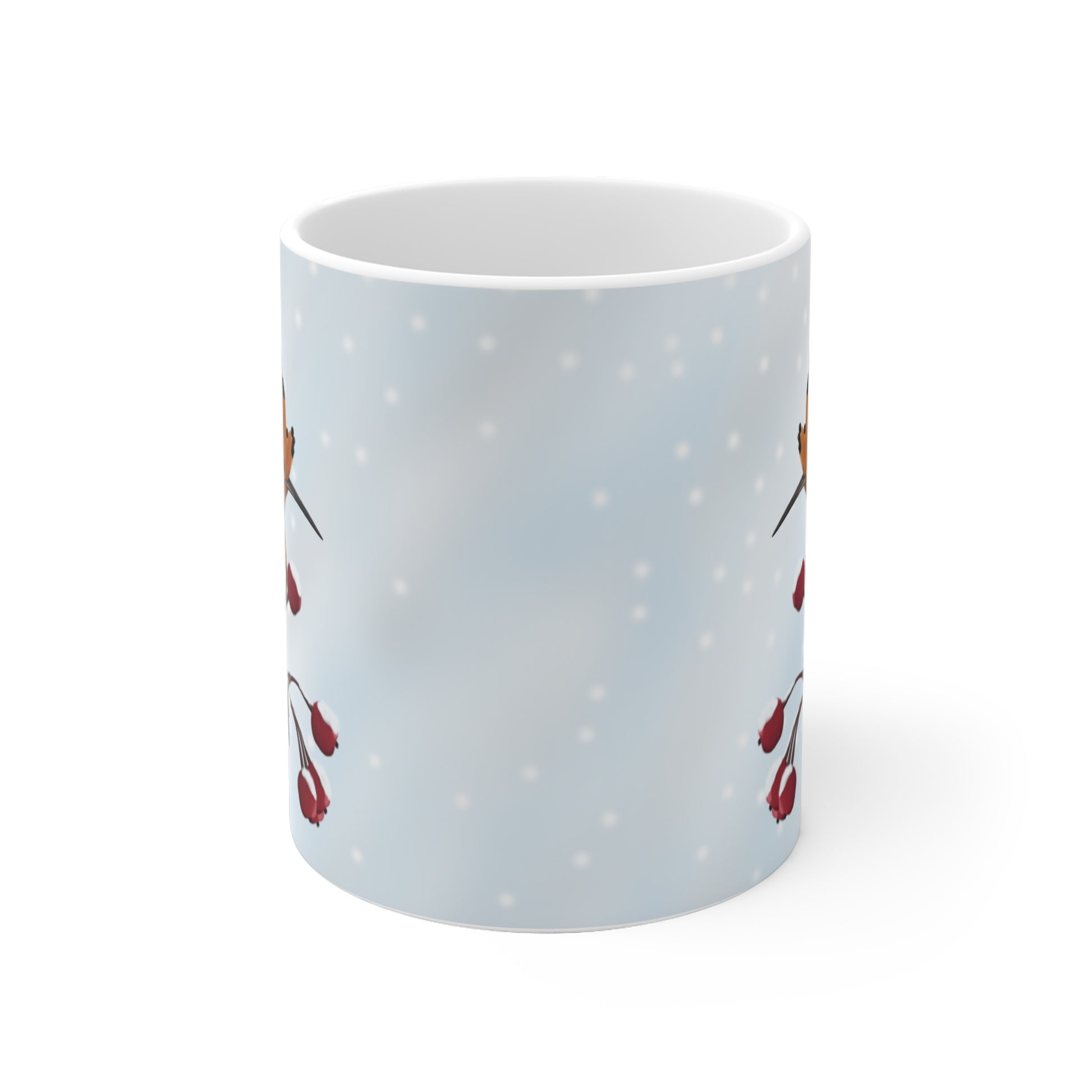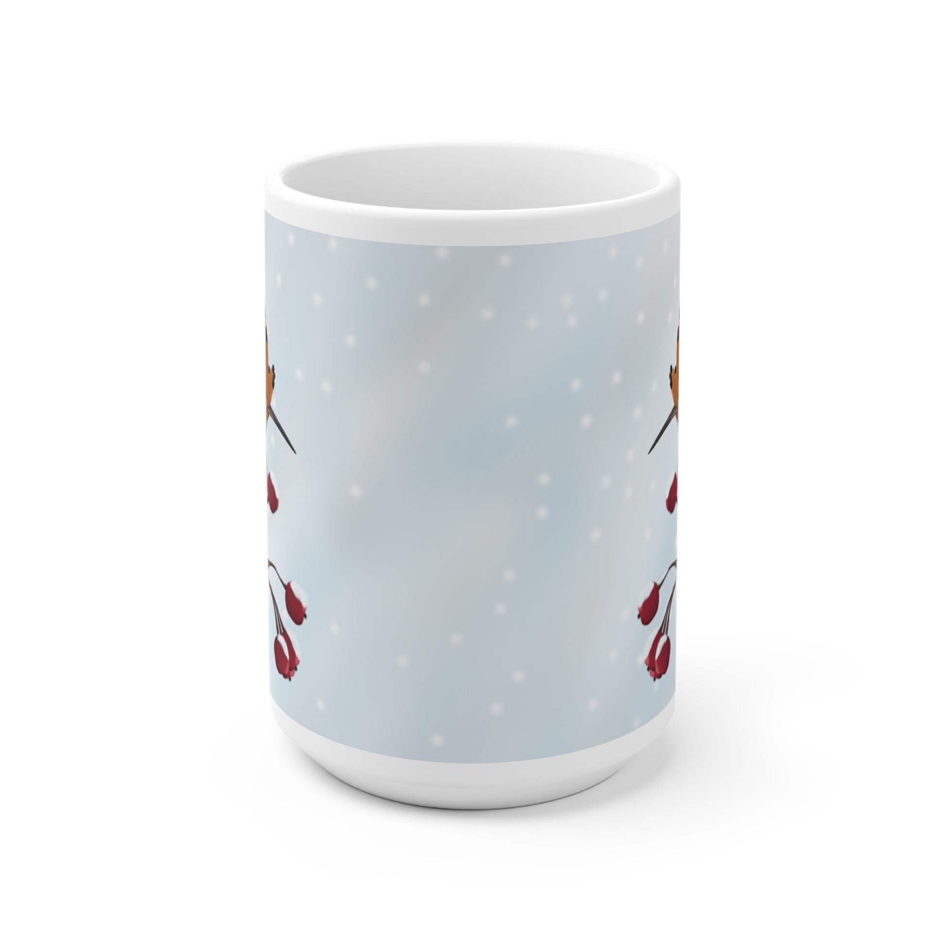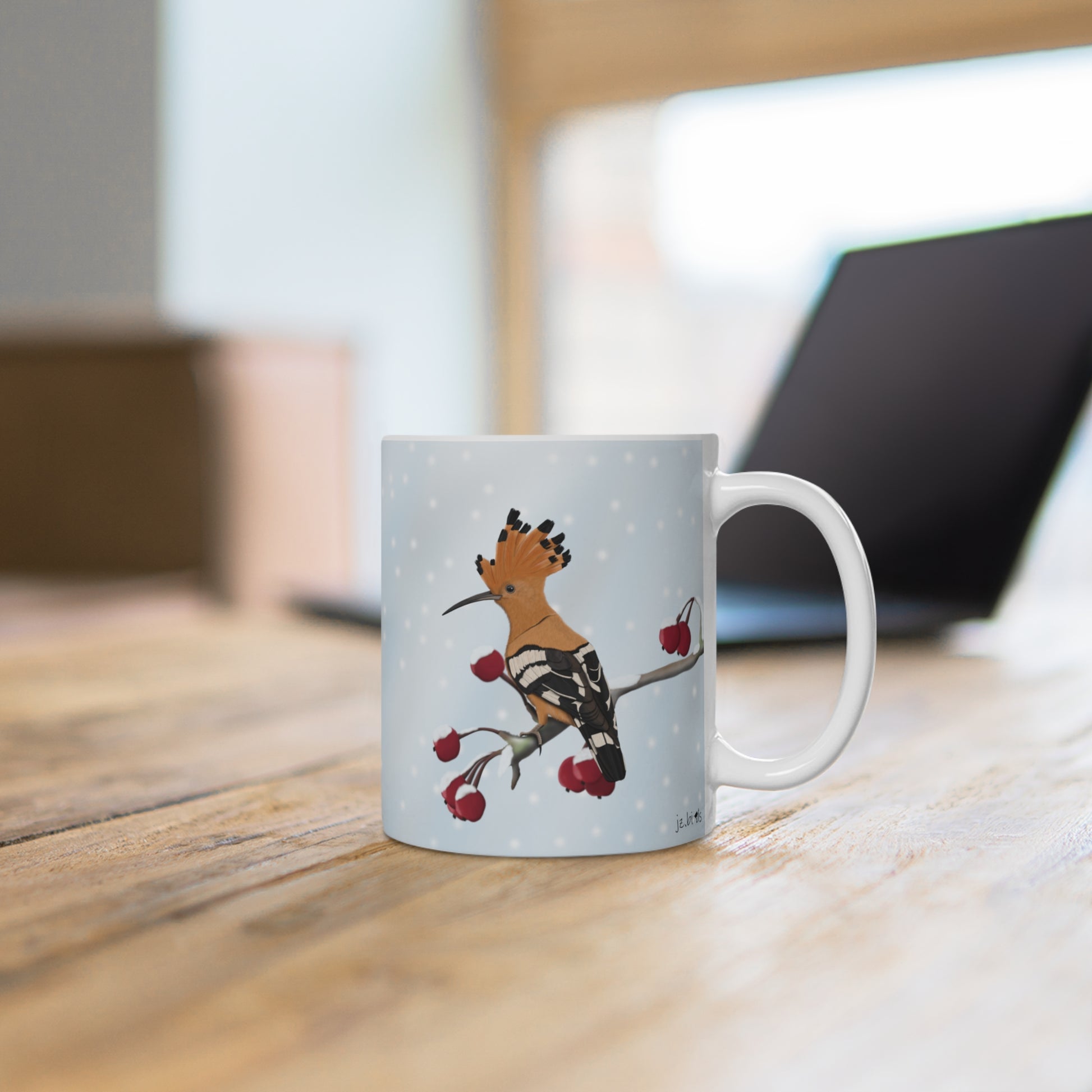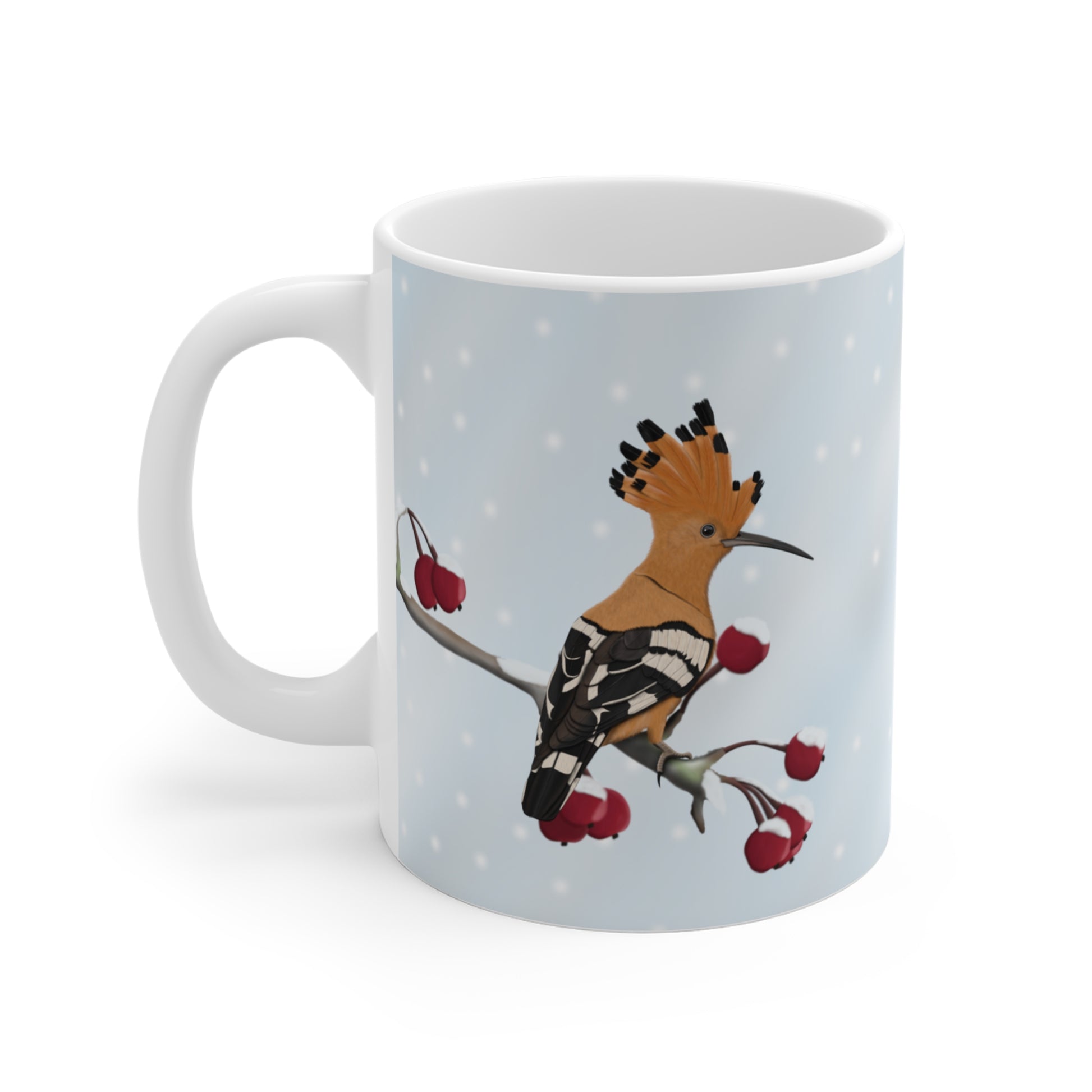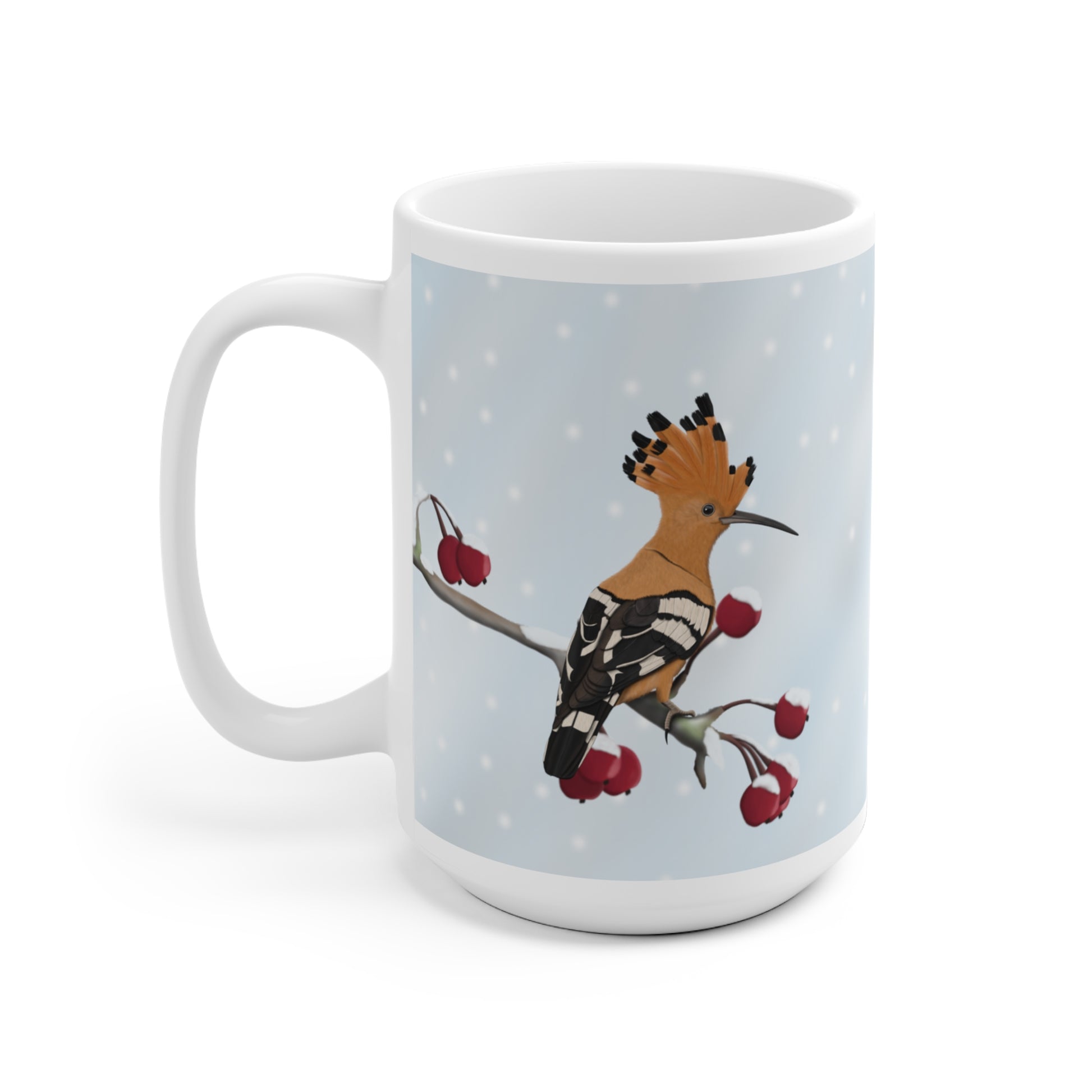 Unsere Wiedehopf auf einem Ast im Winter Vogel Tasse ist perfekt für Tee und heiße Schokolade. Die klassische Tasse ist in den Größen 11 oz. (0,33l) und 15 oz. (0,44l) erhältlich und eignet sich hervorragend als Weihnachtsgeschenk für alle Vogelfreunde.