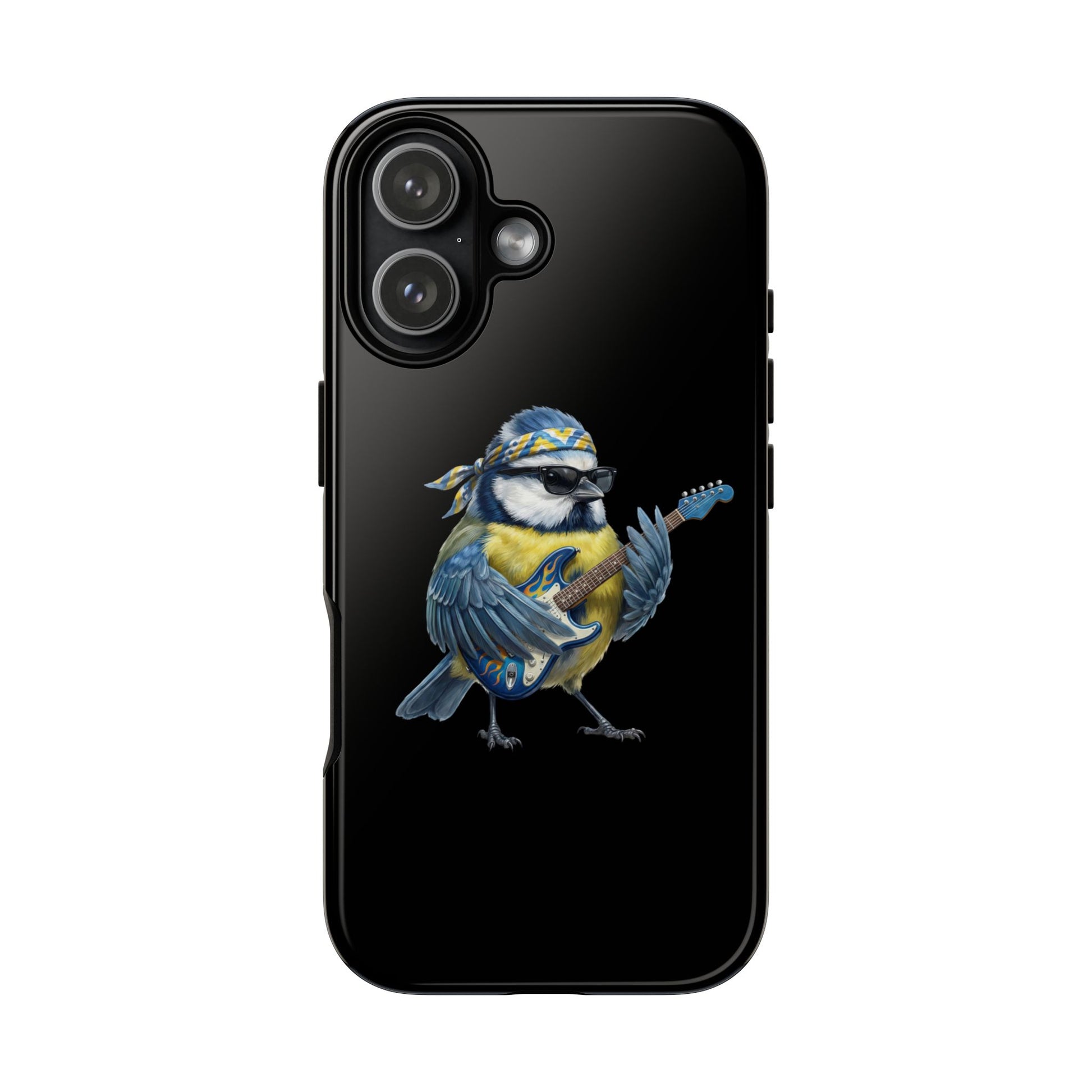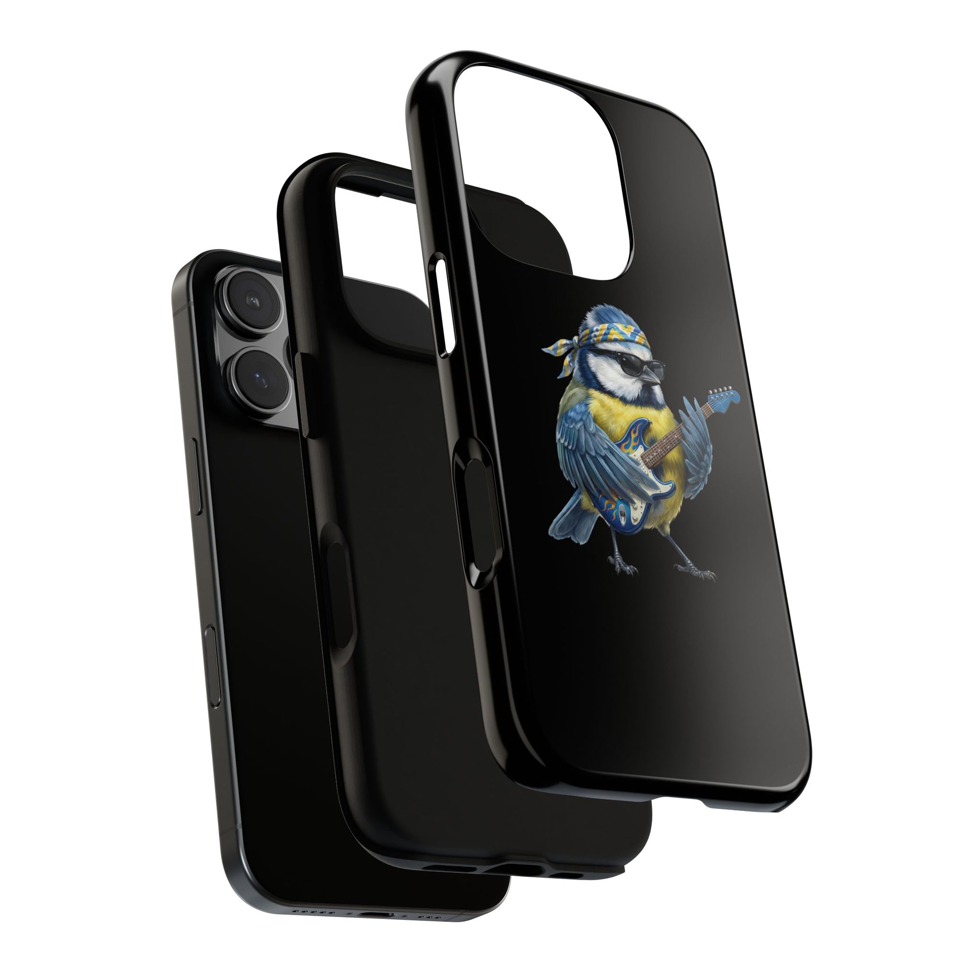 Blaumeise mit Gitarre Premium Handyhülle – Doppelt Geschützt & Rundum Bedruckt Schwarz