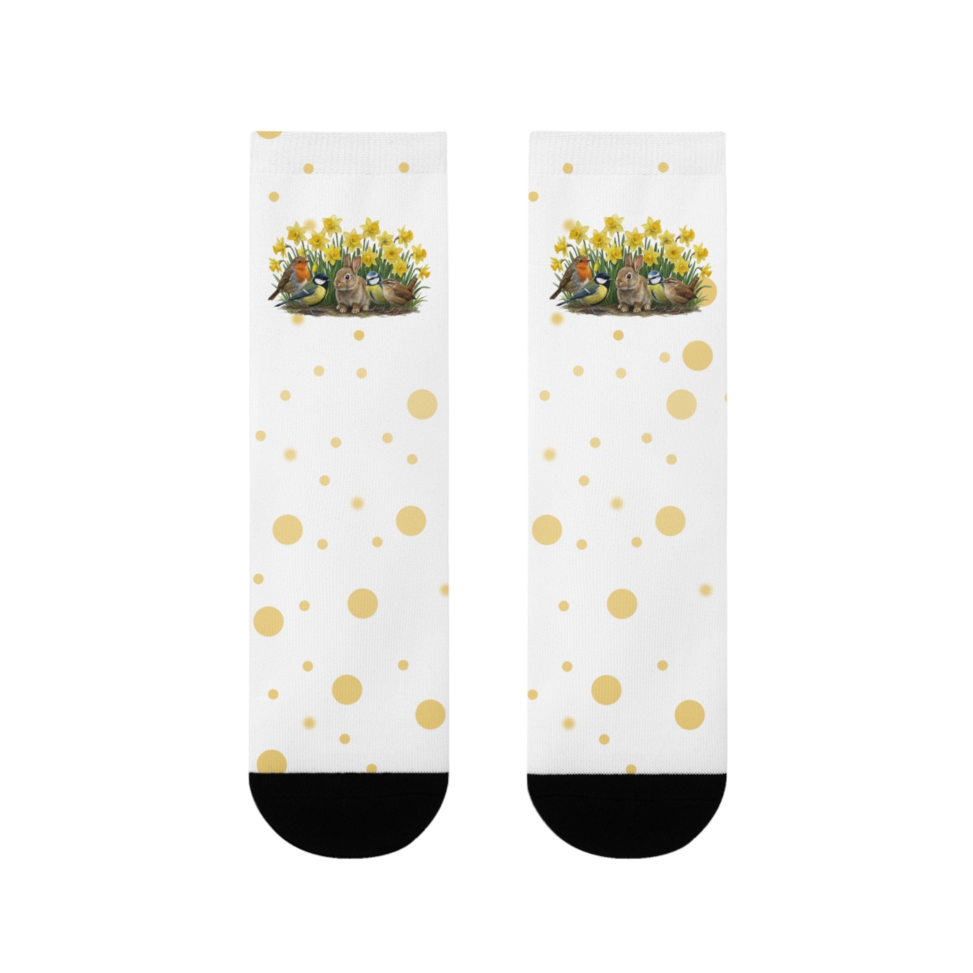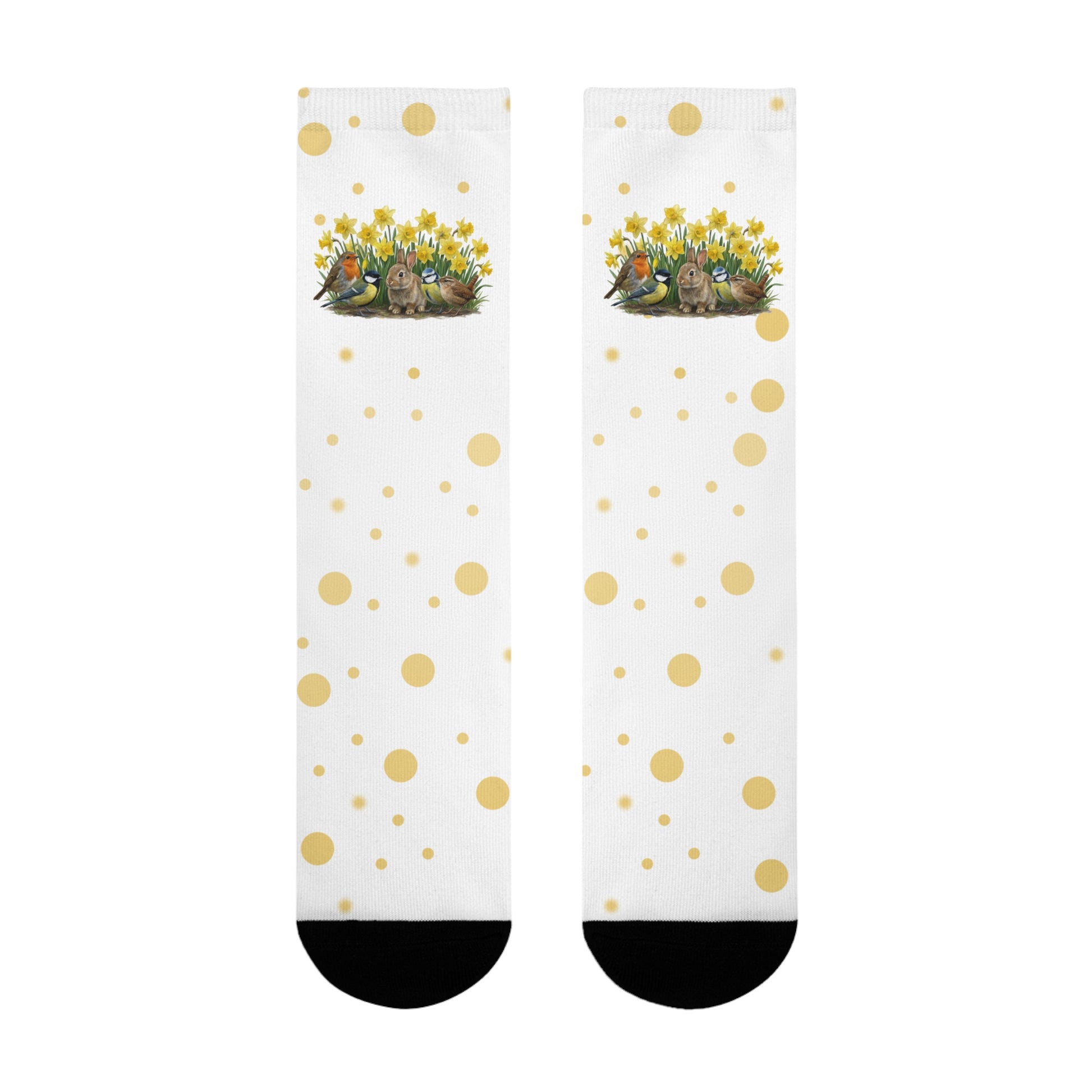 Vogel-Socken mit Osterglocken – Kaninchen, Rotkehlchen, Meisen & Zaunkönig