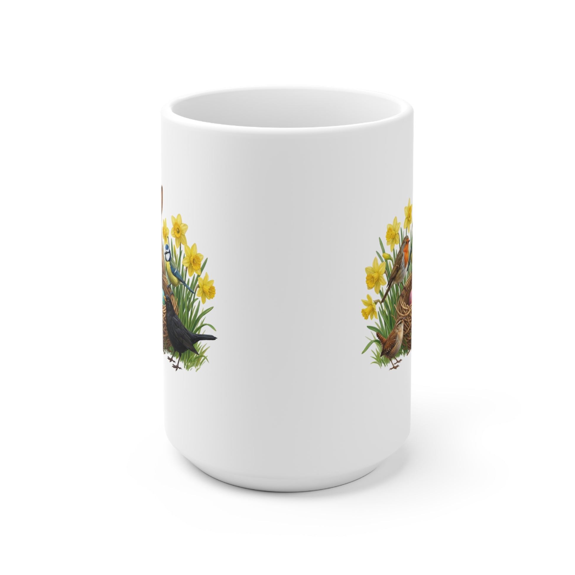 Genieße deinen Kaffee inmitten eines Blütenmeeres. Diese wunderschöne Keramiktasse zeigt realistisch gezeichnete Vögel und ein Kaninchen am Osternest, umgeben von zarten Osterglocken. Das Motiv wirkt auf der weißen Tasse wie handgemalt und bringt sofortige Frühlingsstimmung auf den Frühstückstisch. Perfekt als kleine Aufmerksamkeit zu Ostern oder einfach als neue Lieblingstasse für den Frühling. Die klassische Tasse ist in den Größen 11 oz. (0,33l) und 15 oz. (0,44l) erhältlich.