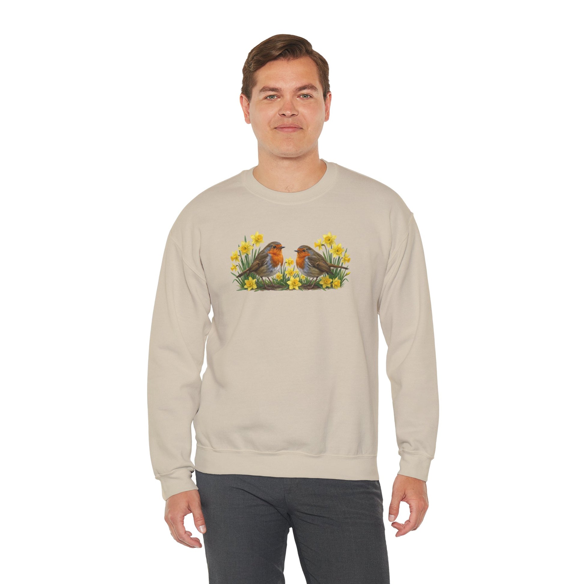 Rotkehlchen Oster-Sweatshirt Frühlingswiese – Singvögel in Osterglocken | Unisex Pullover