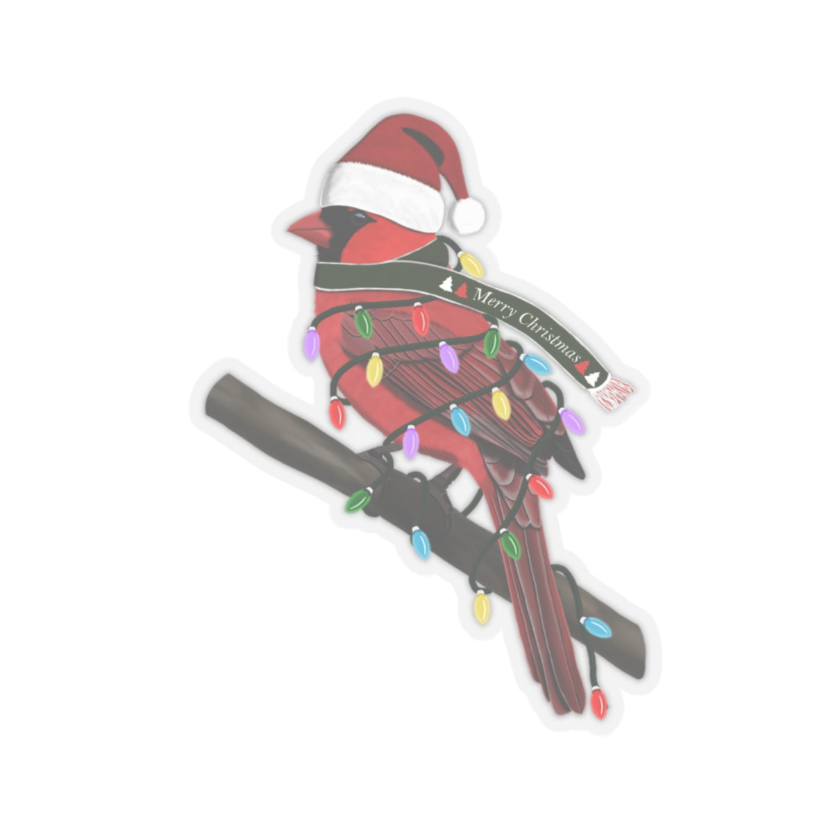 フェアリーライトとサンタクロースの帽子とスカーフをつけたカーディナルのクリスマスバードステッカー