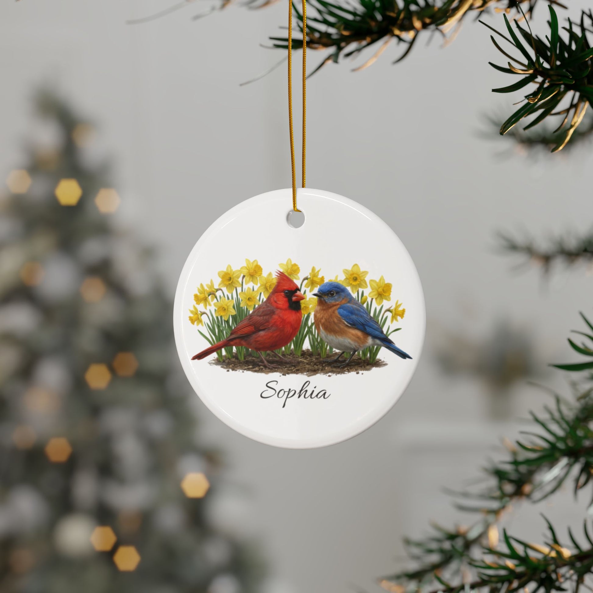 Upgrade Your Easter Basket with a Timeless Keepsake 🐰✨ Forget disposable paper tags—make this year’s Easter basket truly special with a personalized ceramic ornament. This high-quality piece features a whimsical Cardinal and Bluebird nestled among bright yellow daffodils, with your chosen name elegantly printed below the artwork.