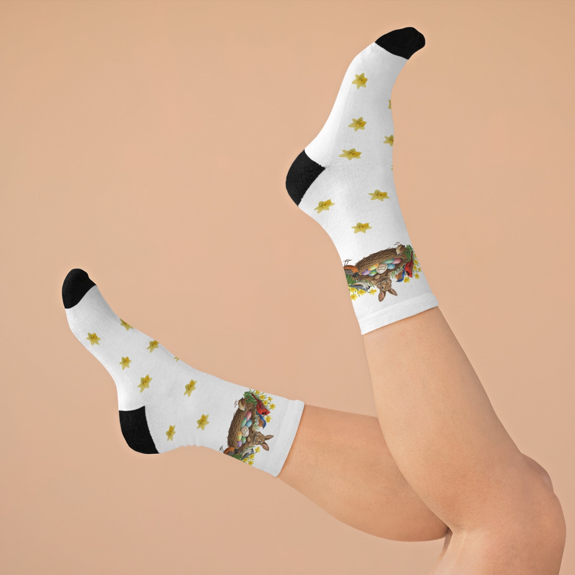 Spring Rabbit & Cardinal, Bluebird, Robin Easter Eggs – Daffodil Pattern Easter Socks