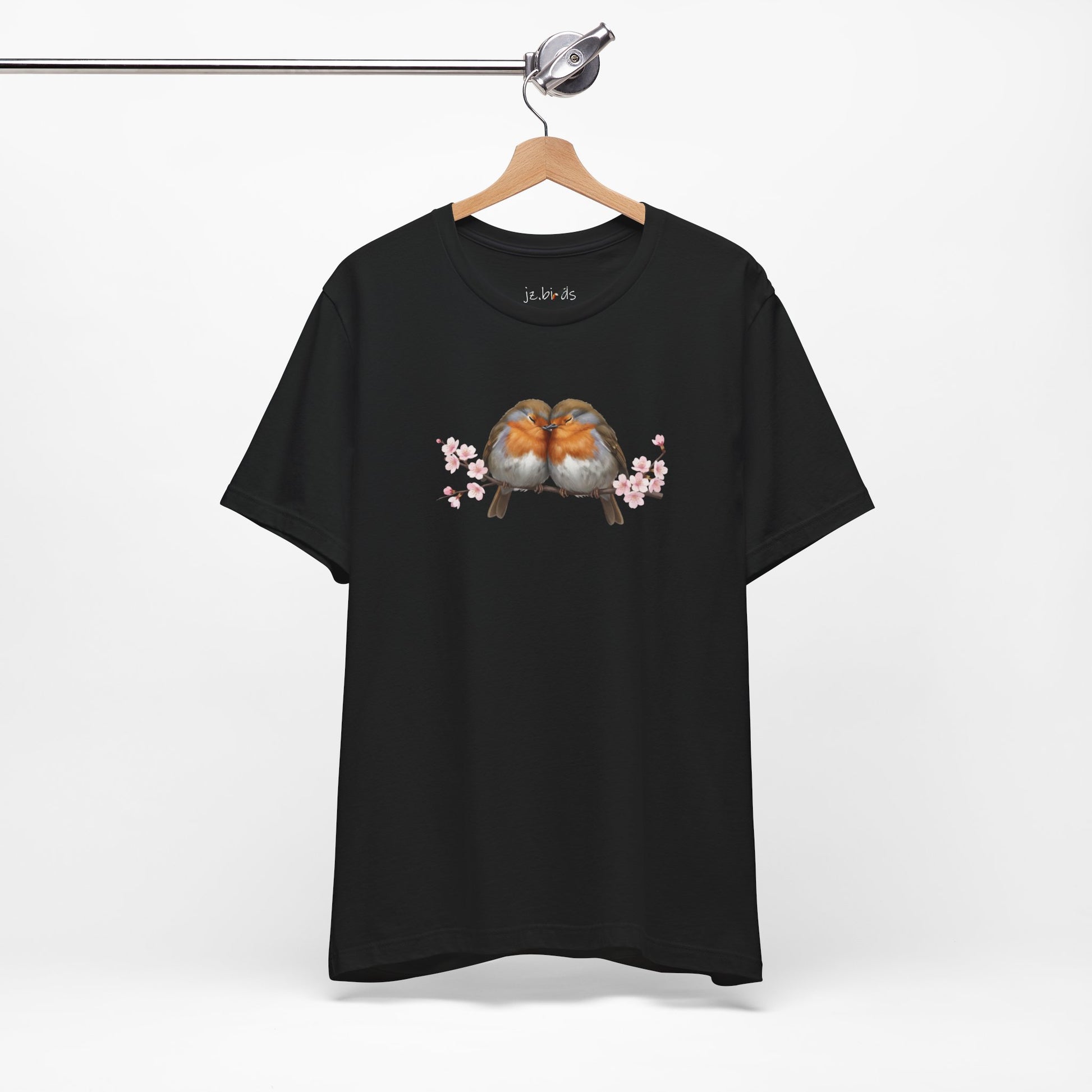 Wear the beauty of spring. This isn't just a t-shirt; it's a piece of wearable art. The detailed illustration of two robins cuddling in a cherry blossom tree is a true conversation starter and brings a smile to everyone's face.