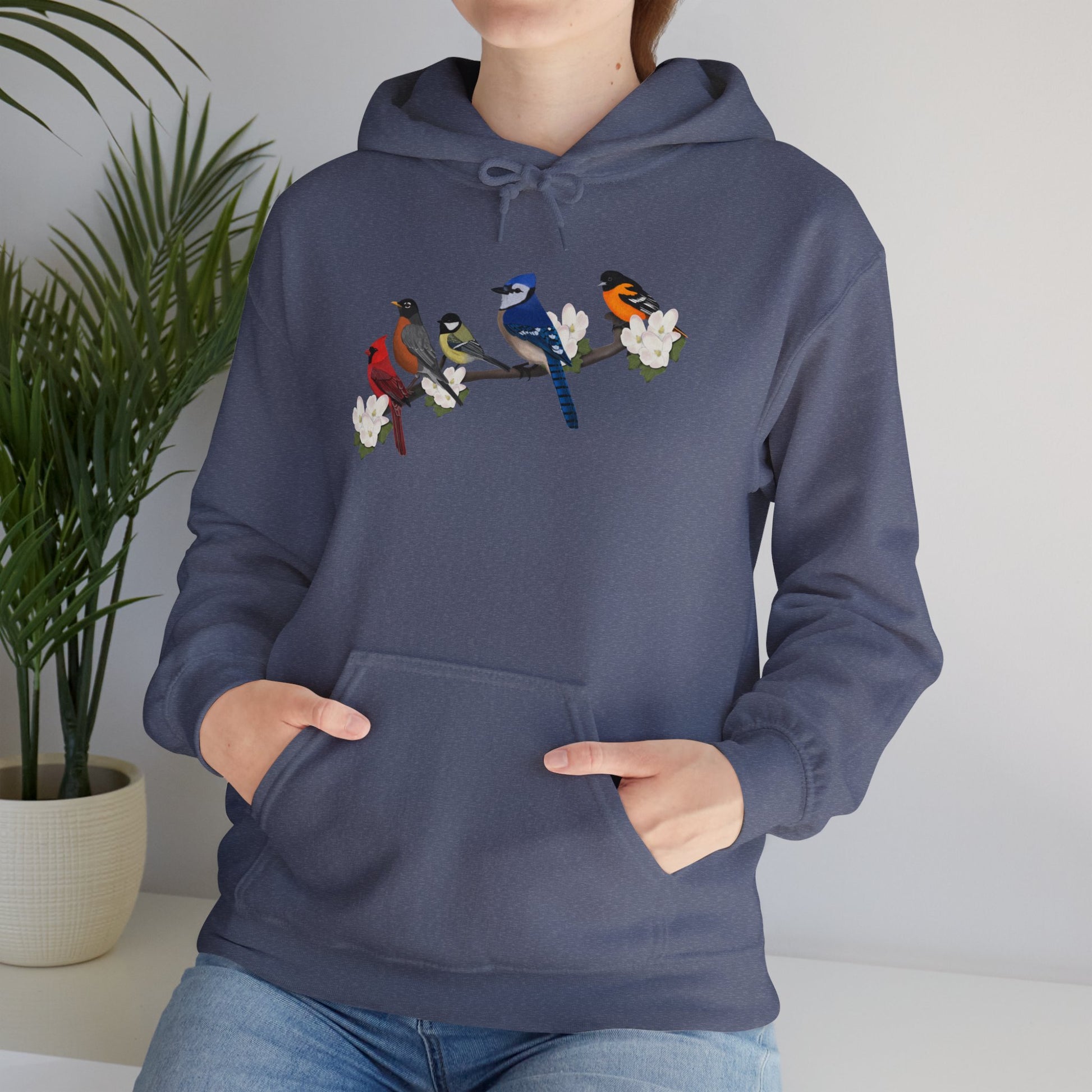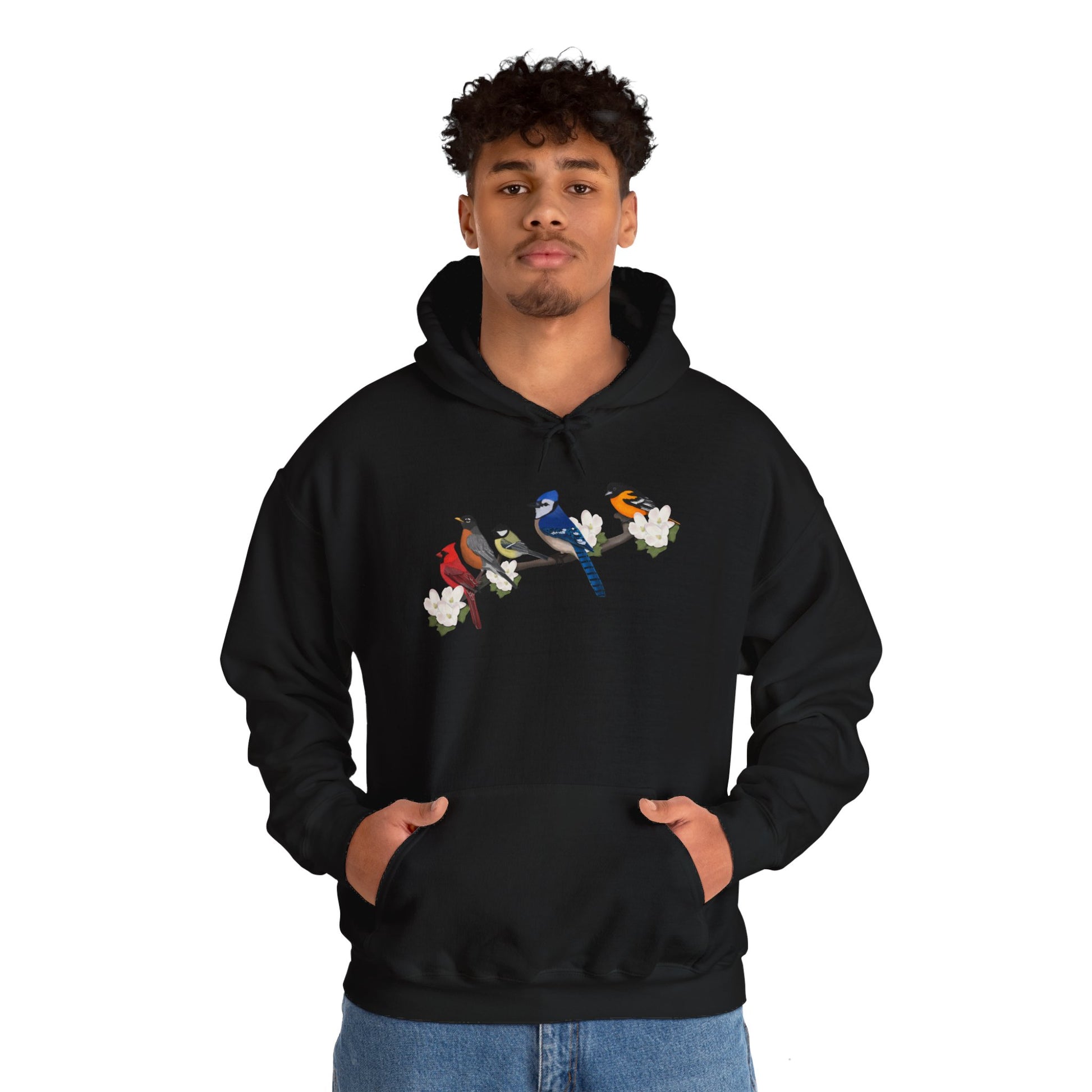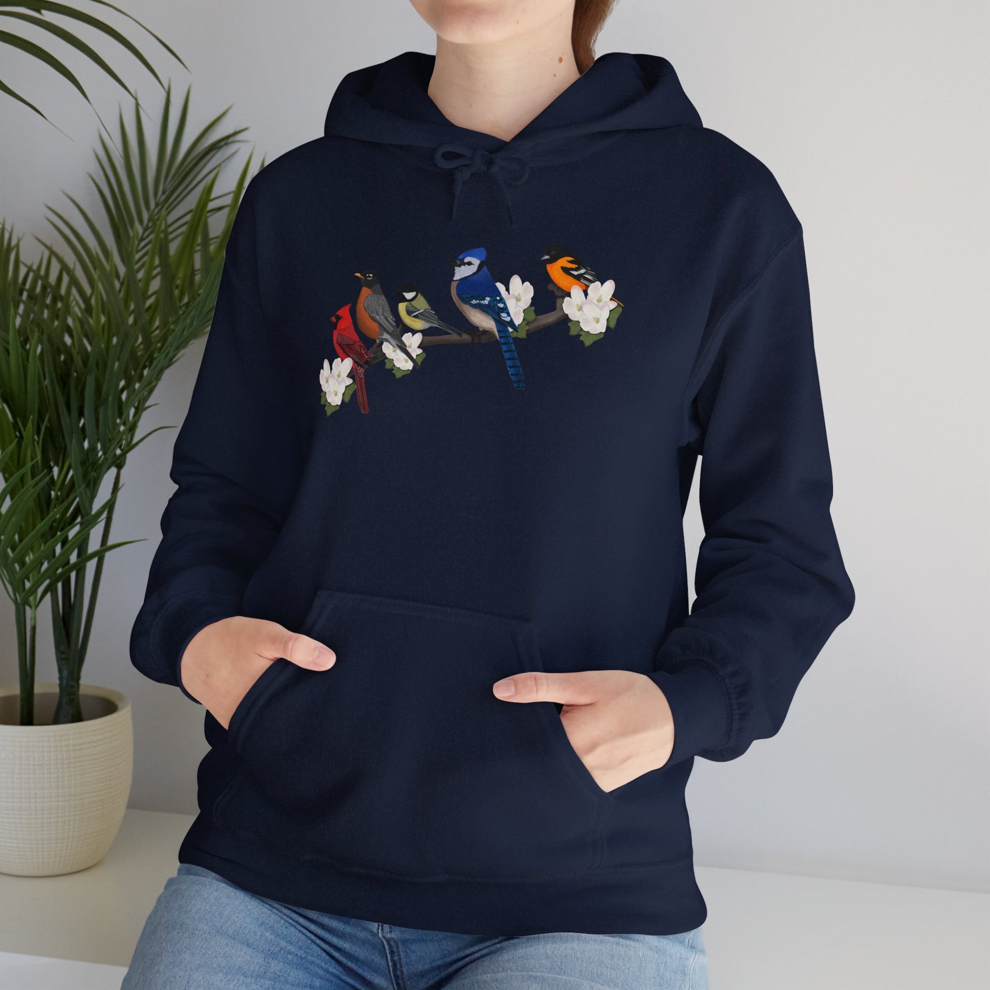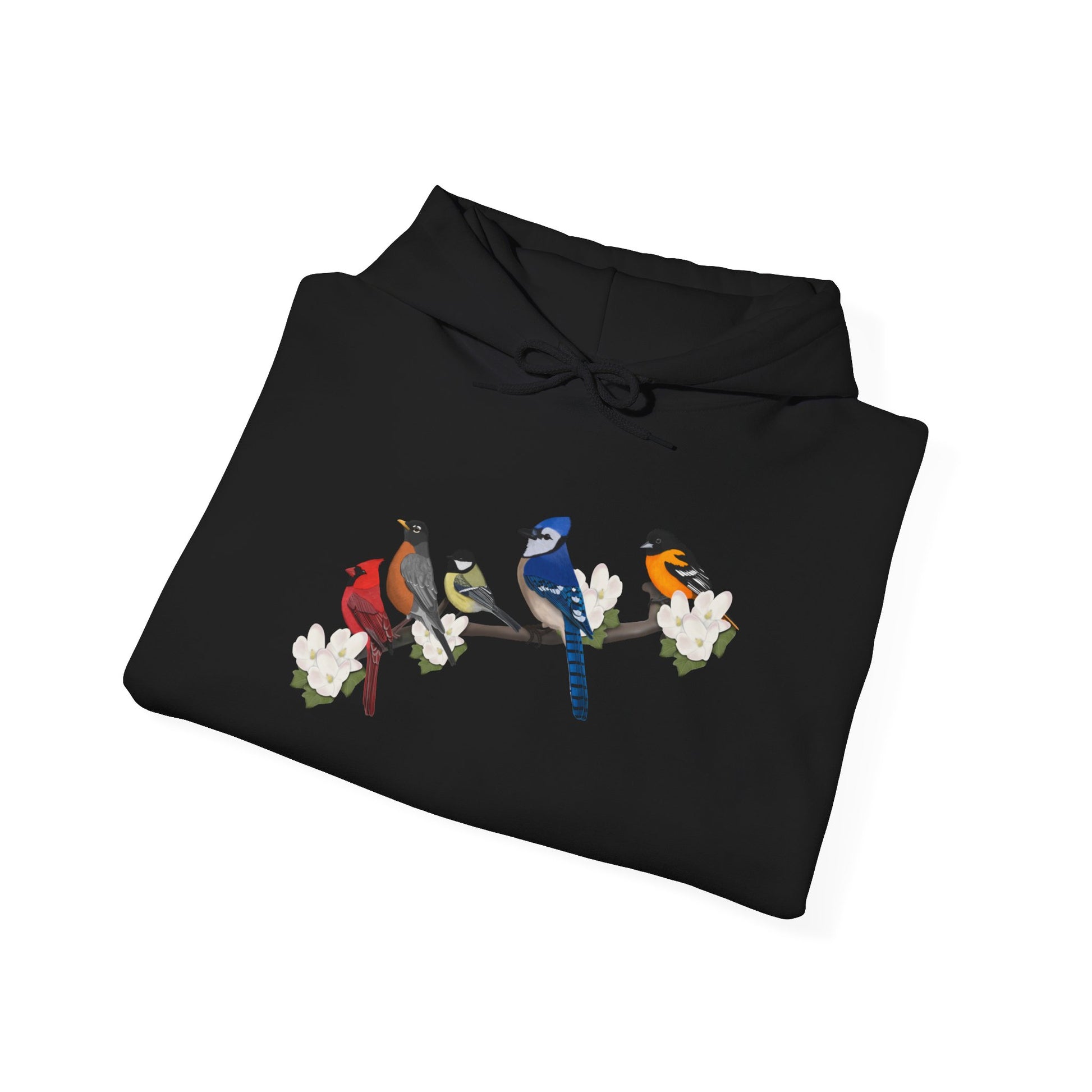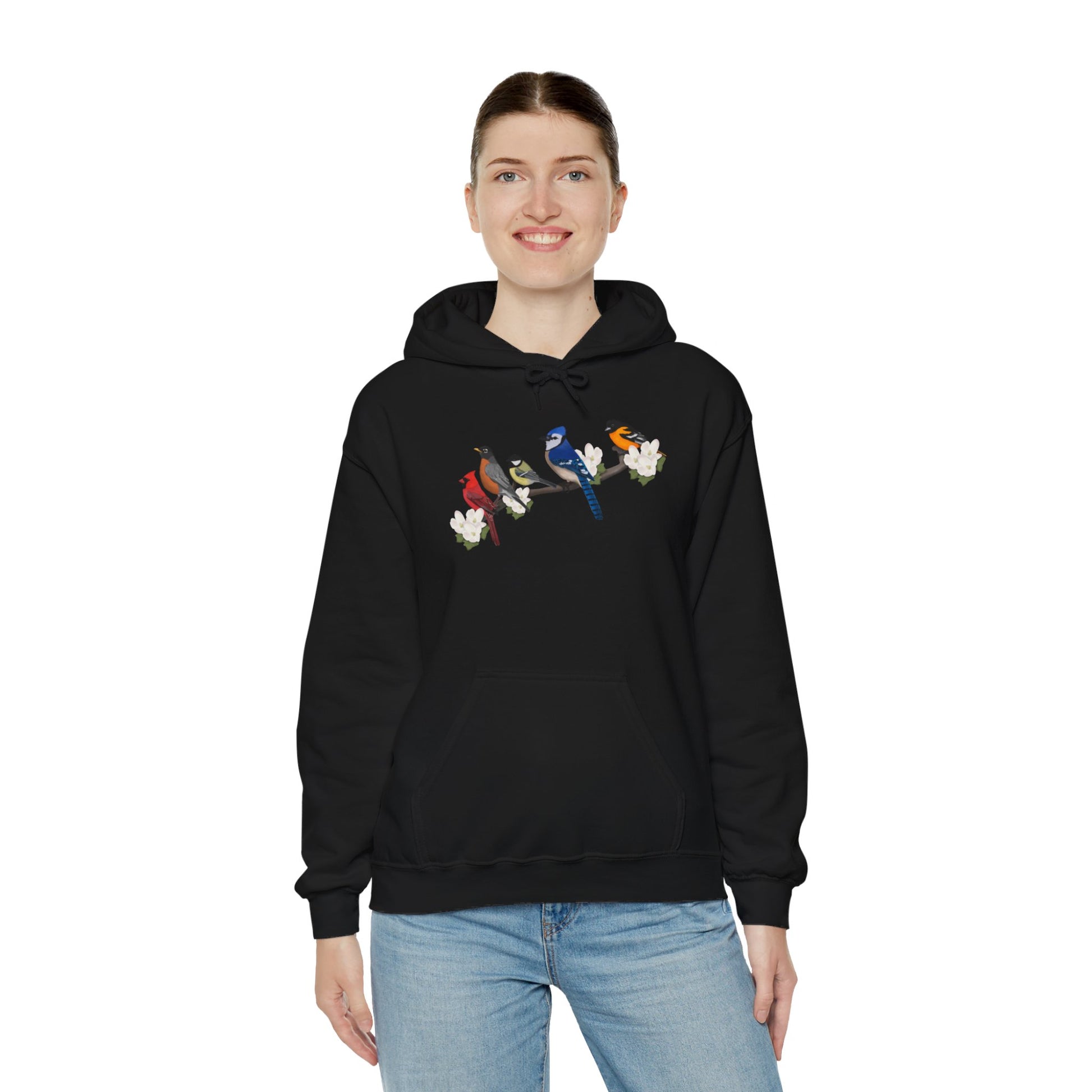 Backyard Birds on a Branch Blue Jay Cardinal Robin Chickadee Oriole Birdwatcher Hoodie