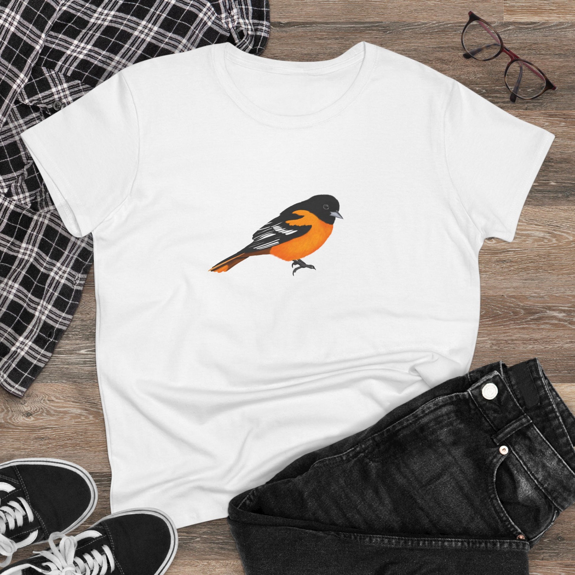 This Baltimore Oriole bird design women's t-shirt is perfect for birdwatchers, birding enthusiasts, and bird lovers. It offers a casual and nature-inspired vibe, making it great for everyday wear or outdoor activities. Ideal for women who appreciate wildlife and nature-themed clothing. Relevant for birdwatching trips, nature walks, Earth Day, and wildlife conservation events.