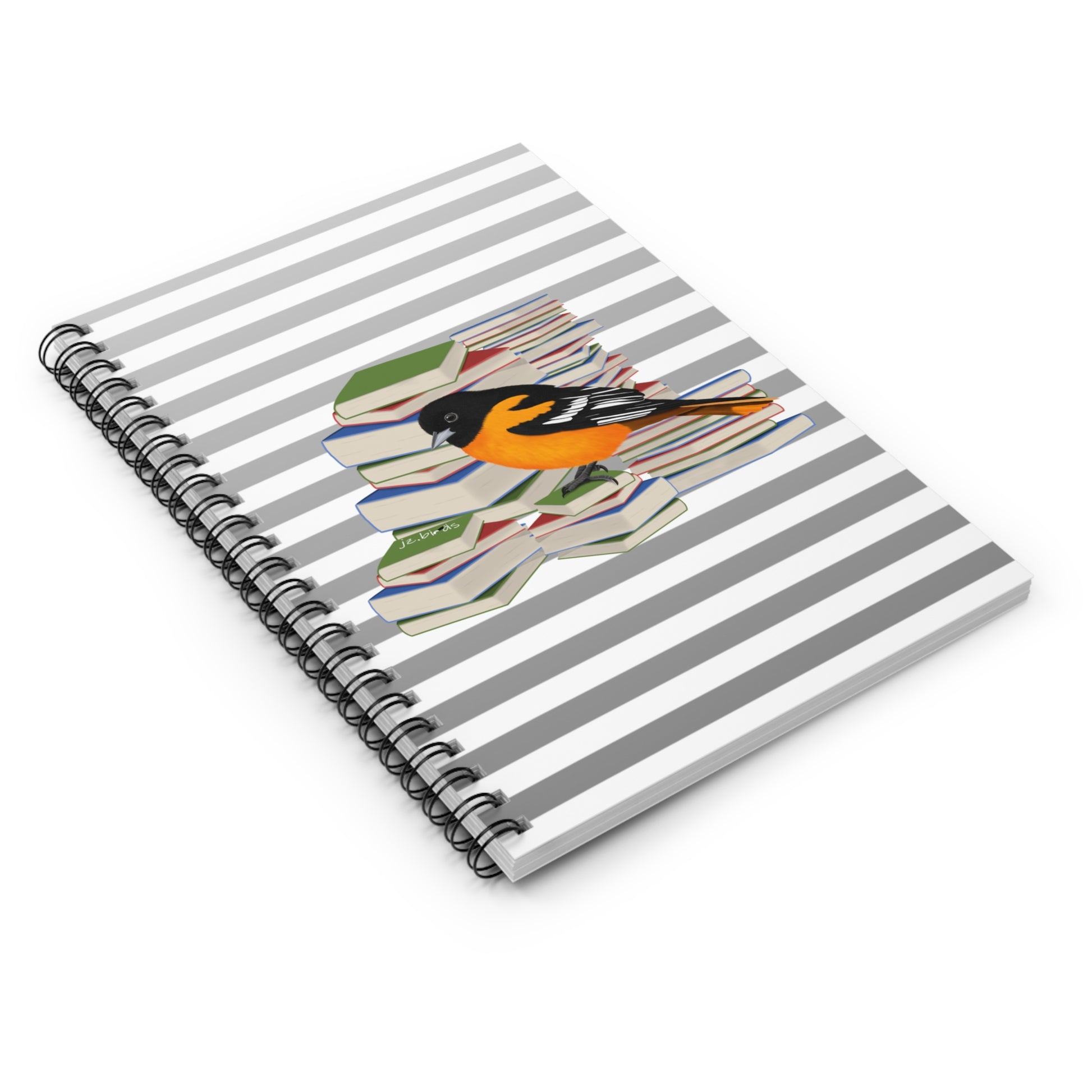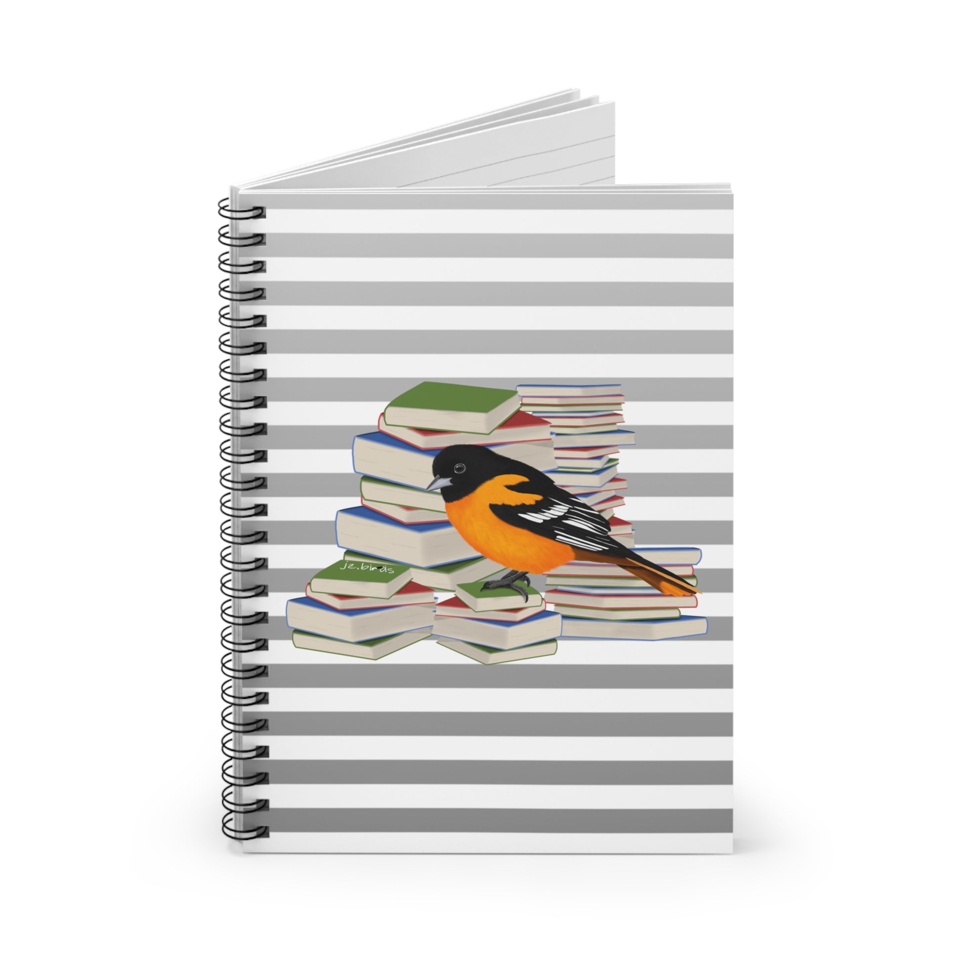 This Baltimore Oriole Bird with Books spiral notebook is the ultimate companion for bird lovers and bookworms alike. With a ruled line design, it provides a perfect platform for note-taking and jotting down observations on your feathered friends. Let this notebook capture every detail of your avian adventures.