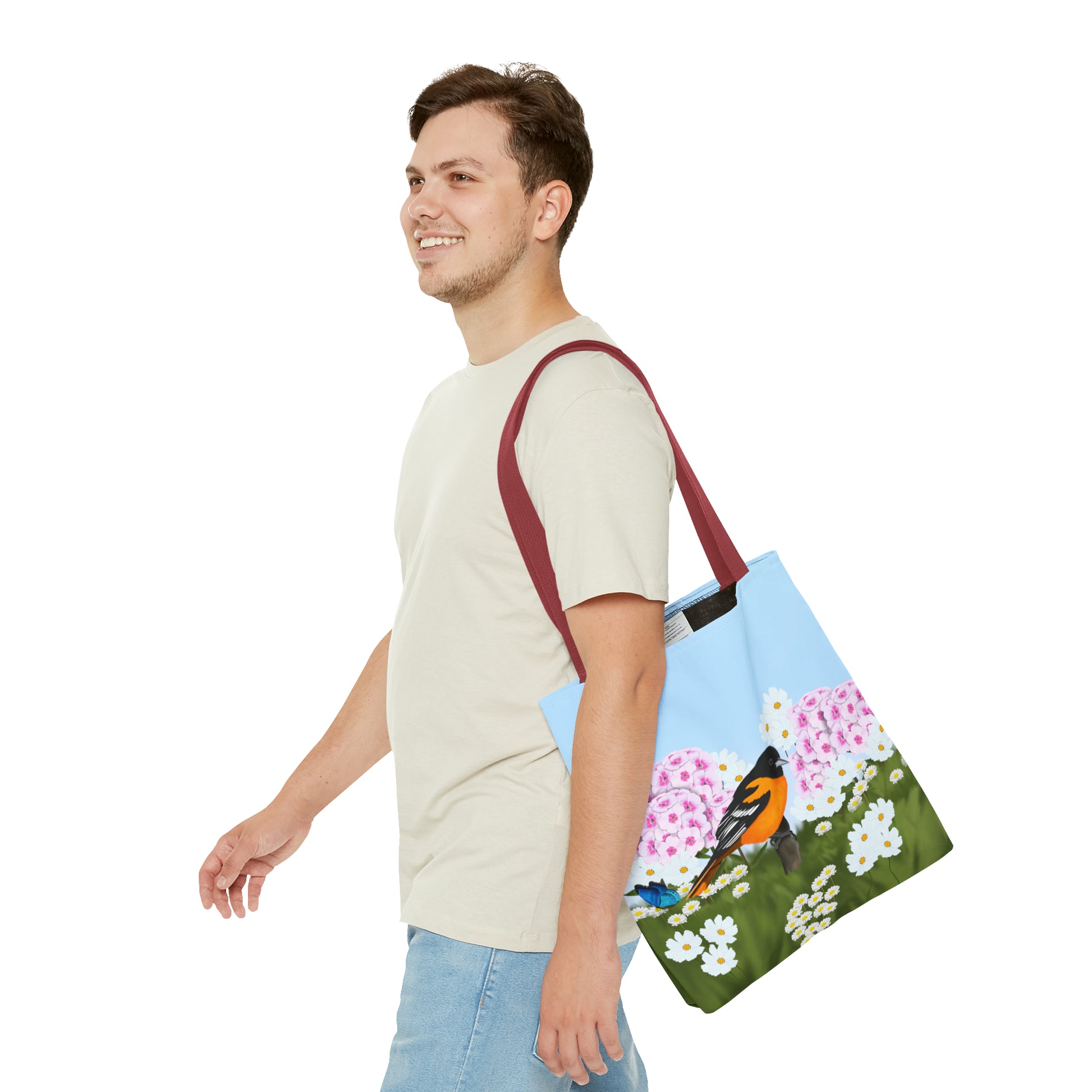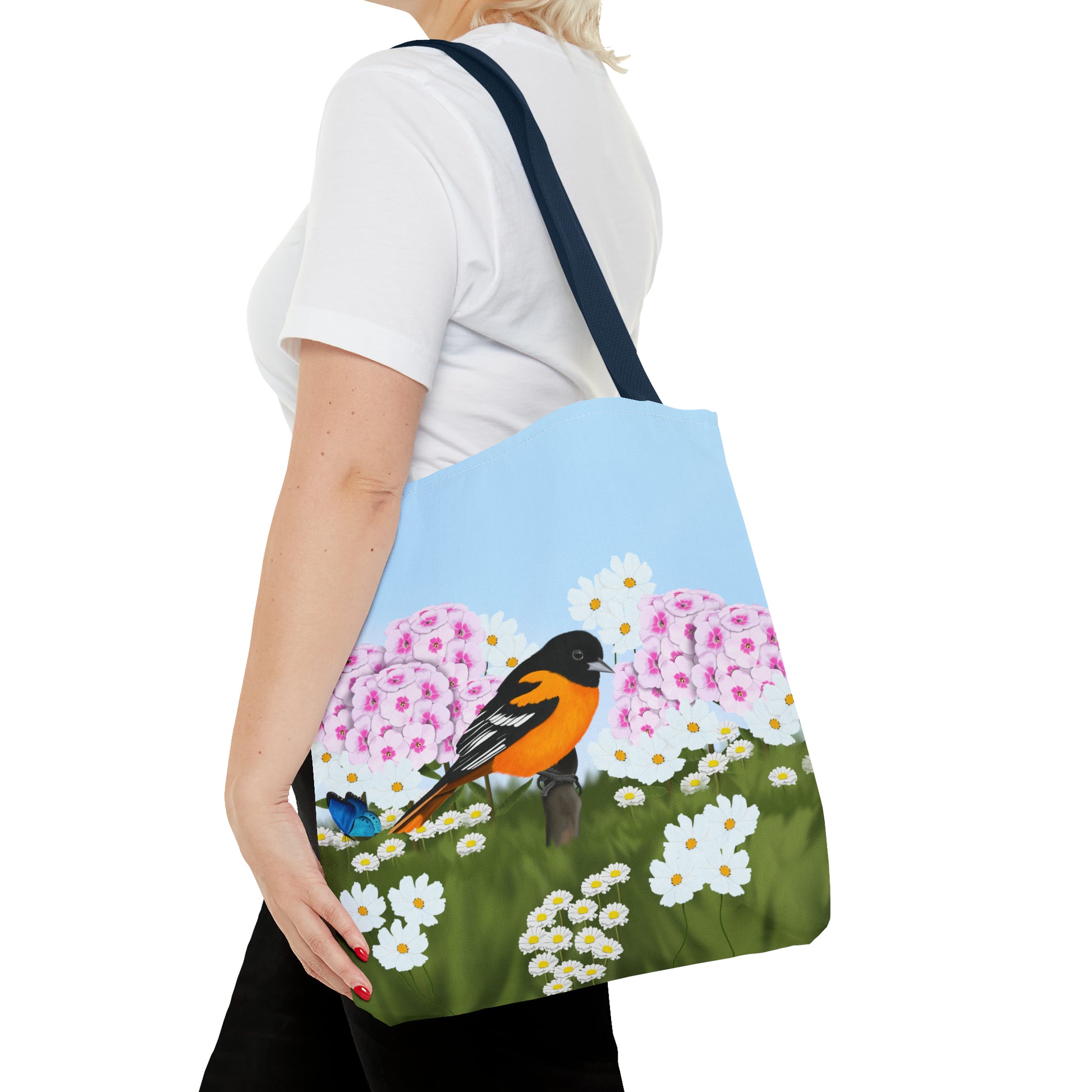 Baltimore Oriole in Summer Flowers Bird Tote Bag 16"x16"