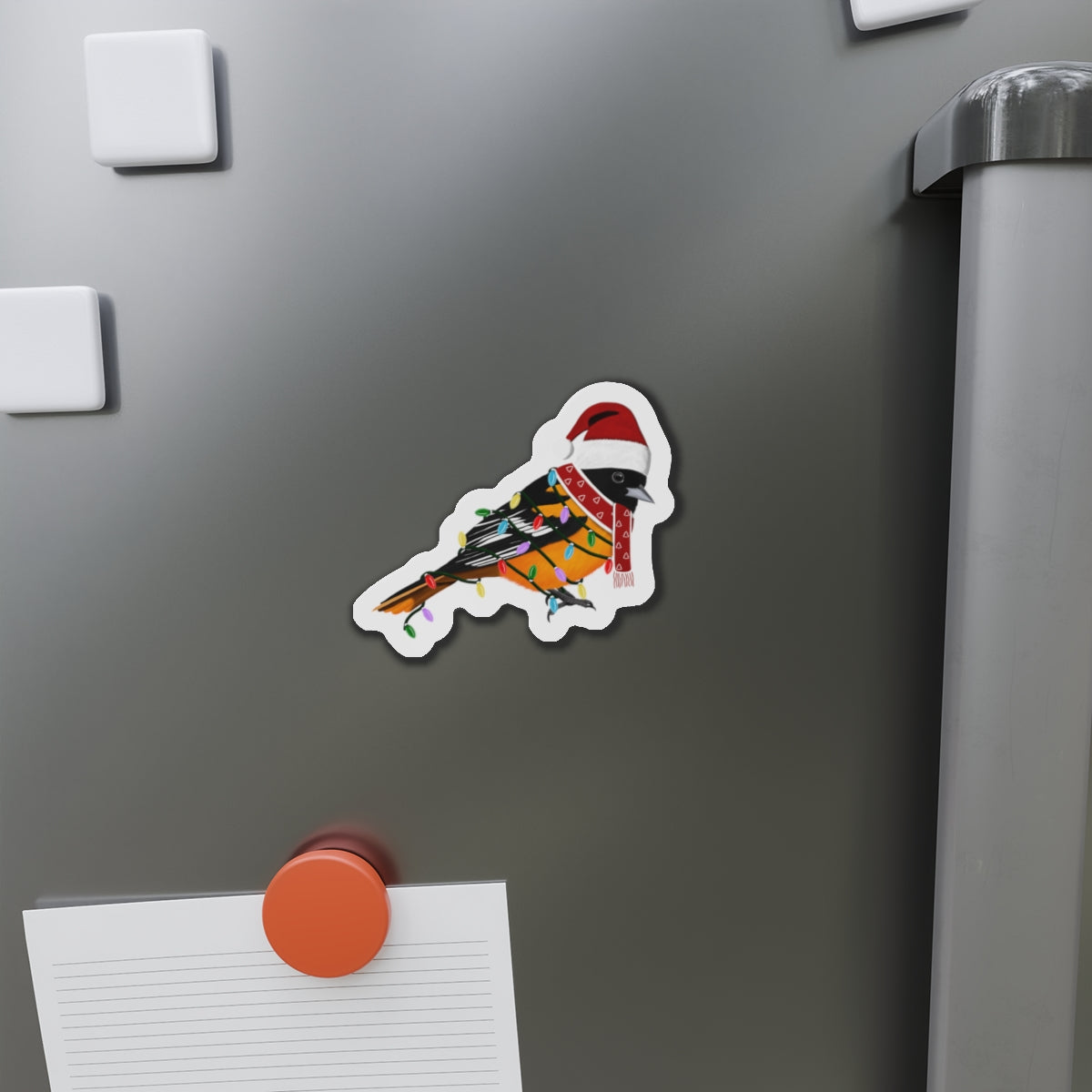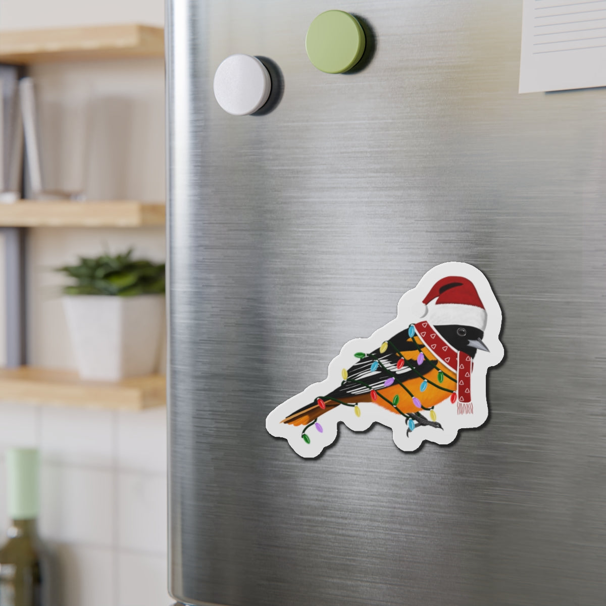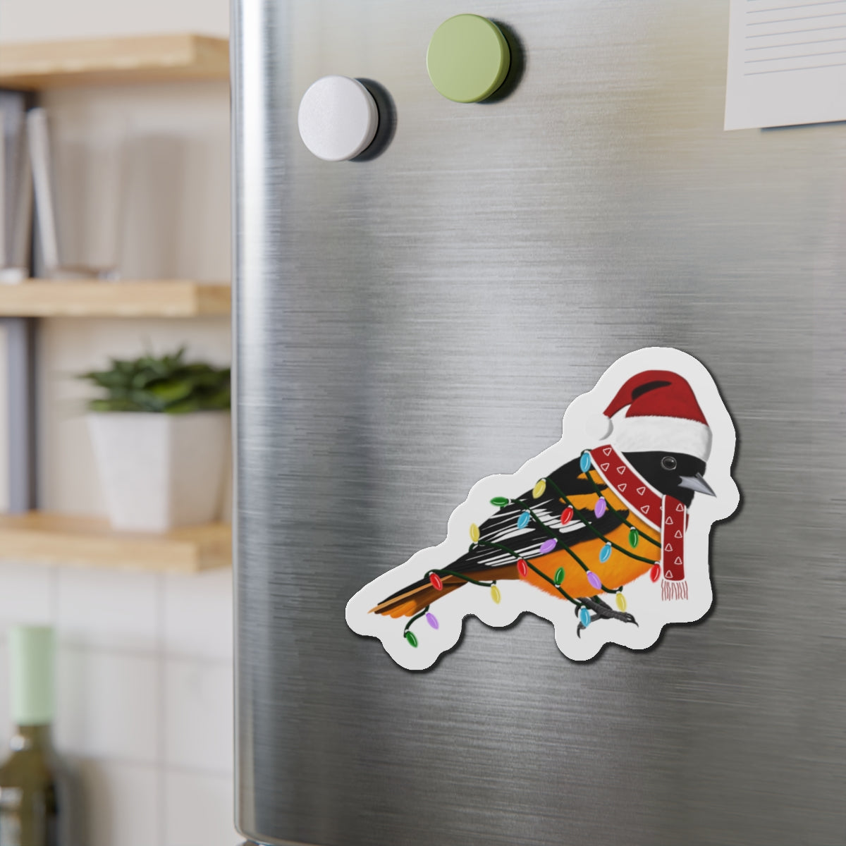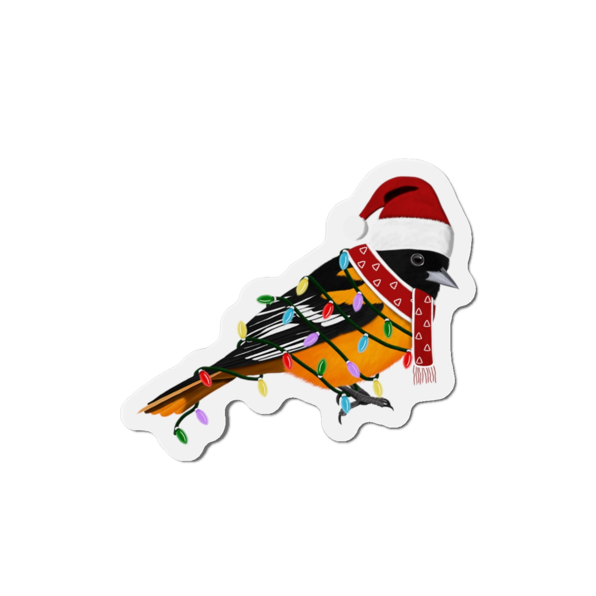 This magnet features a beautiful Baltimore Oriole with Fairy Lights Christmas bird illustration. It serves as both a useful tool and a lovely decoration for any home or office space. Made with high-quality materials, it is sure to add a touch of elegance to your Christmas decor.