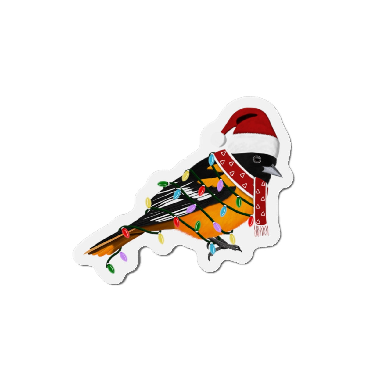 This magnet features a beautiful Baltimore Oriole with Fairy Lights Christmas bird illustration. It serves as both a useful tool and a lovely decoration for any home or office space. Made with high-quality materials, it is sure to add a touch of elegance to your Christmas decor.
