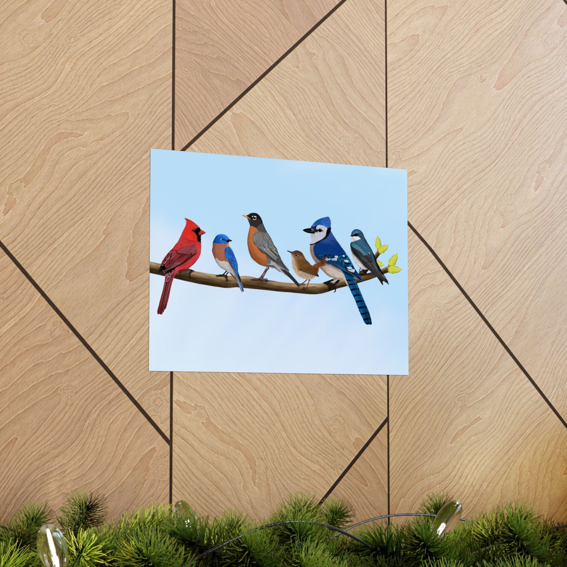Enhance your home decor with our high-quality matte poster featuring beautiful backyard birds pn a branch. Crafted with precision and detail, our Robin Blue Jay Bluebird Cardinal Wren Tree Swallow poster is perfect for bird lovers and brings a touch of nature indoors.