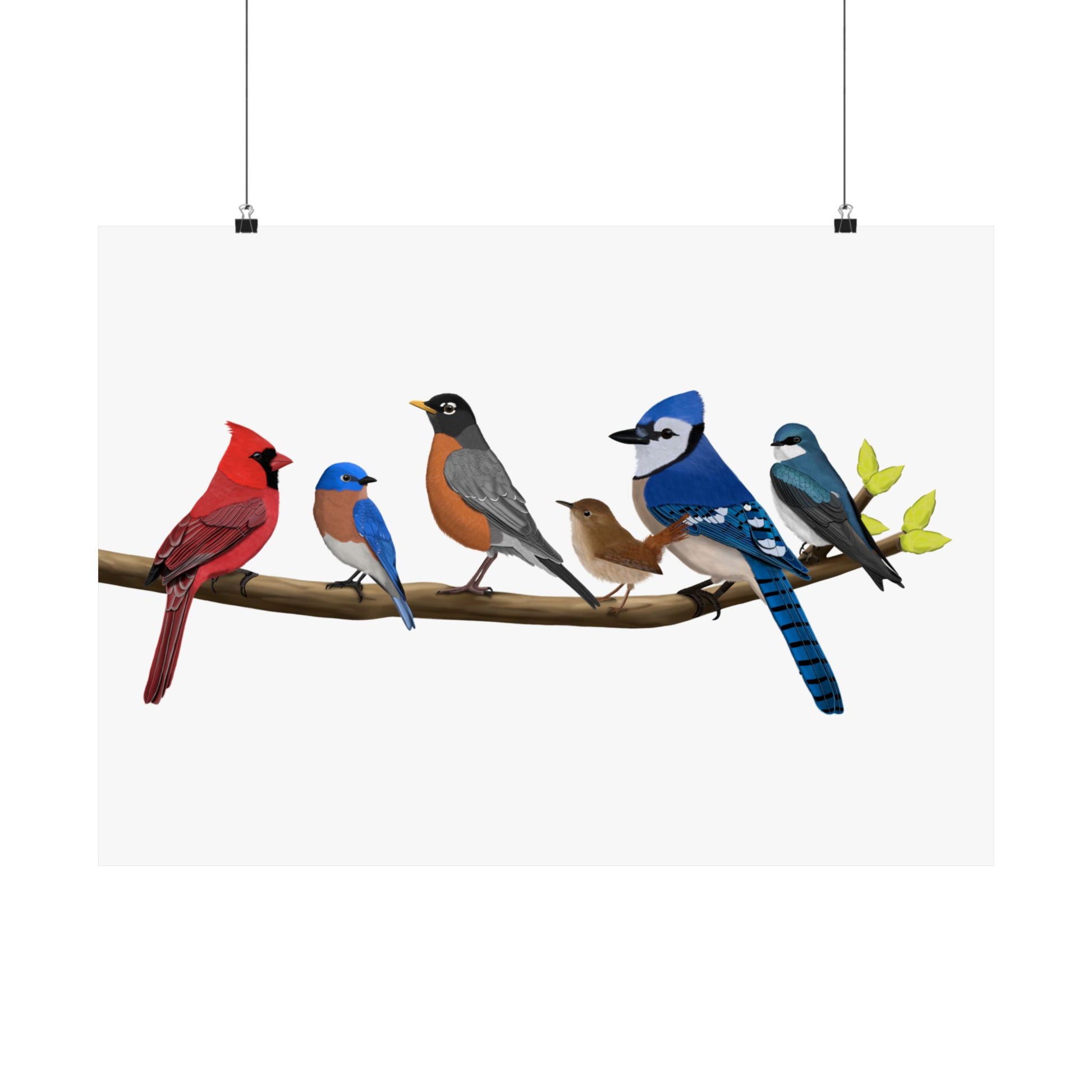 Enhance your home decor with our high-quality matte poster featuring beautiful backyard birds pn a branch. Crafted with precision and detail, our Robin Blue Jay Bluebird Cardinal Wren Tree Swallow poster is perfect for bird lovers and brings a touch of nature indoors.