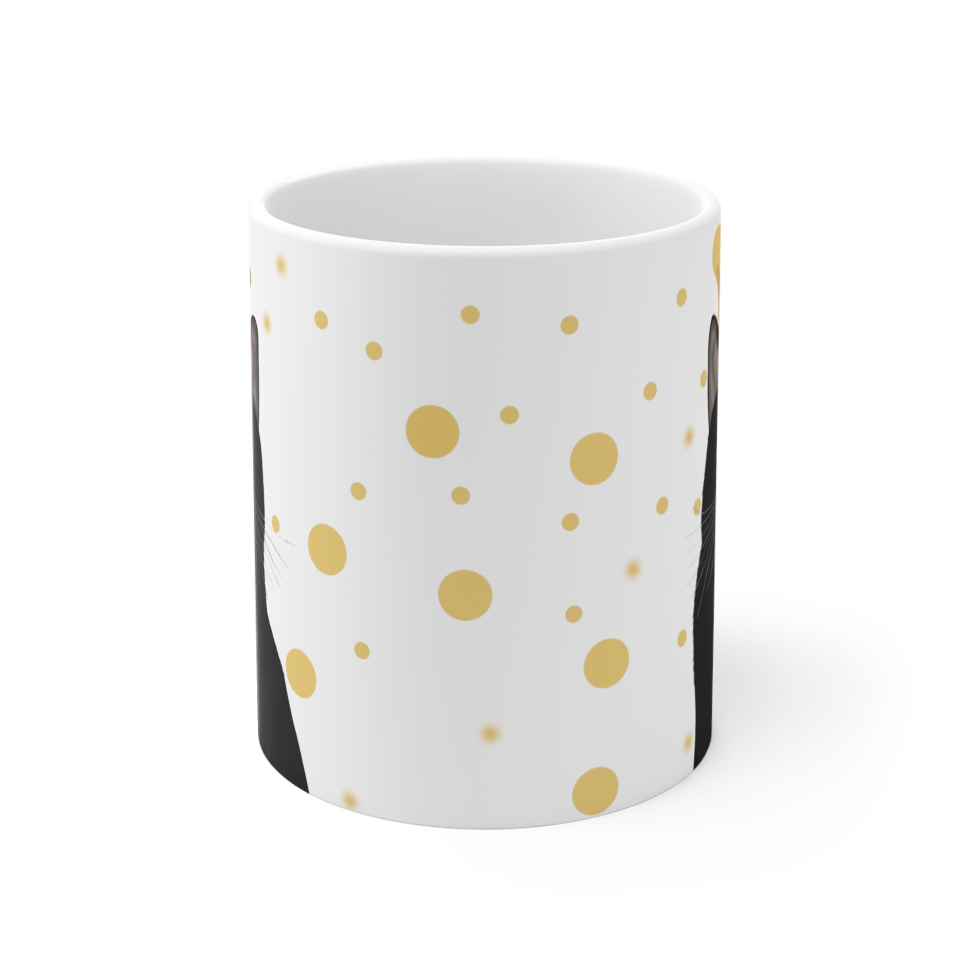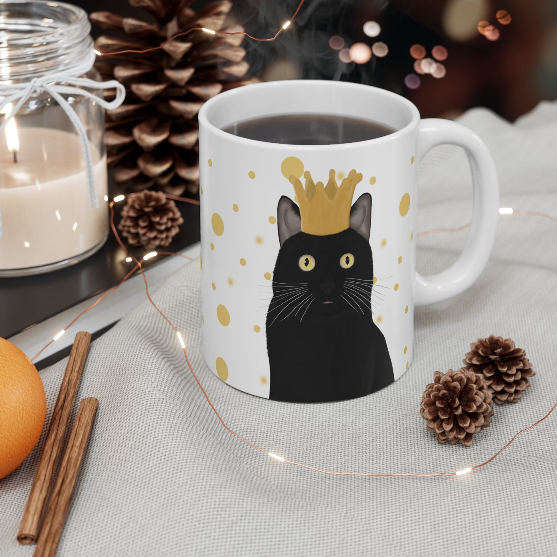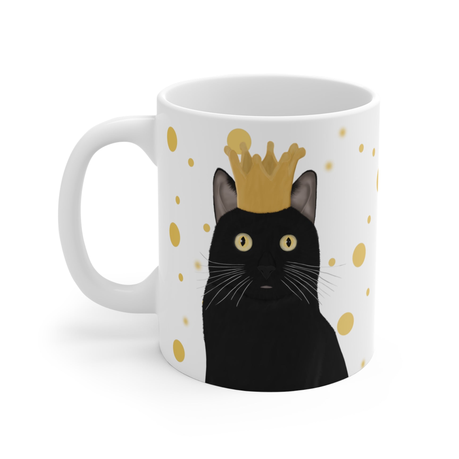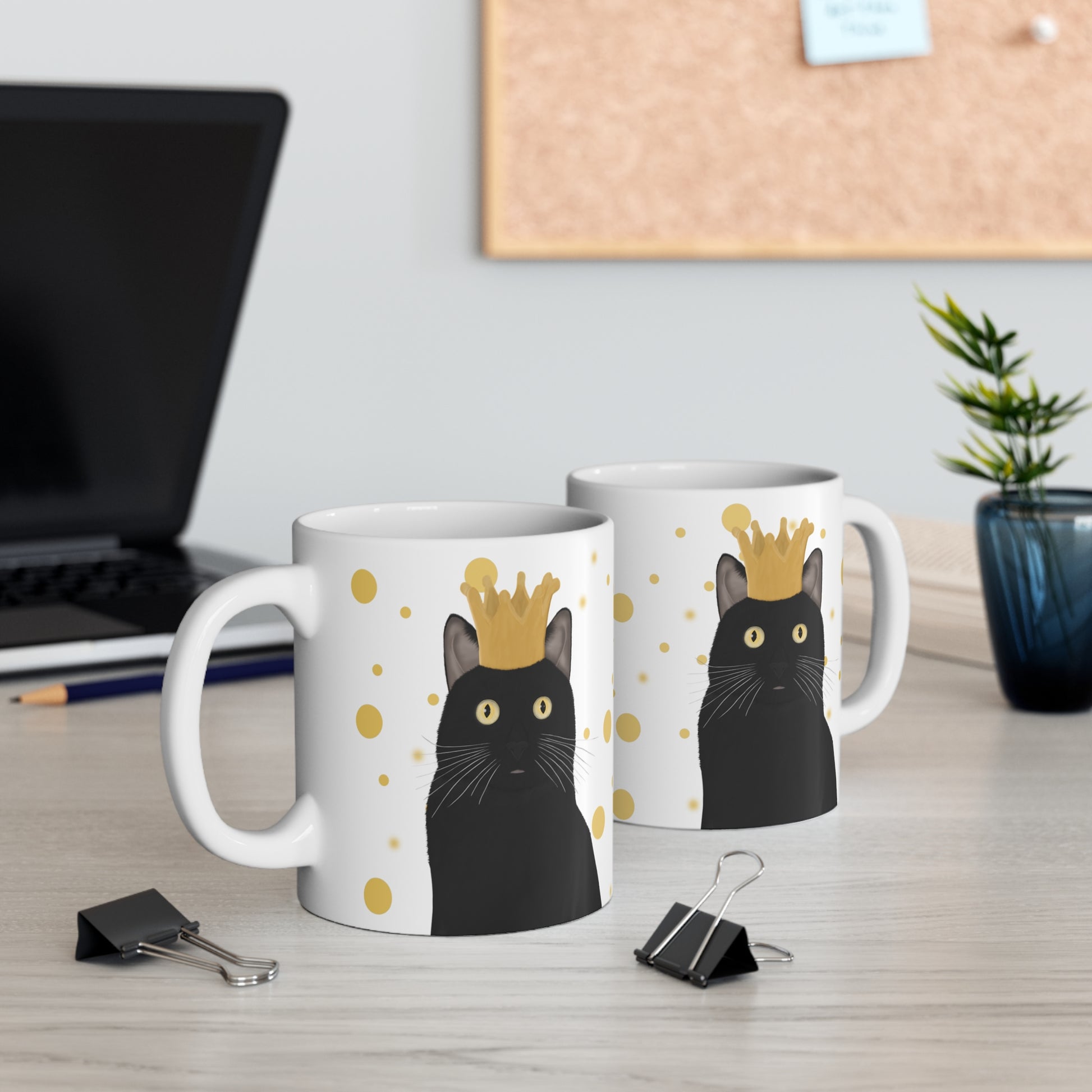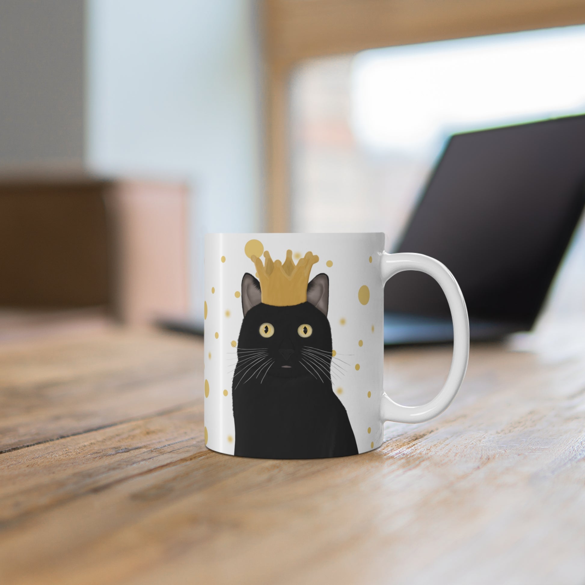 Black Cat with Crown Cat Lover Ceramic Mug White Golden Dots
