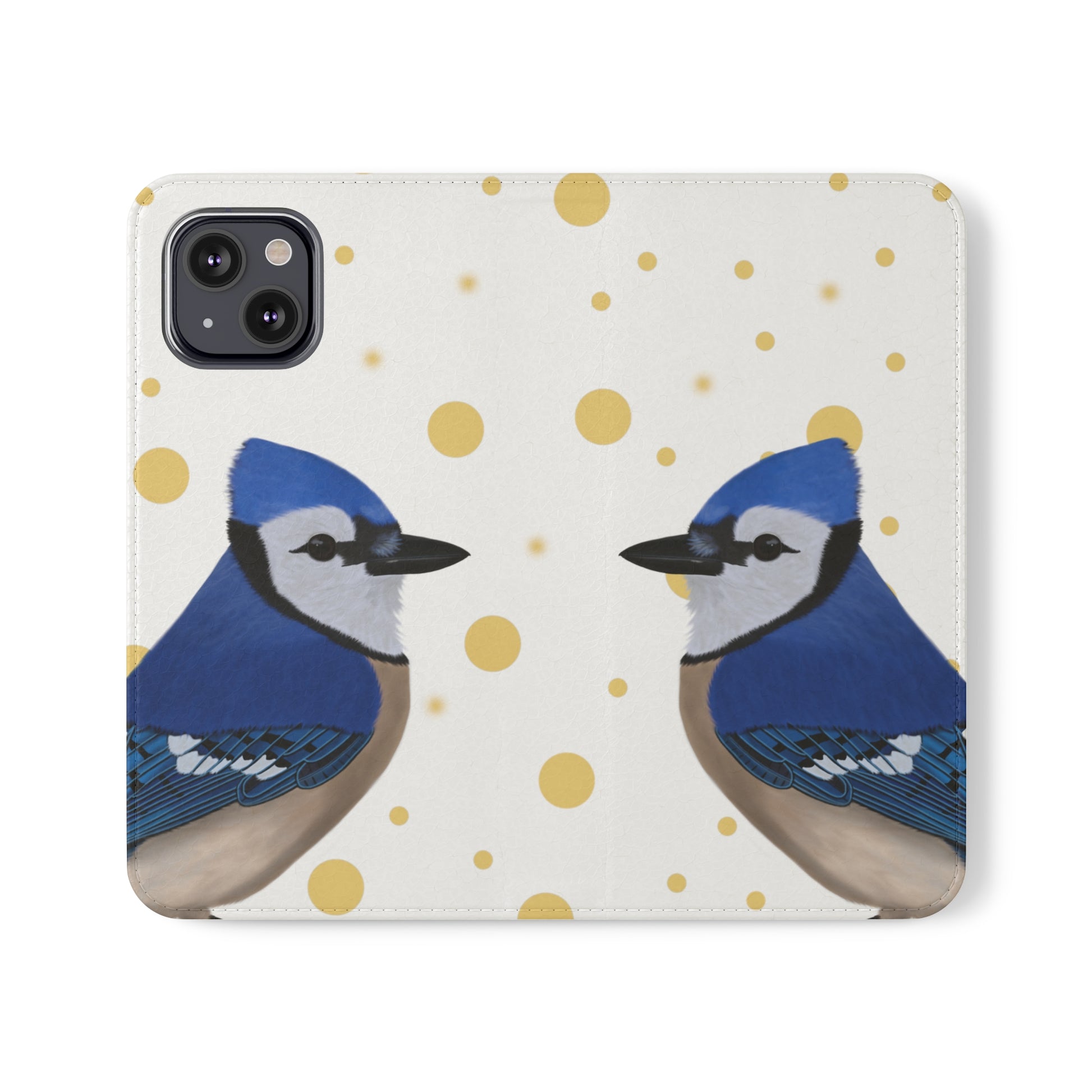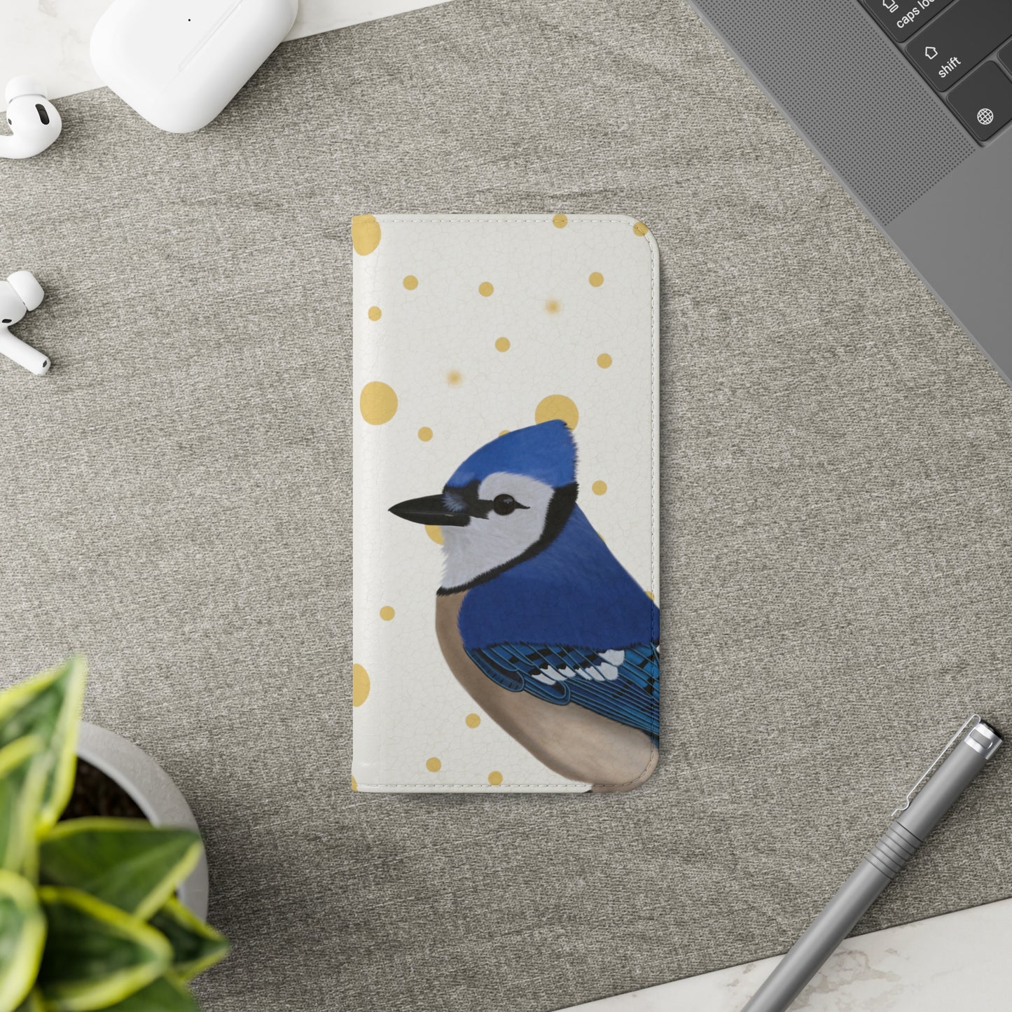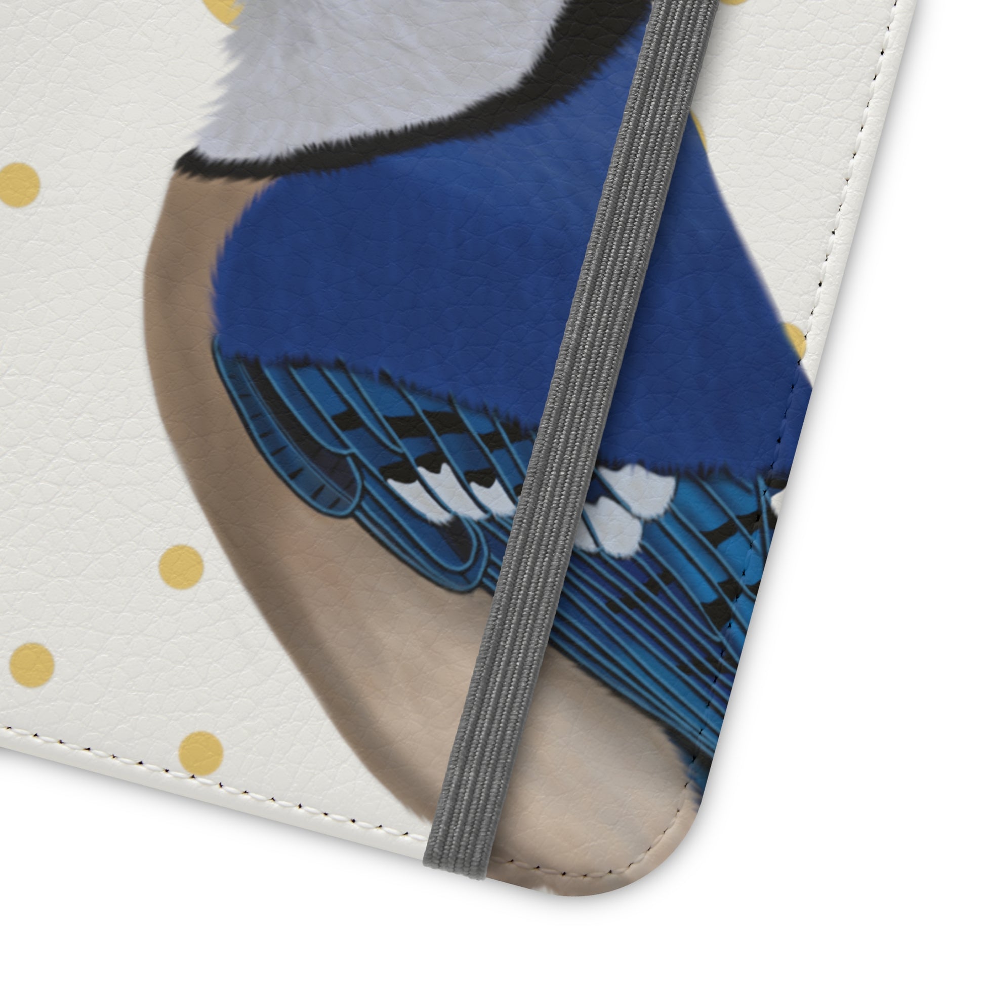 This flip phone case is crafted with faux vegan leather, featuring a stunning Blue Jay bird art design. Perfect for birdlovers, it not only offers style and protection, but also contributes to a cruelty-free lifestyle. Enjoy the beauty of nature with this unique and functional case.