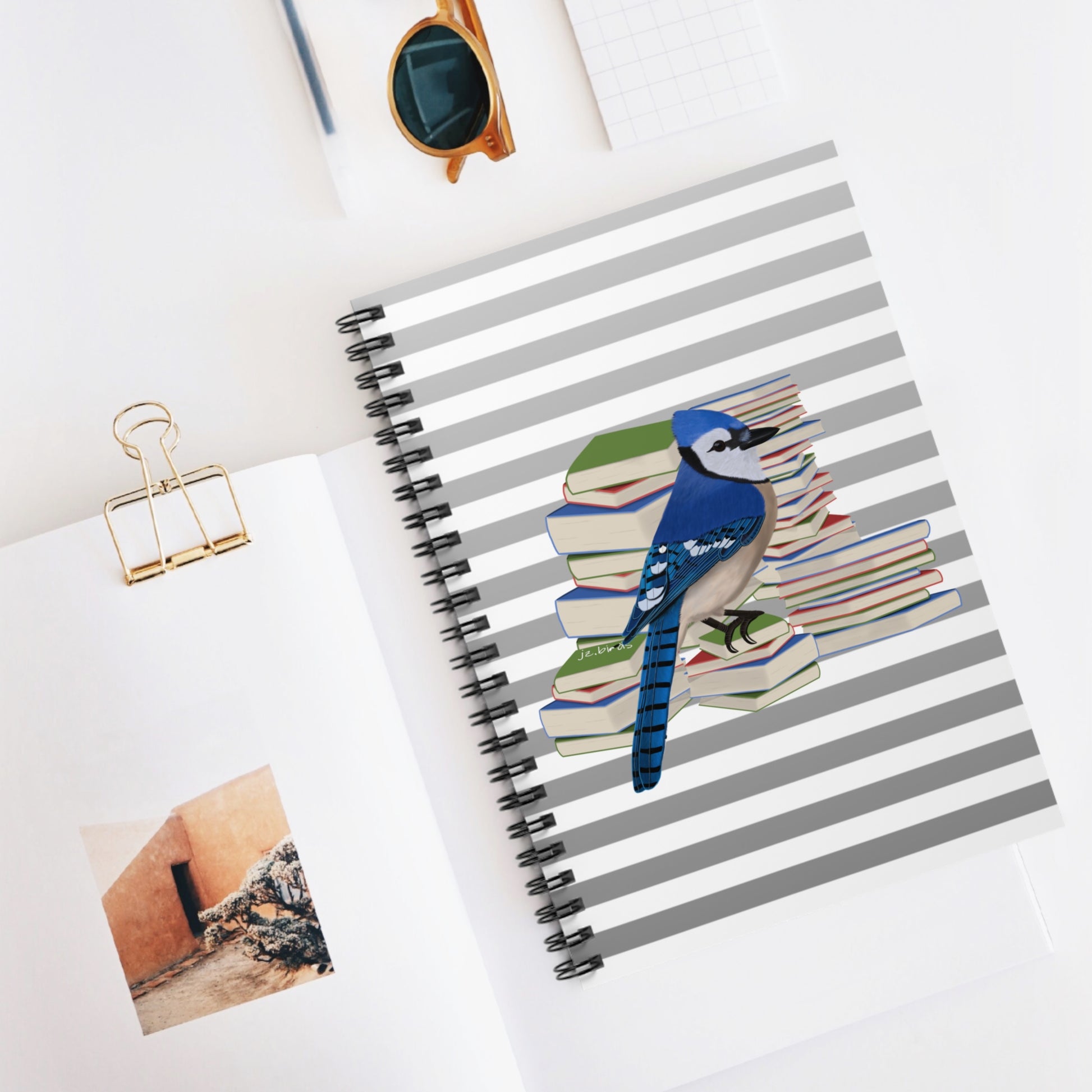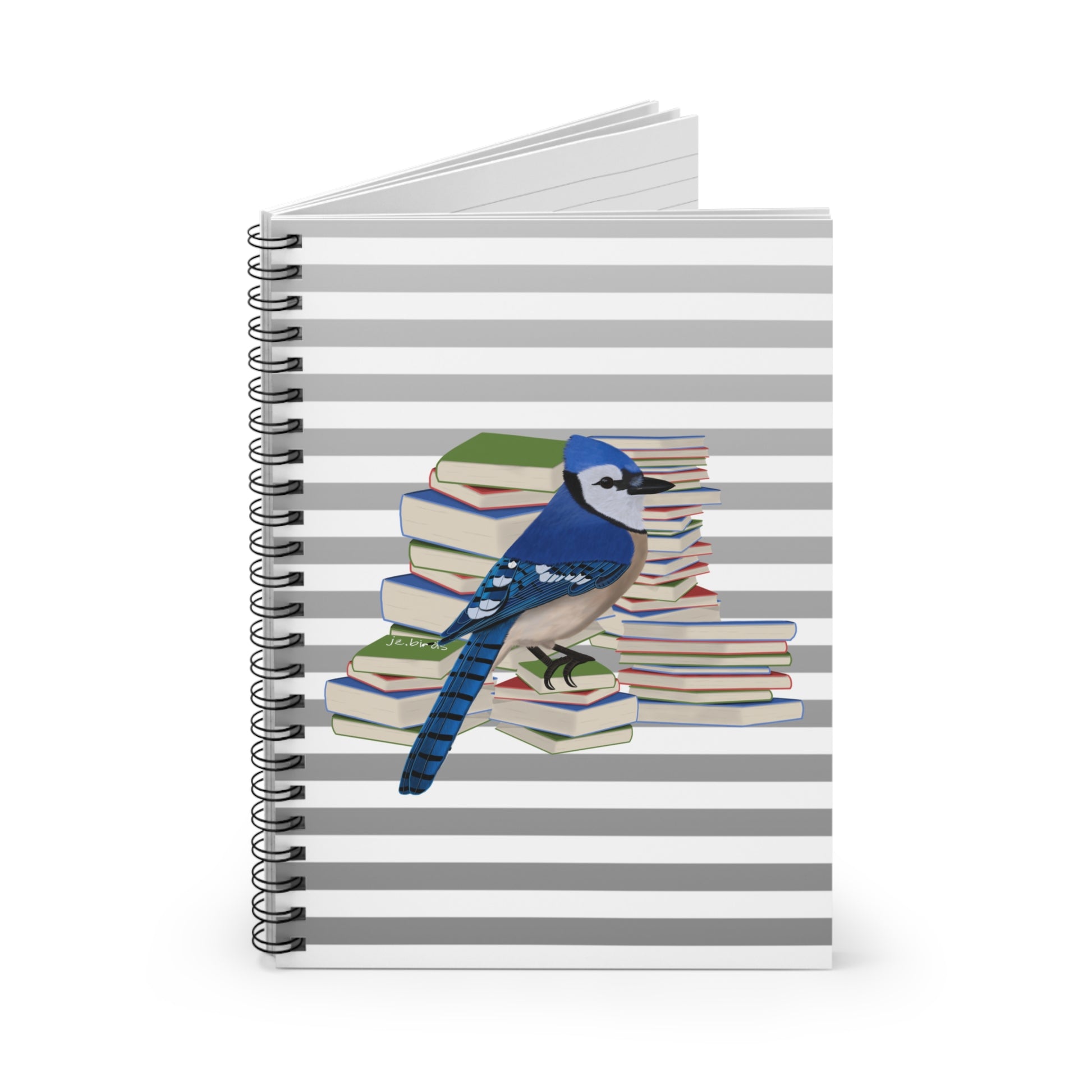 Blue Jay Bird with Books Birdlover Bookworm Spiral Notebook Ruled Line 6" x 8"