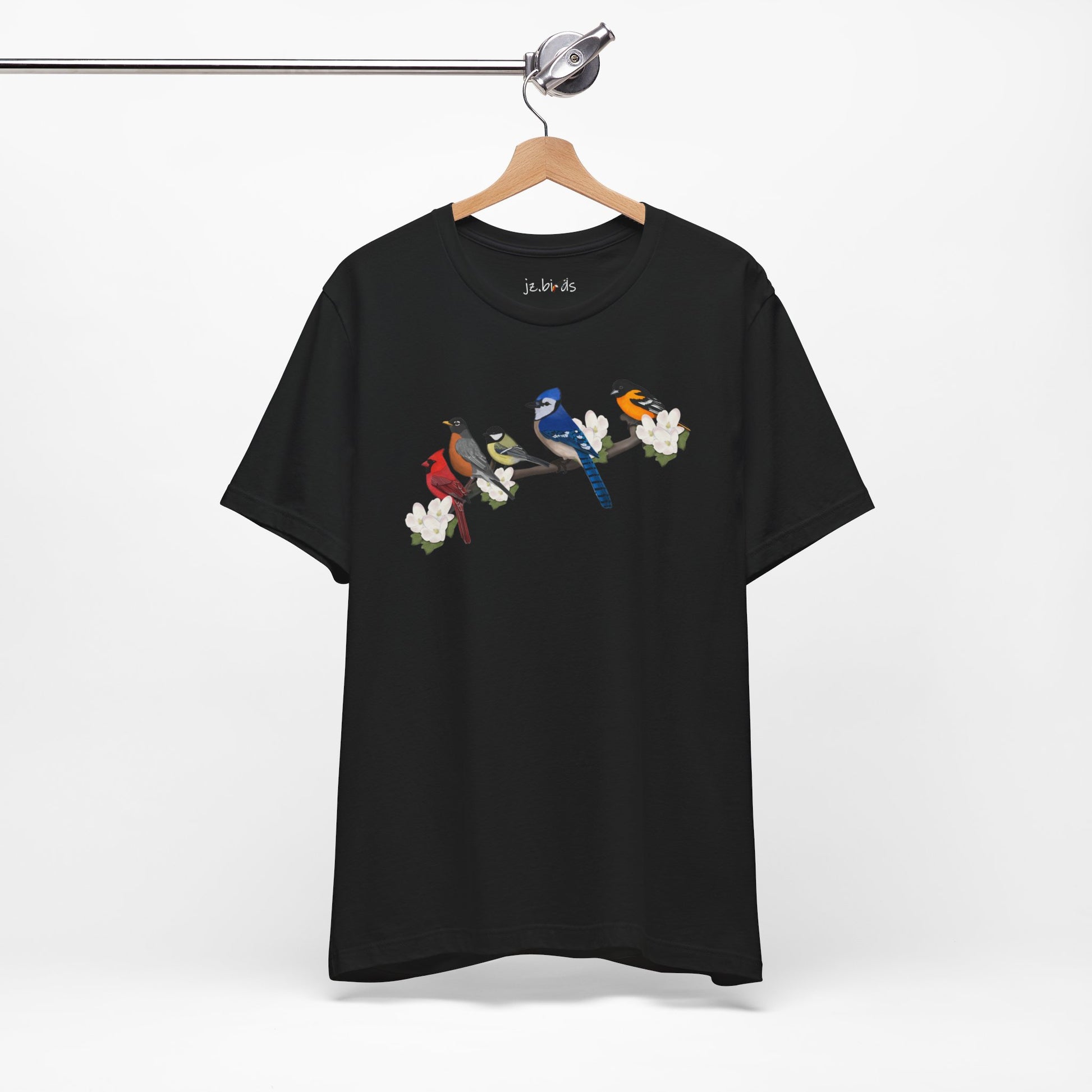 Blue Jay Cardinal Oriole Chickadee Robin on a Branch Garden Birds T-Shirt