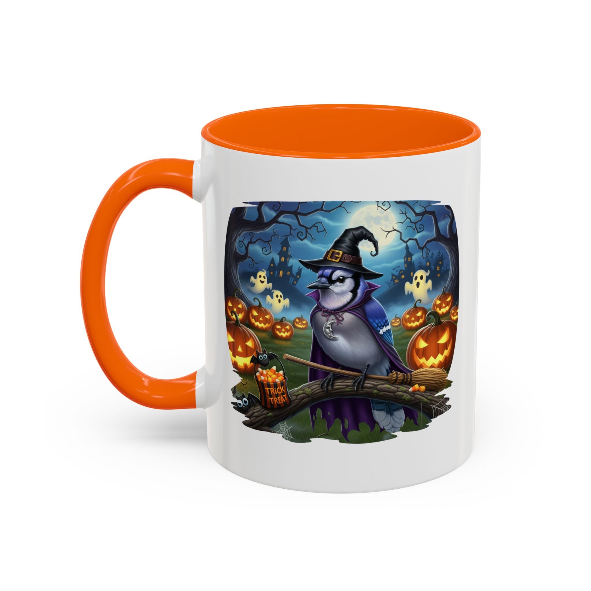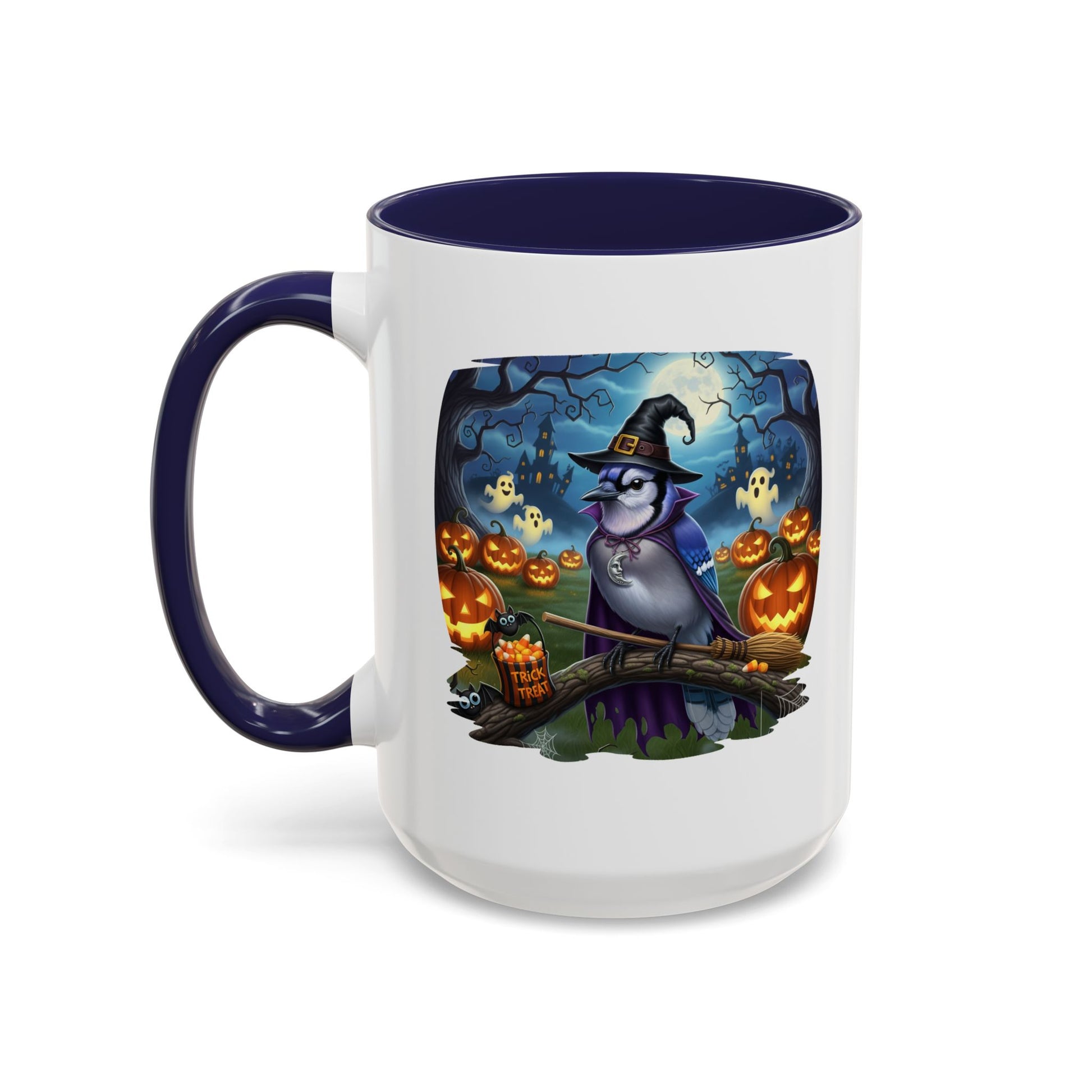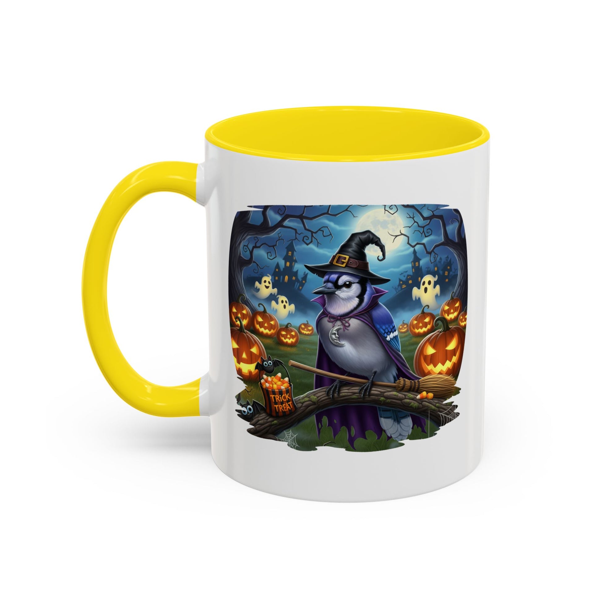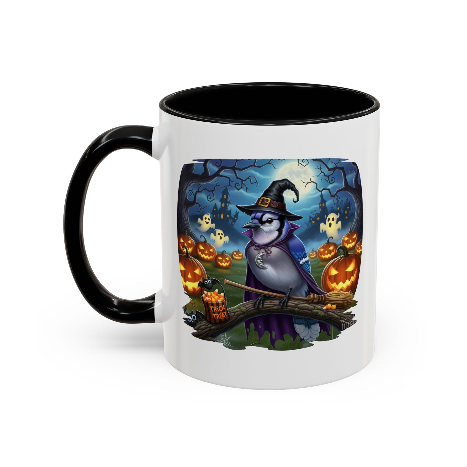 Start your spooky season mornings with a dose of humor and your favorite feathered friends! Our exclusive Blue Jay Halloween bird mug brings a whimsical twist to your daily coffee or tea. This durable ceramic mug features a charmingly spooky design, showcasing a bird (like a bald eagle, cardinal, or blue jay) wearing a witch's hat and ready for a flight on a broomstick.