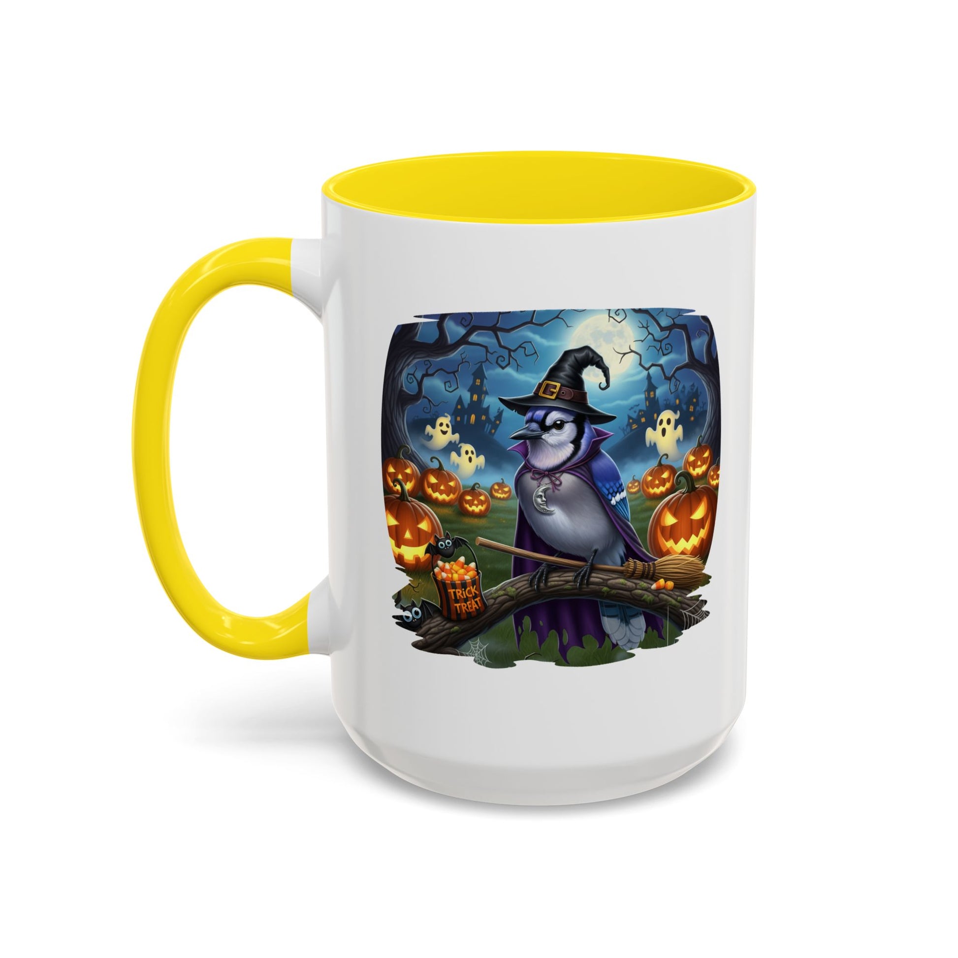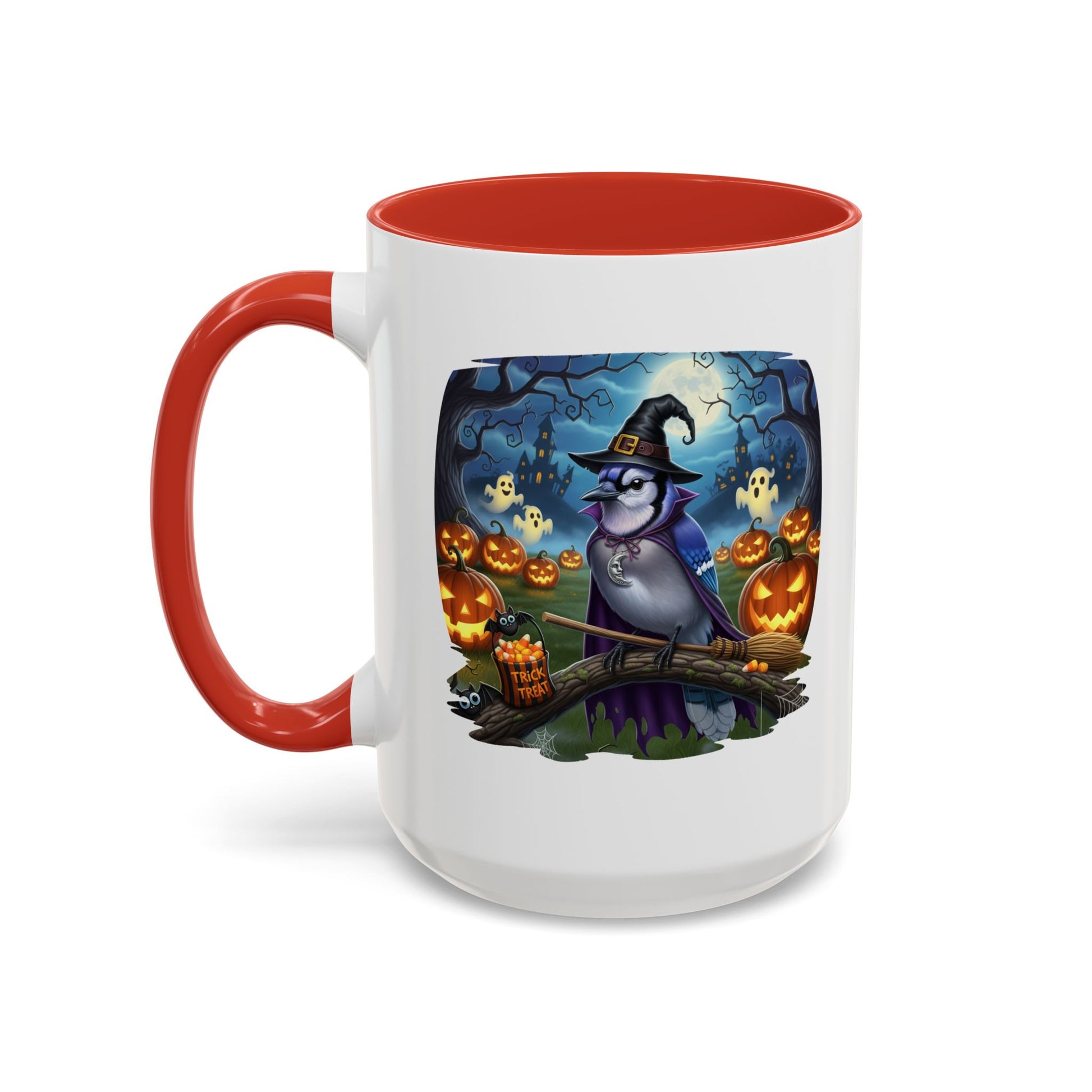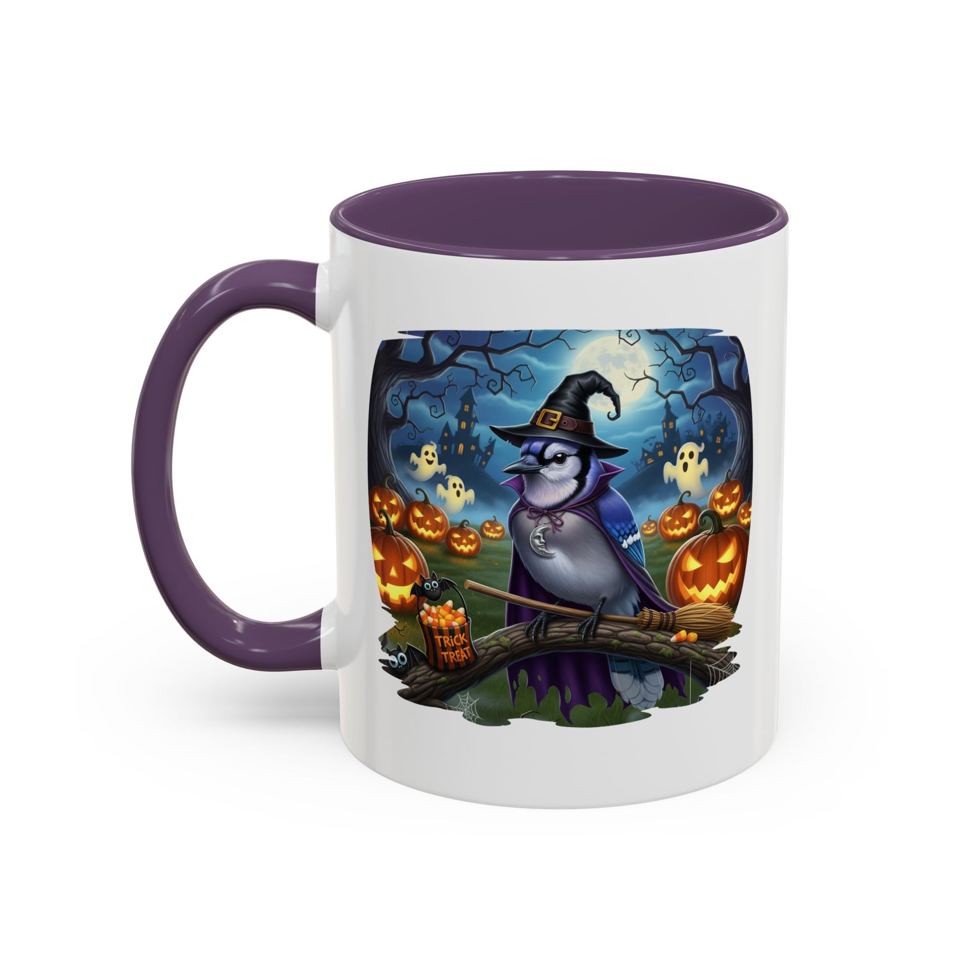 Start your spooky season mornings with a dose of humor and your favorite feathered friends! Our exclusive Blue Jay Halloween bird mug brings a whimsical twist to your daily coffee or tea. This durable ceramic mug features a charmingly spooky design, showcasing a bird (like a bald eagle, cardinal, or blue jay) wearing a witch's hat and ready for a flight on a broomstick.