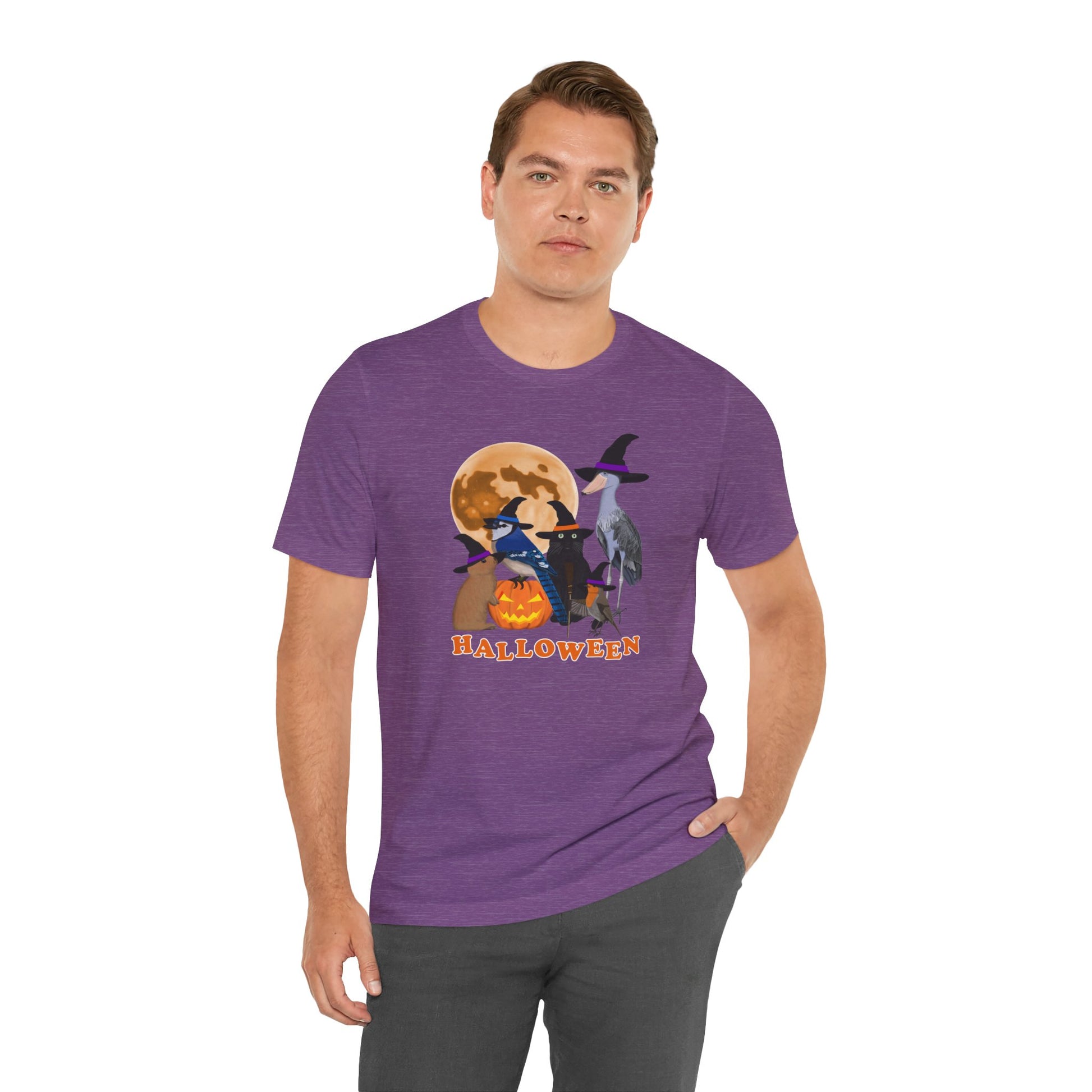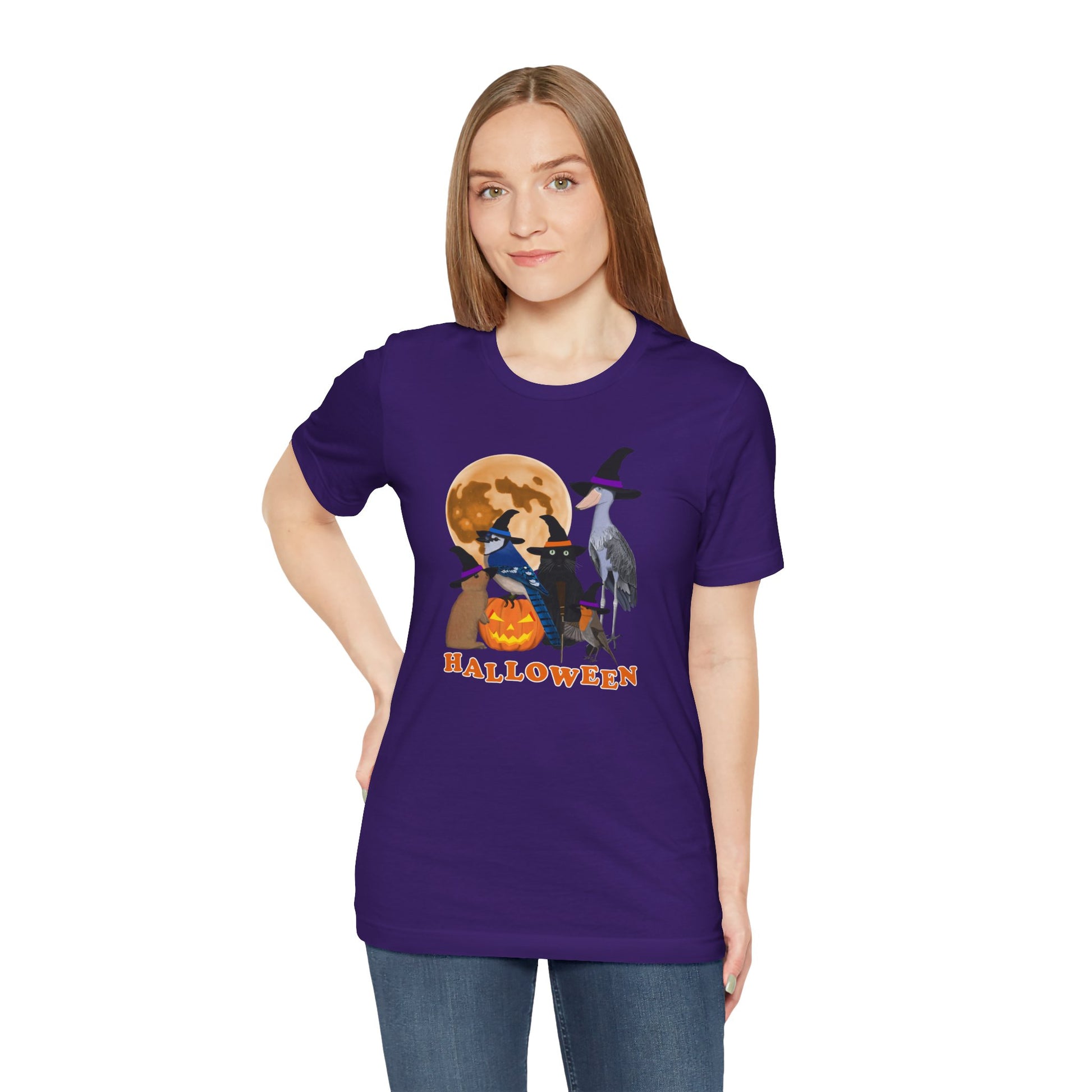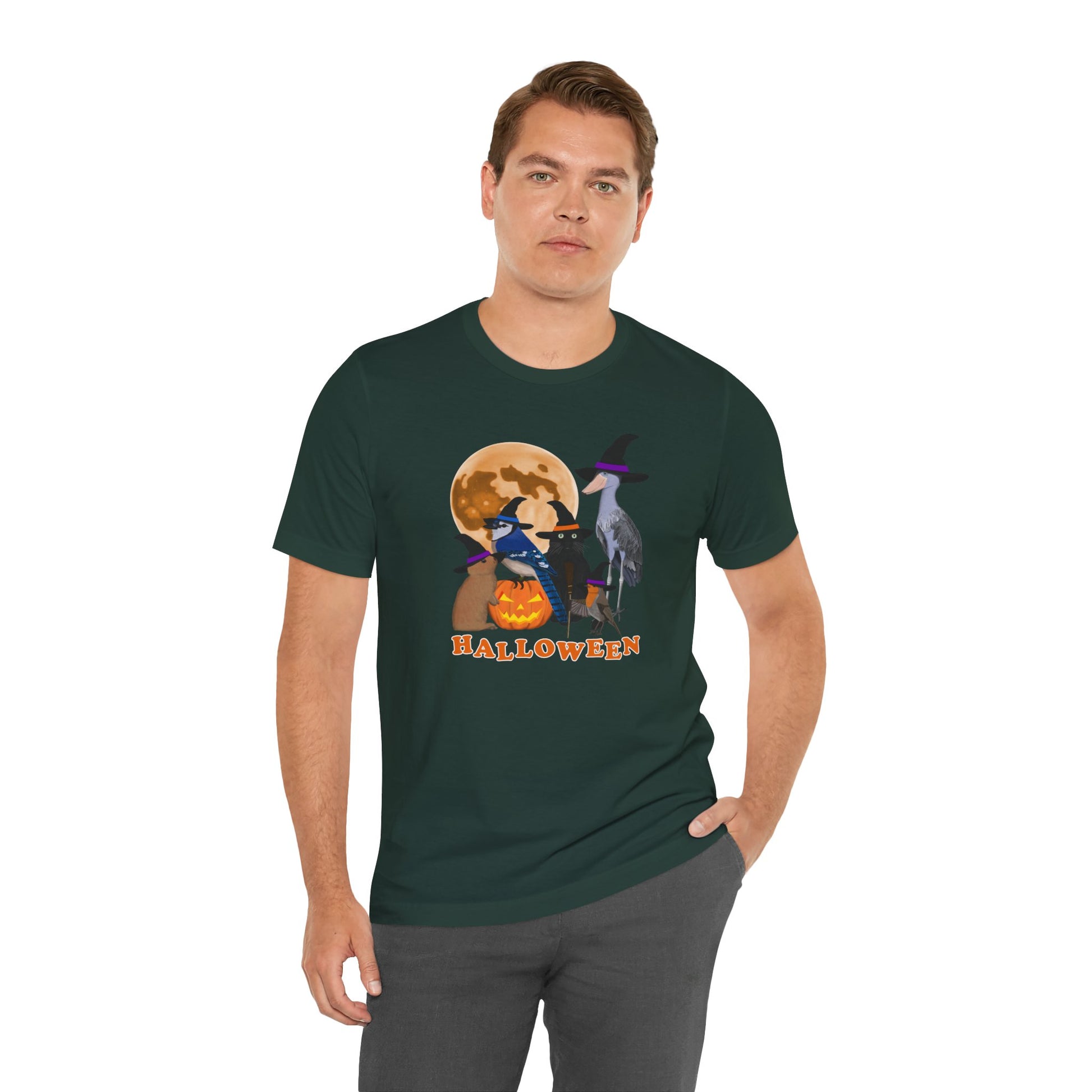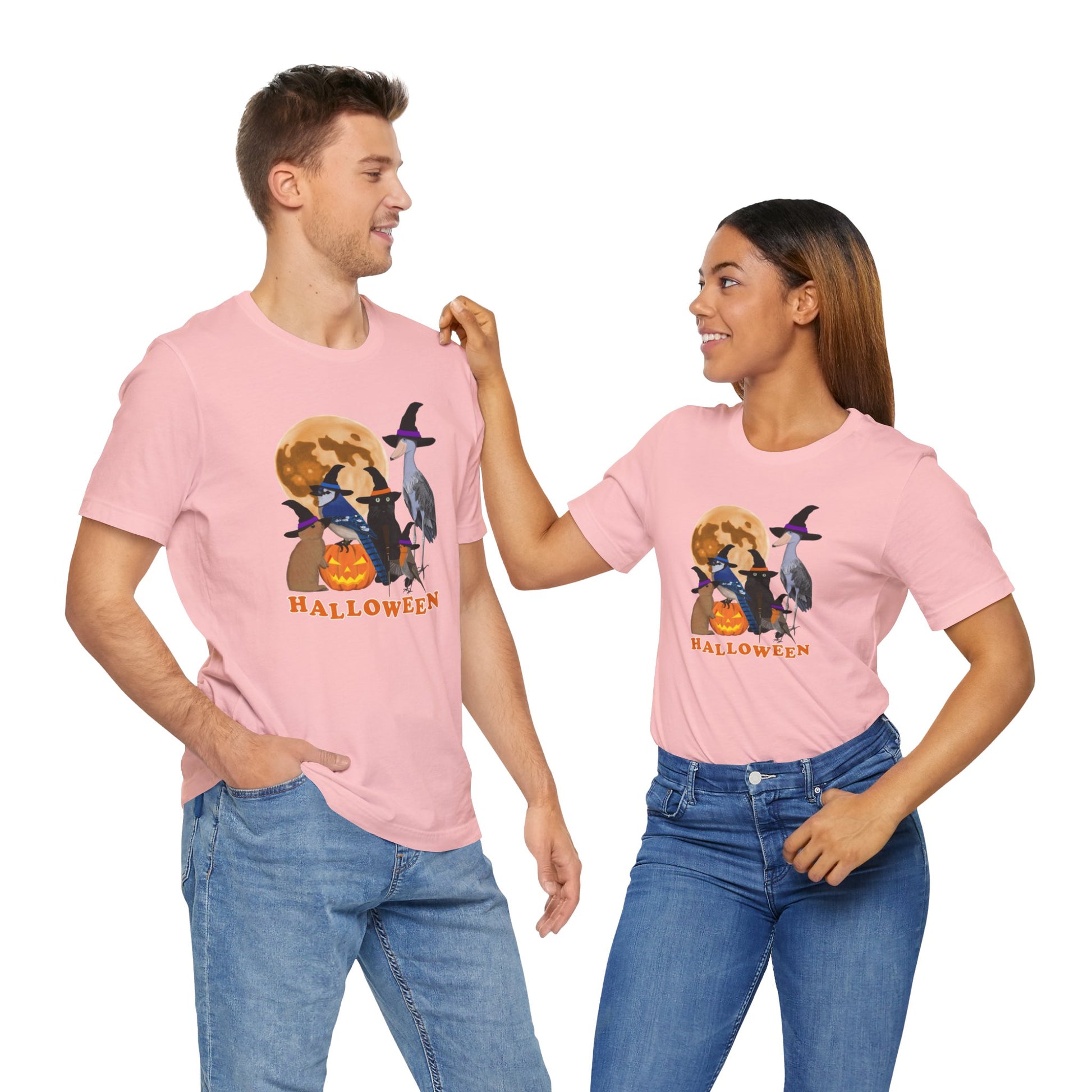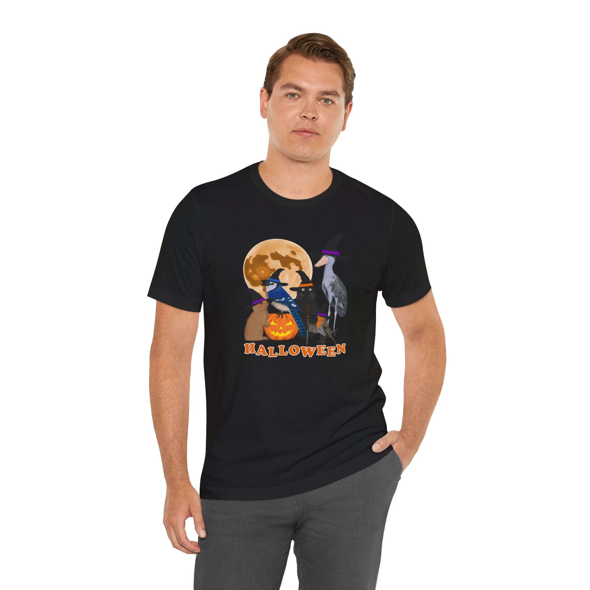 This Blue Jay, Robin, Shoebill with a Cat and Bunny Halloween bird t-shirt is a must-have for bird lovers. Featuring beautiful bird artwork, it's the perfect addition to any nature enthusiast's wardrobe. Made of high-quality material, this shirt is both comfortable and stylish. Show your love for birds and stand out in any crowd with this unique and eye-catching Halloween t-shirt.