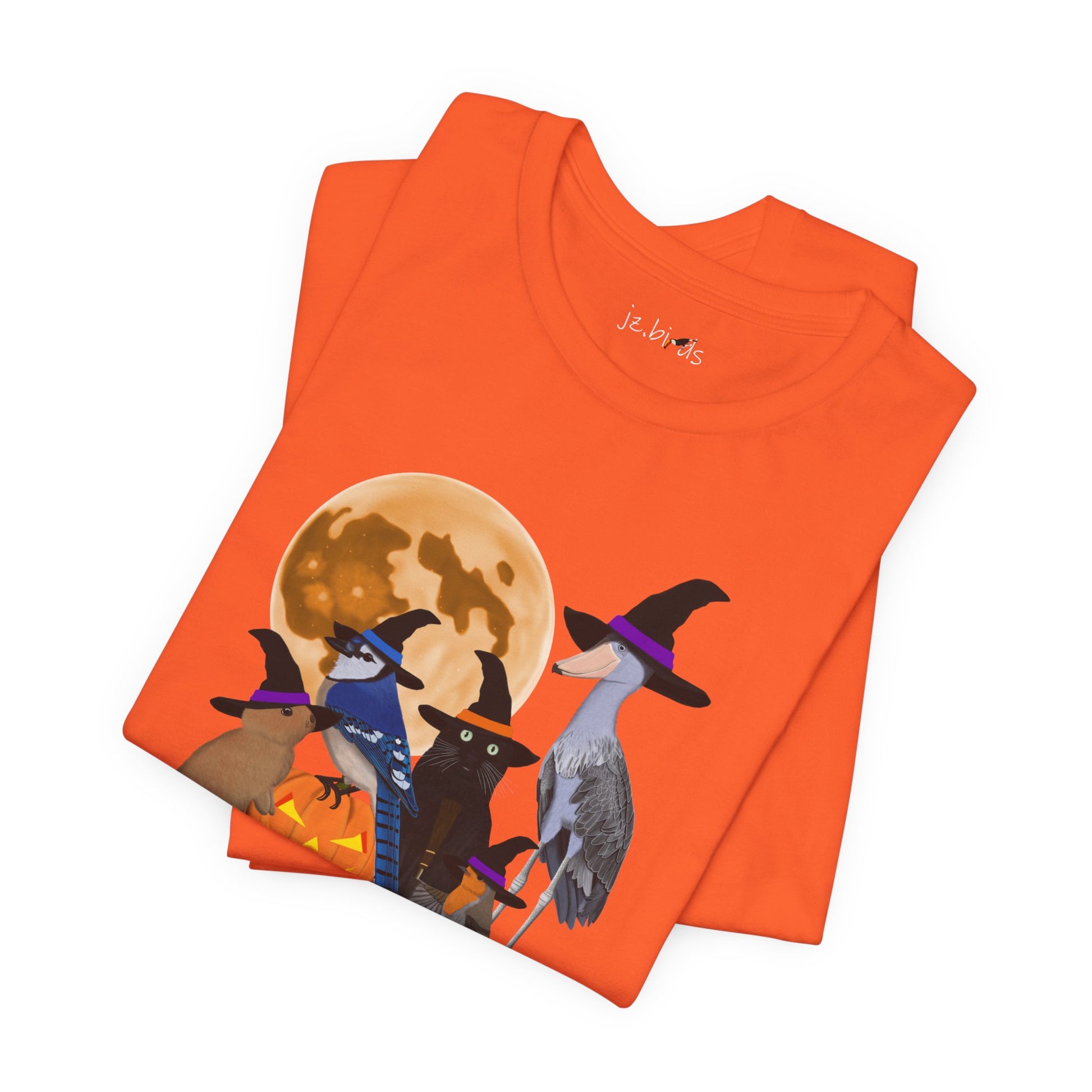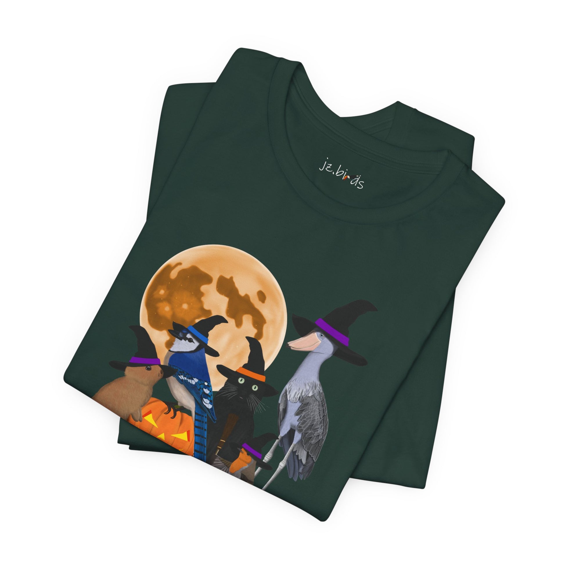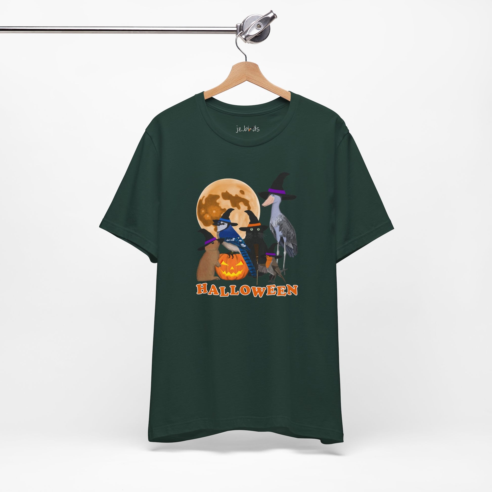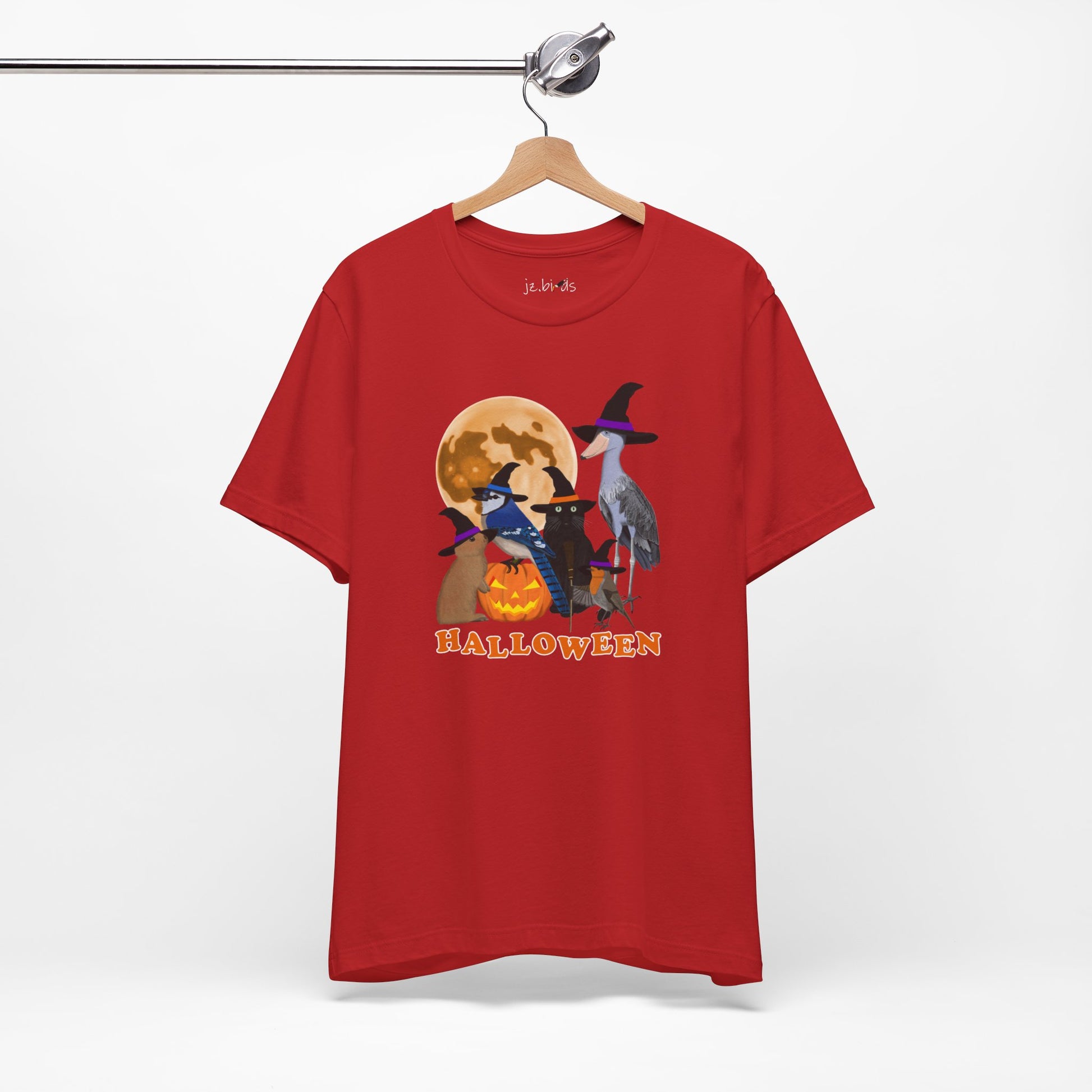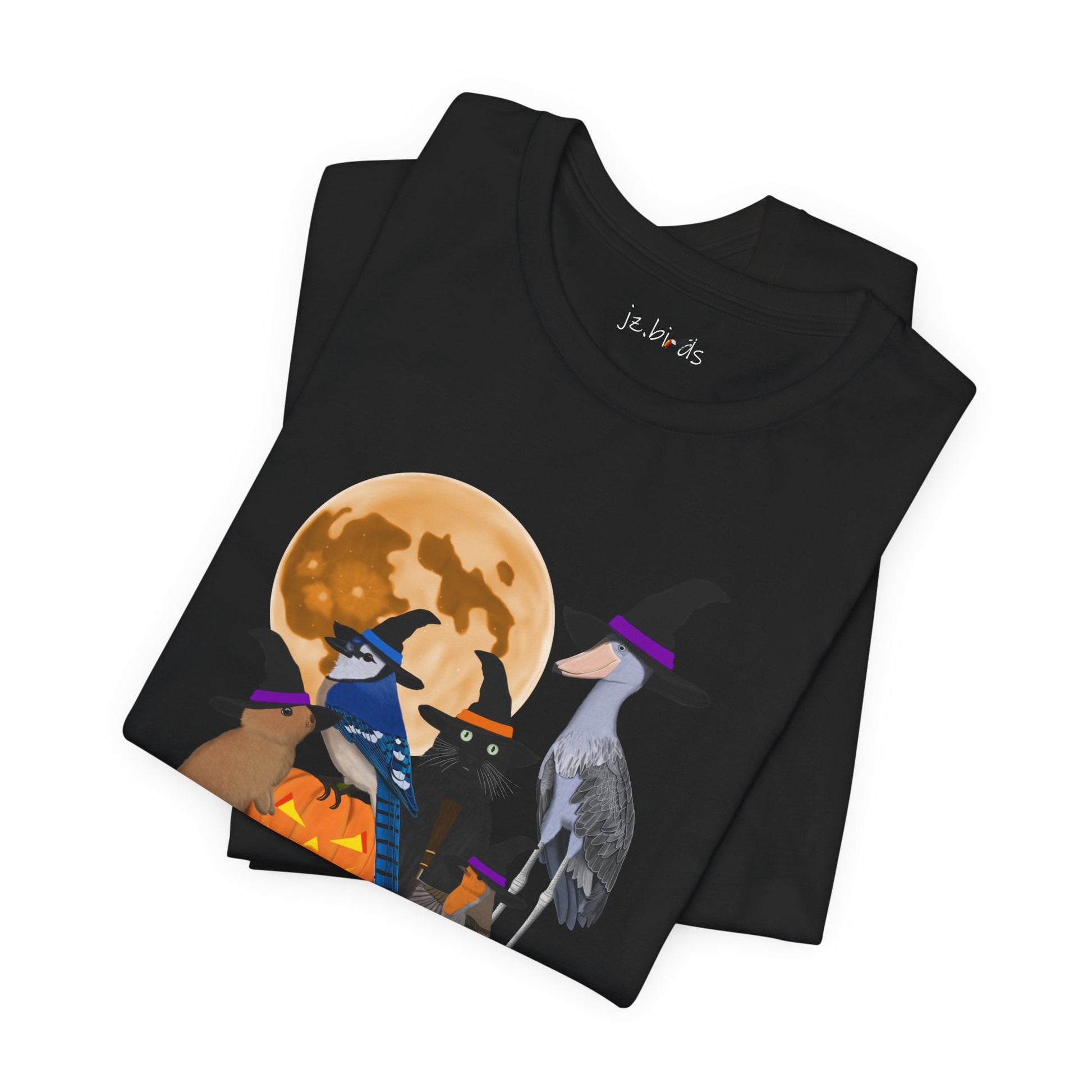 This Blue Jay, Robin, Shoebill with a Cat and Bunny Halloween bird t-shirt is a must-have for bird lovers. Featuring beautiful bird artwork, it's the perfect addition to any nature enthusiast's wardrobe. Made of high-quality material, this shirt is both comfortable and stylish. Show your love for birds and stand out in any crowd with this unique and eye-catching Halloween t-shirt.