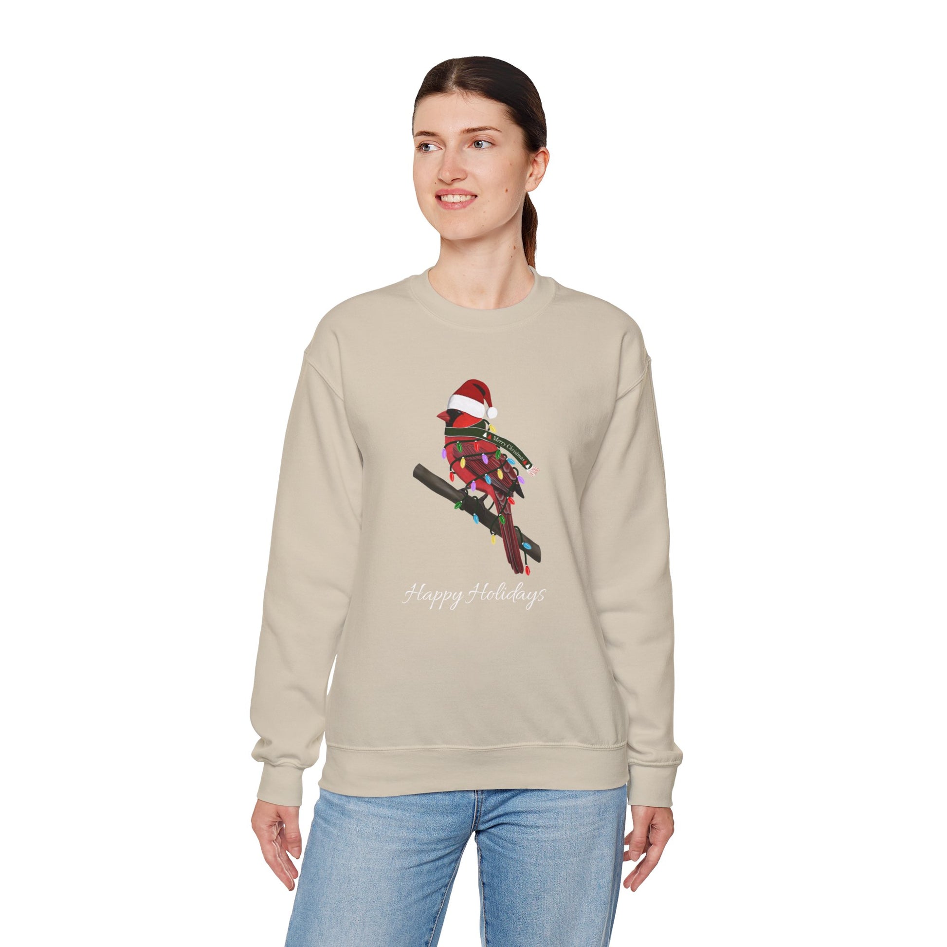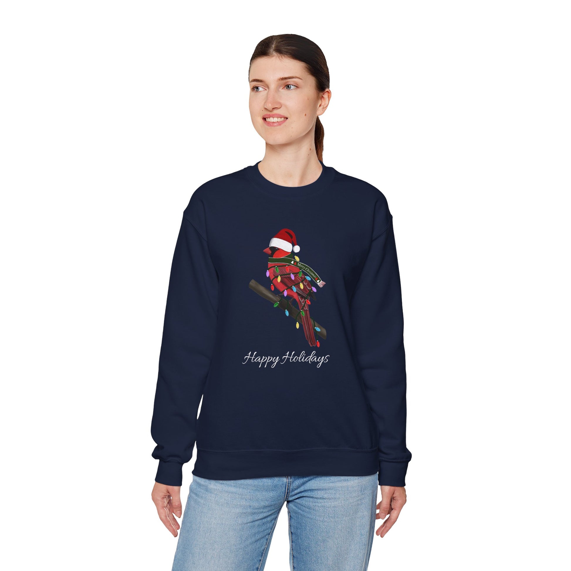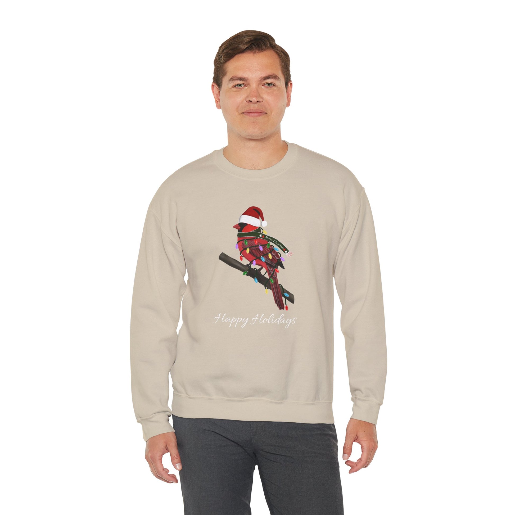 Show off your love for Christmas and birds with this unique 'Happy Holidays' sweatshirt. Featuring a Cardinal with Fairy Lights as Santa bird design, this is the perfect gift for any birdwatcher or a fun addition to your Christmas outfit. Spread some holiday cheer with this cute and stylish design.