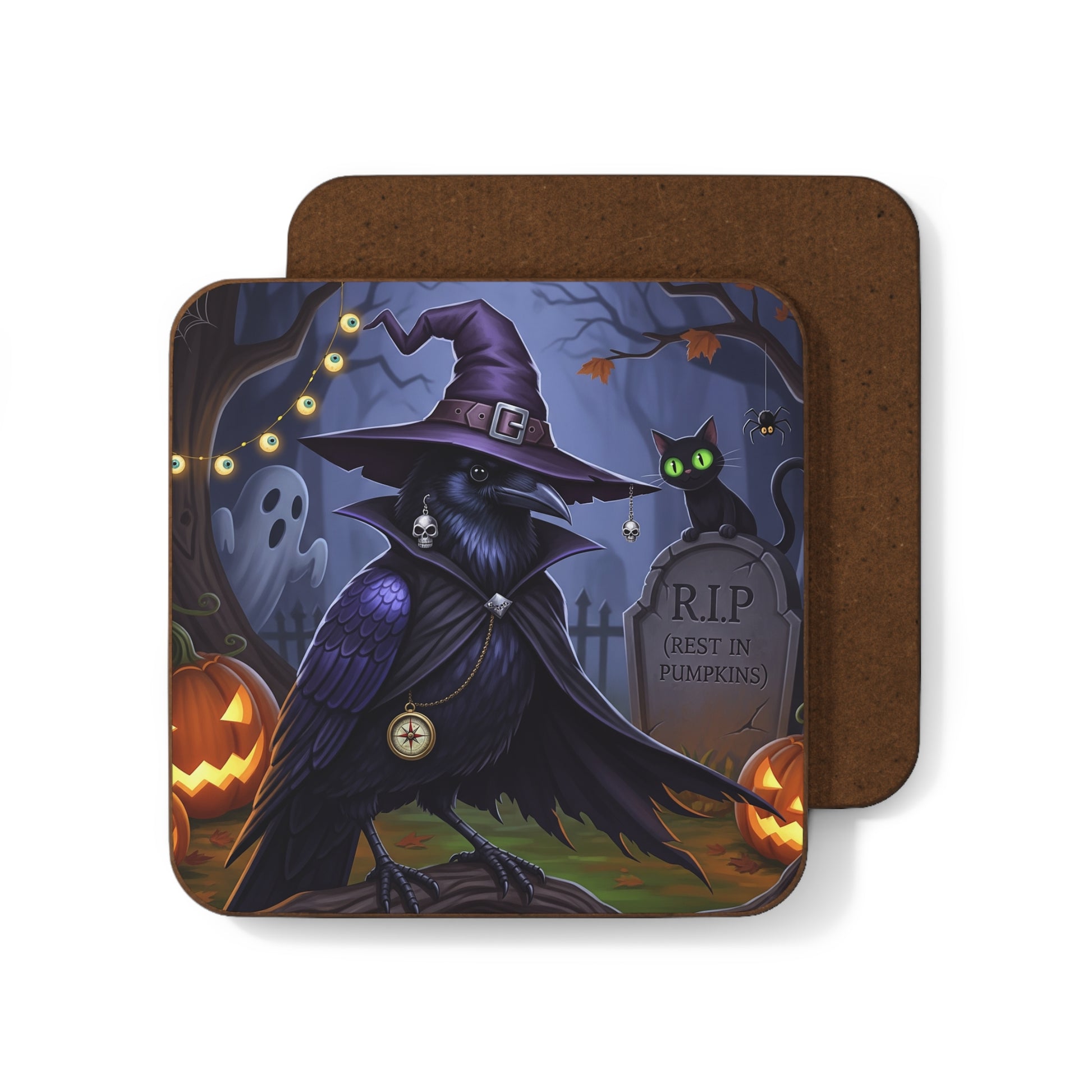 Crow Halloween Coasters - Funny Spooky Bird Design with Pumpkins & Cat