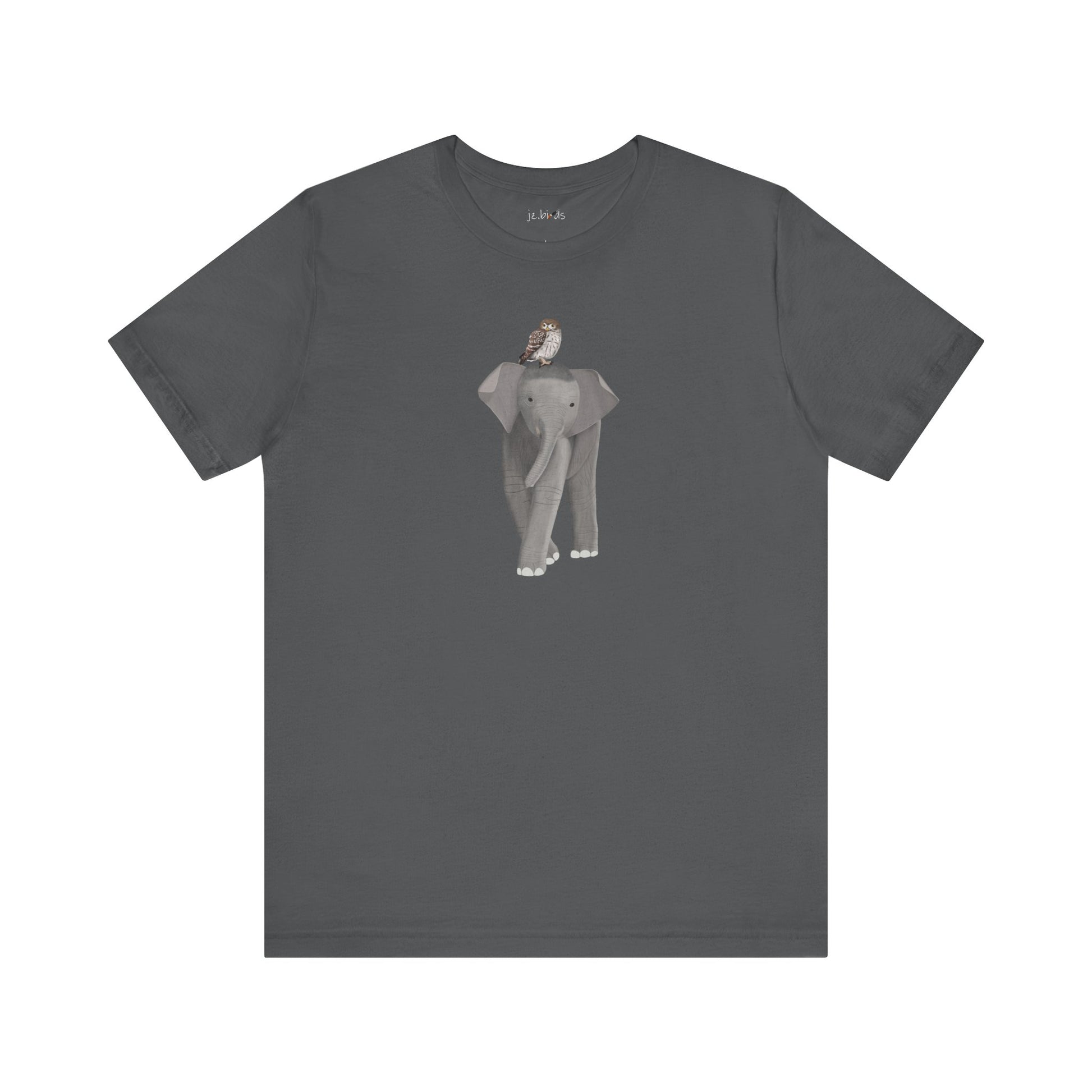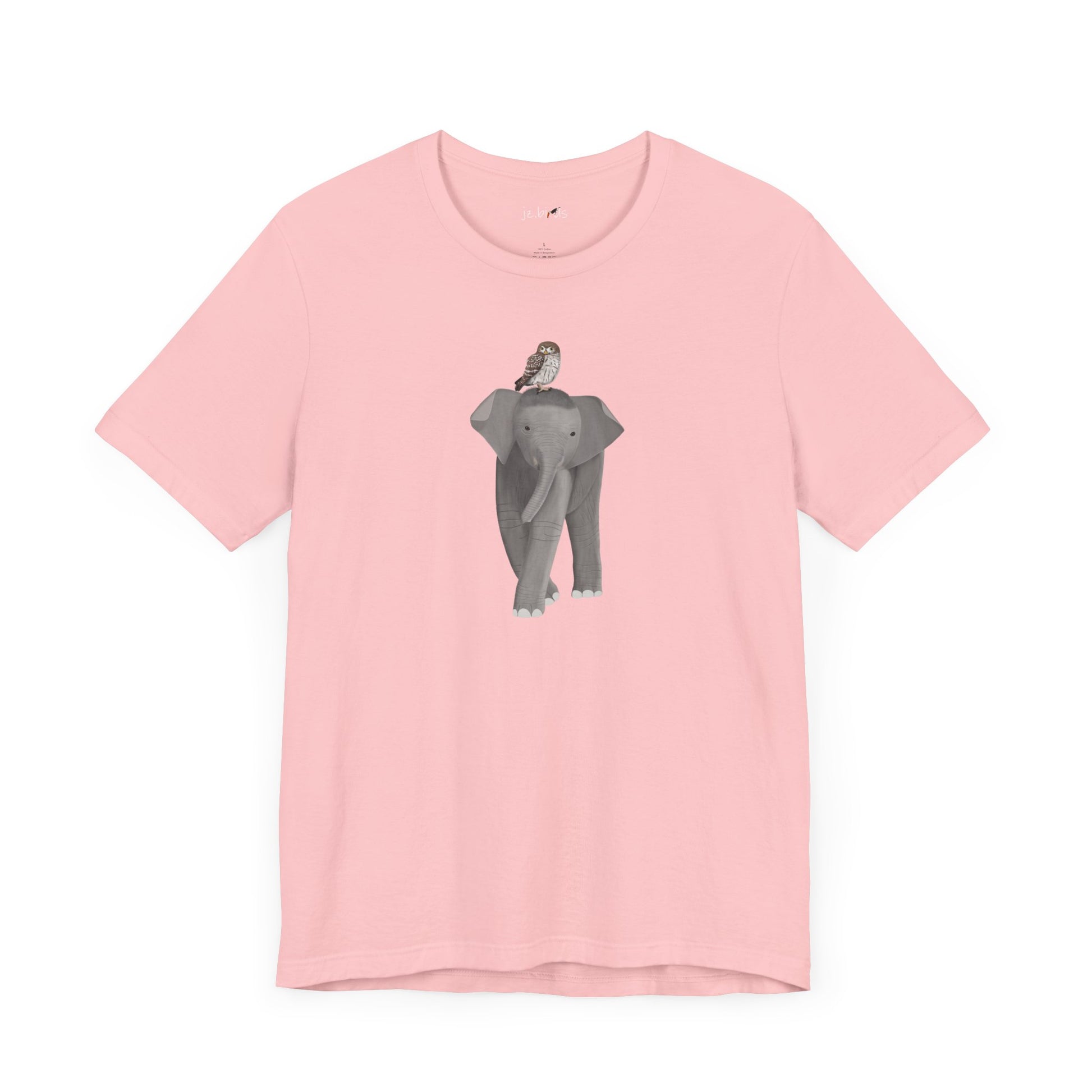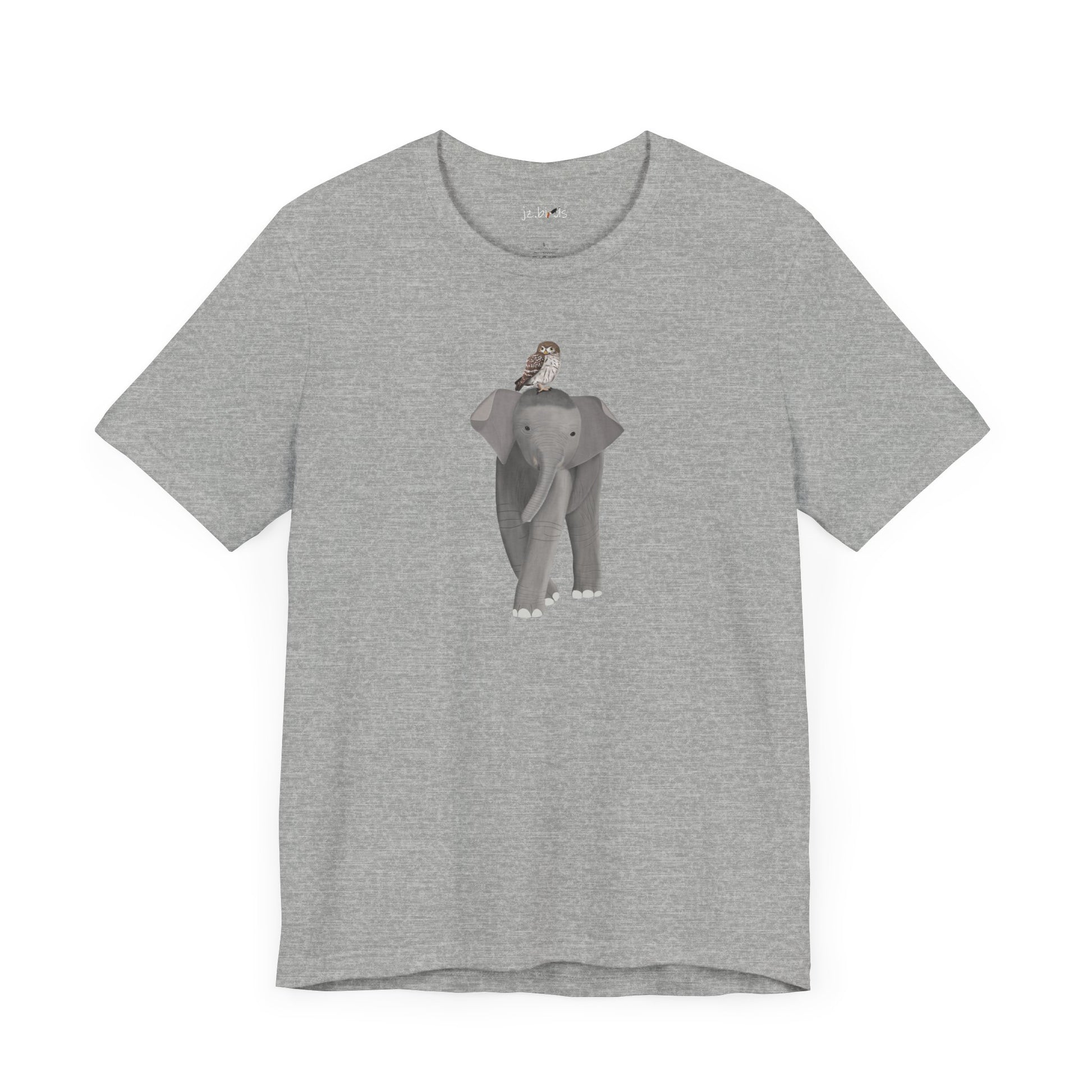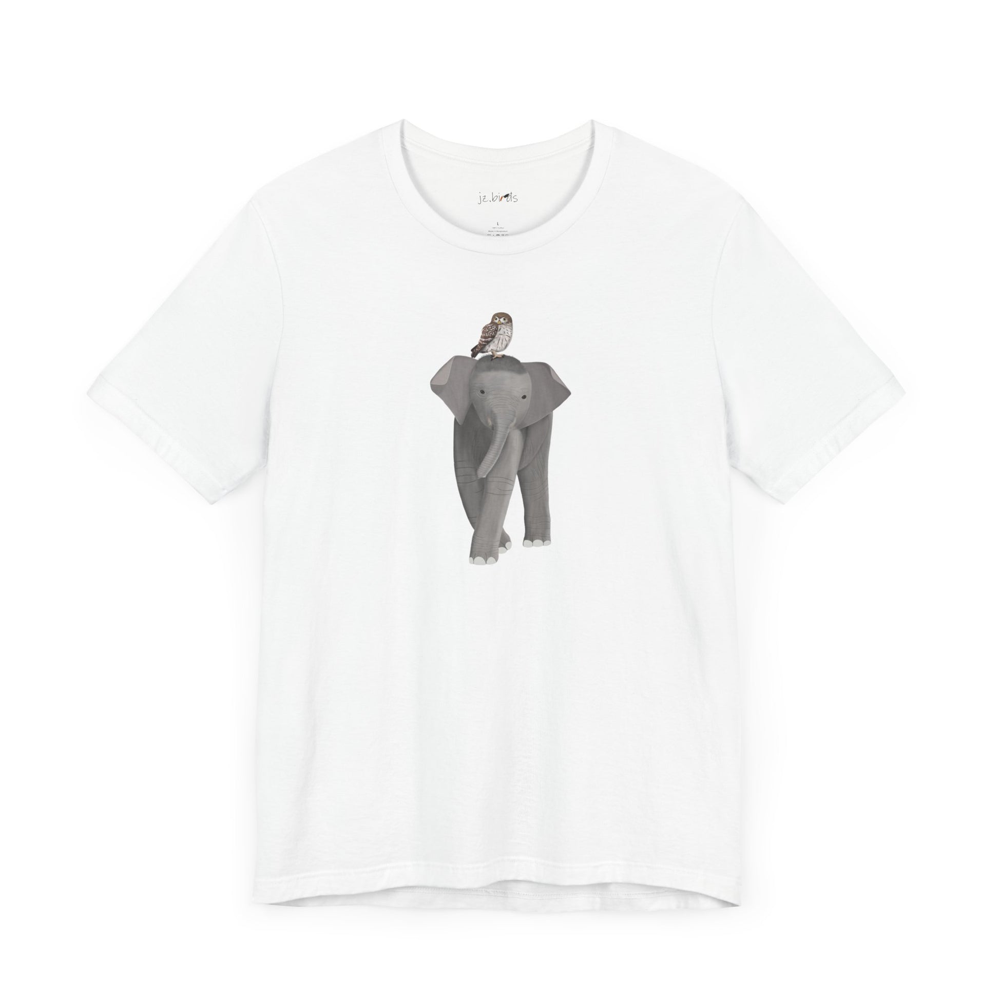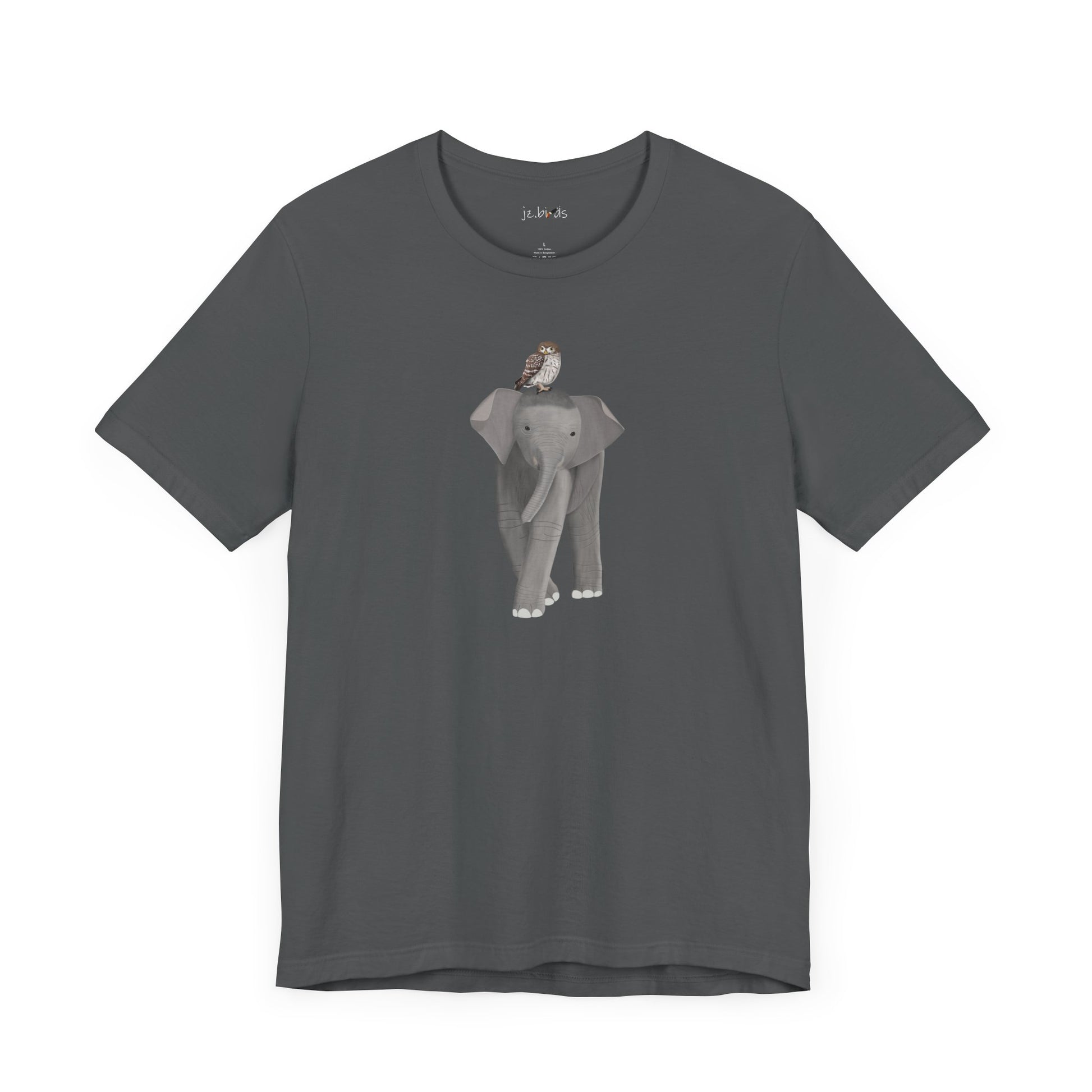 This elephant with a little owl bird t-shirt is a must-have for bird lovers. Featuring beautiful elephant and bird artwork, it's the perfect addition to any nature enthusiast's wardrobe for birding and birdwatching. Made of high-quality material, this shirt is both comfortable and stylish. Show your love for birds and stand out in any crowd with this unique and eye-catching t-shirt.