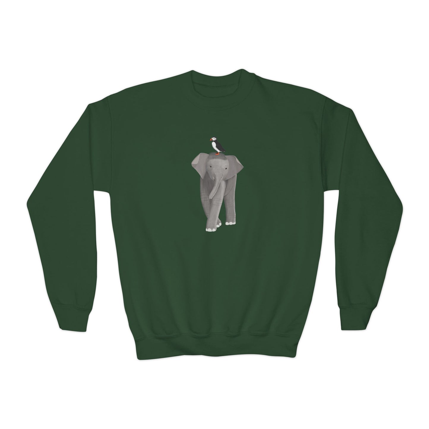Elephant with Puffin Bird Youth Crewneck Sweatshirt