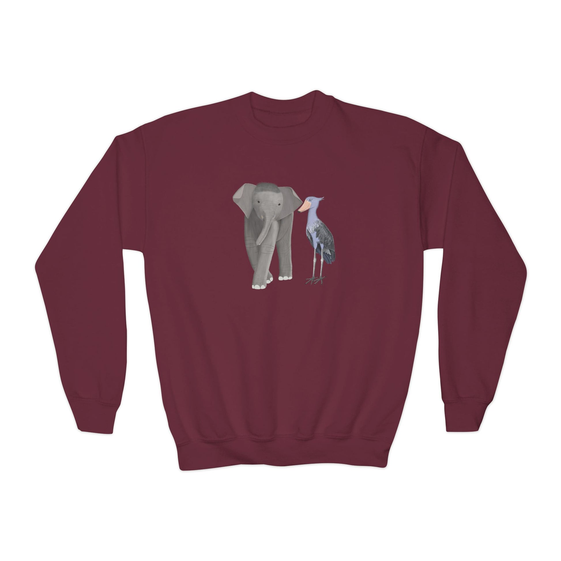 Elephant with Shoebill Bird Youth Crewneck Sweatshirt