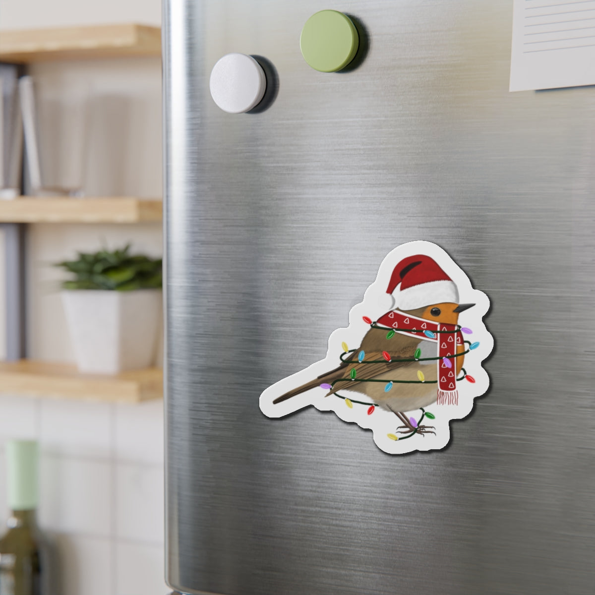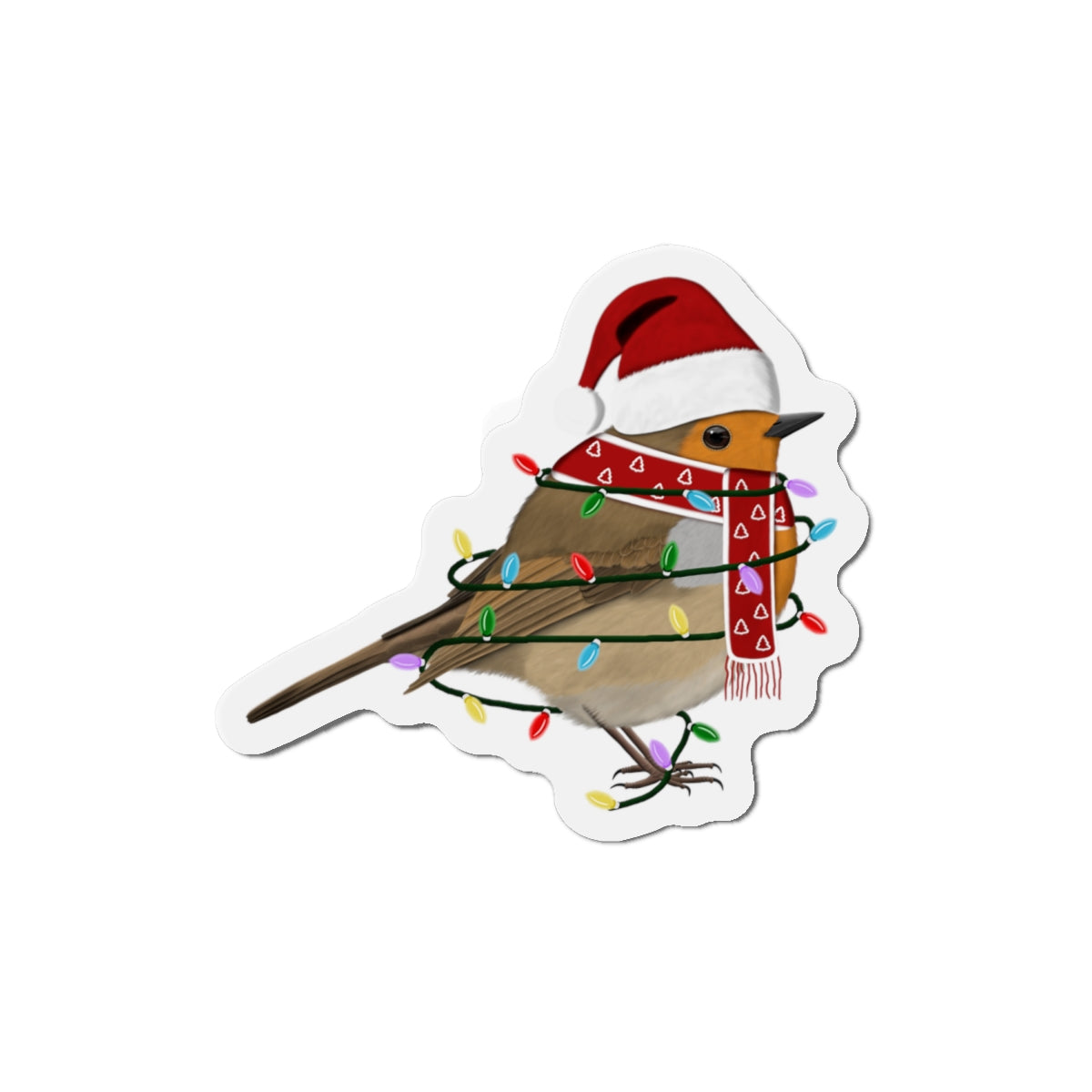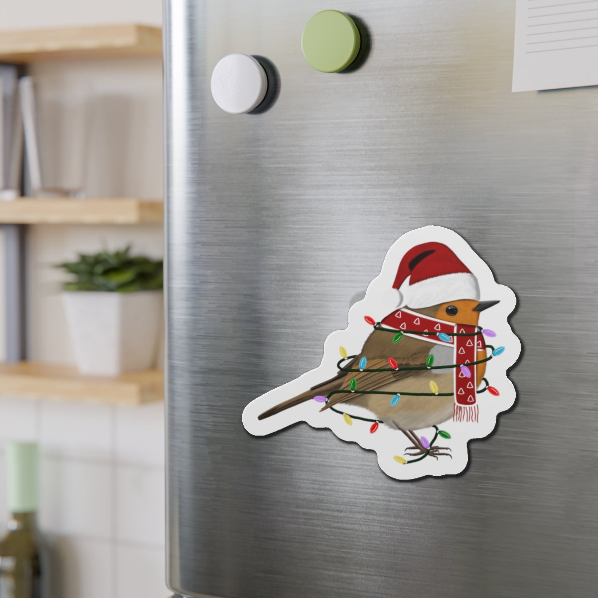 European Robin with Fairy Lights and Scarf Christmas Bird Magnet