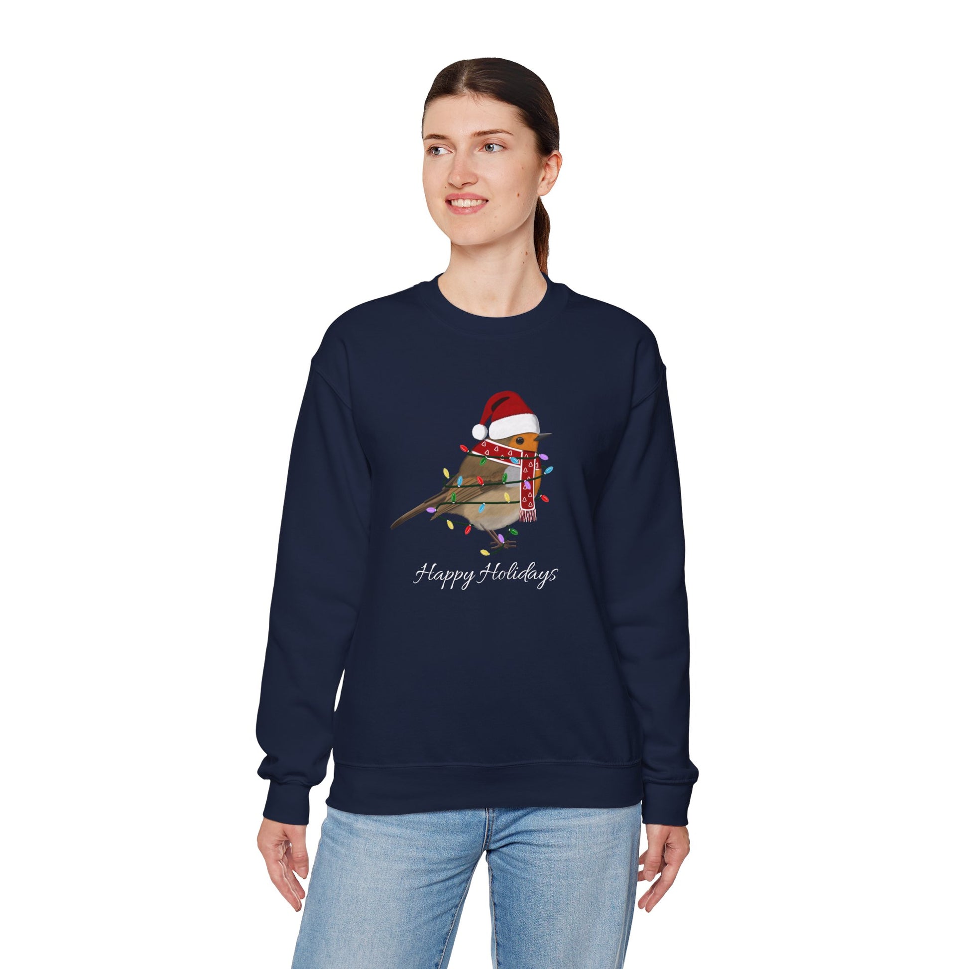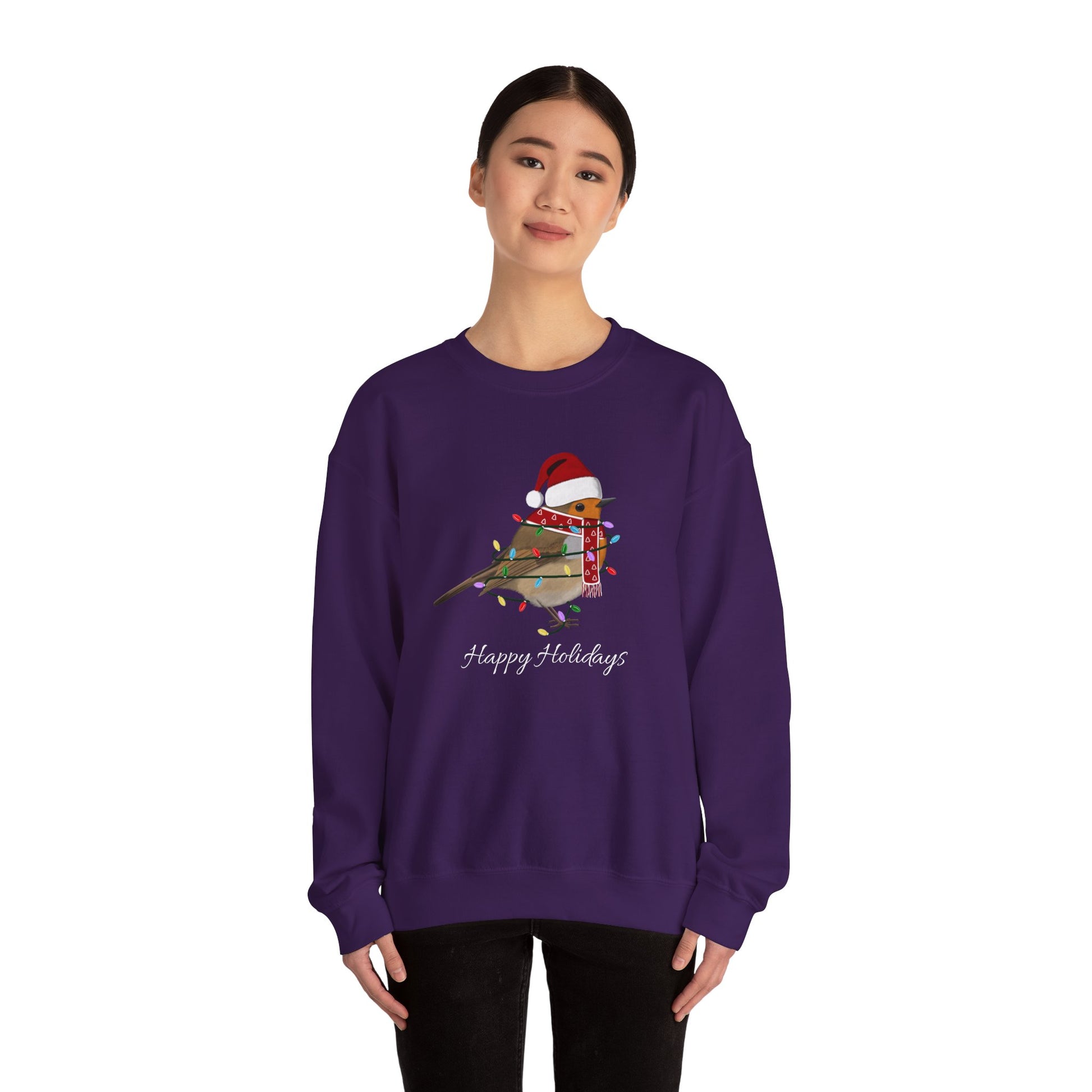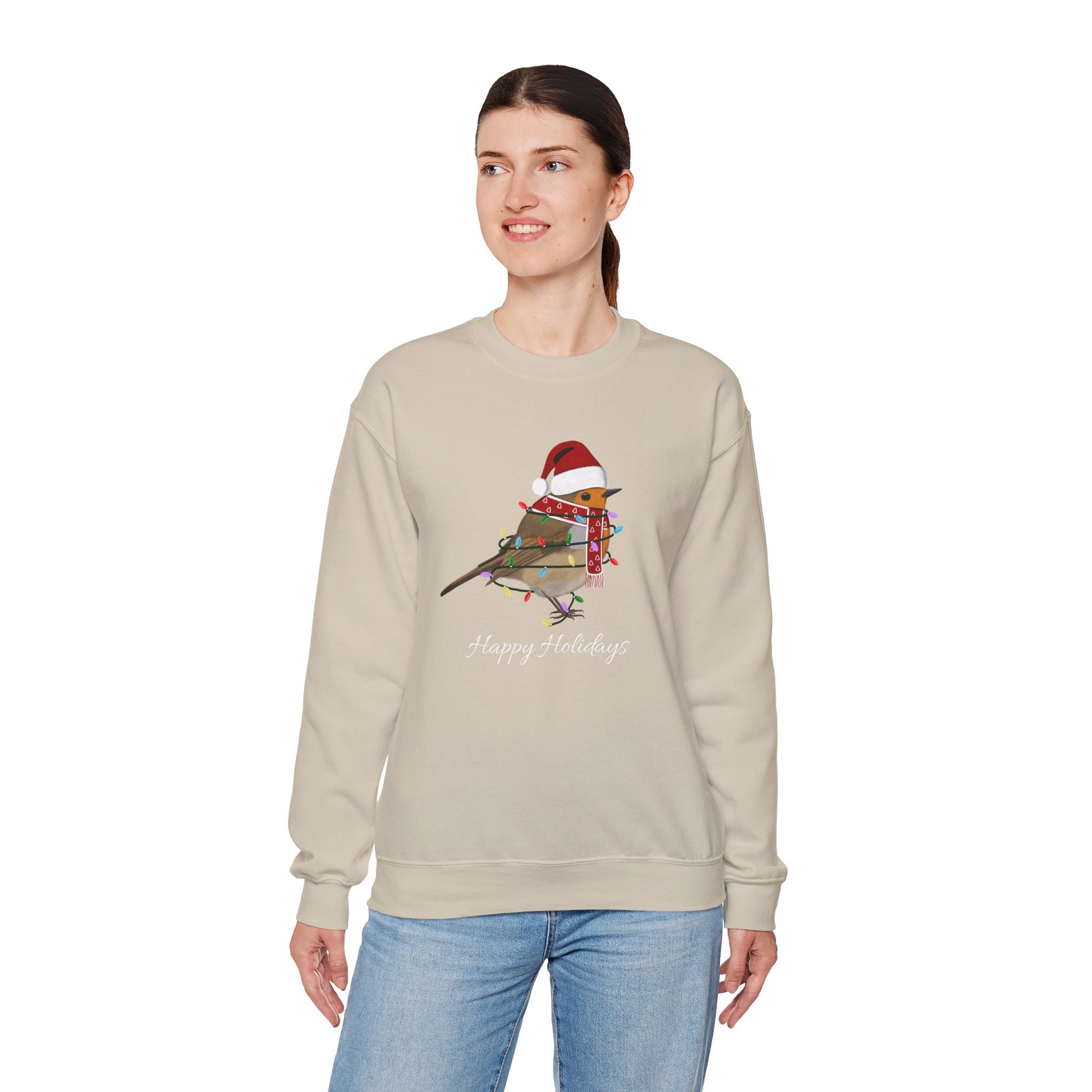 Show off your love for Christmas and birds with this unique 'Happy Holidays' sweatshirt. Featuring a European Robin with Fairy Lights as Santa bird design, this is the perfect gift for any birdwatcher or a fun addition to your Christmas outfit. Spread some holiday cheer with this cute and stylish design.