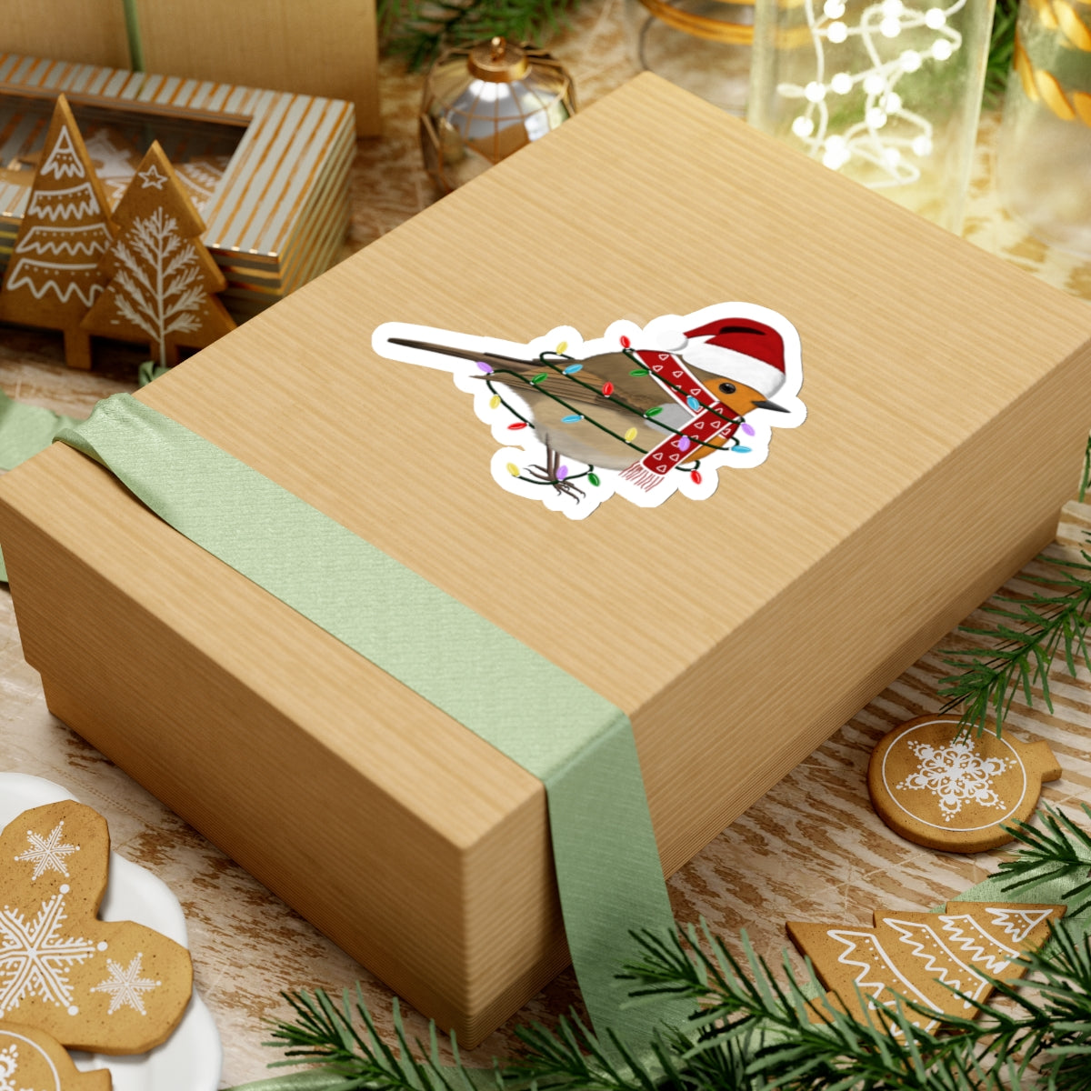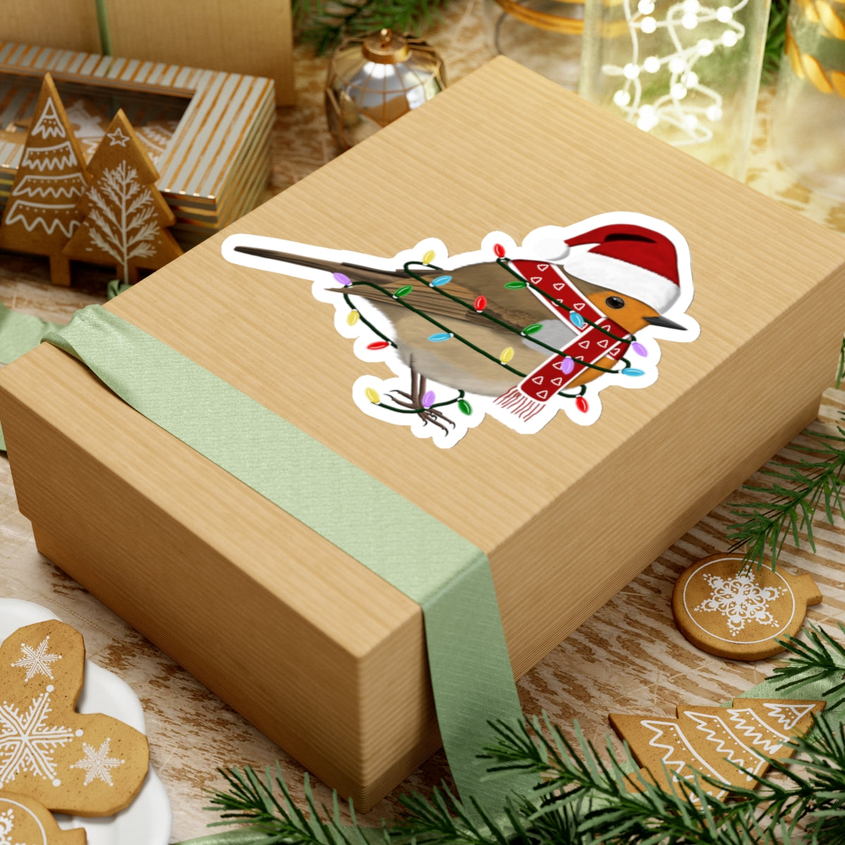 European Robin with Fairy Lights Santa Claus Hat and Scarf Christmas Bird Sticker