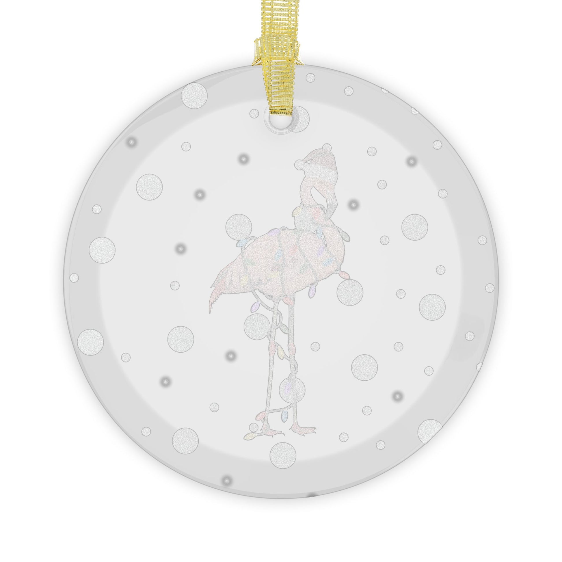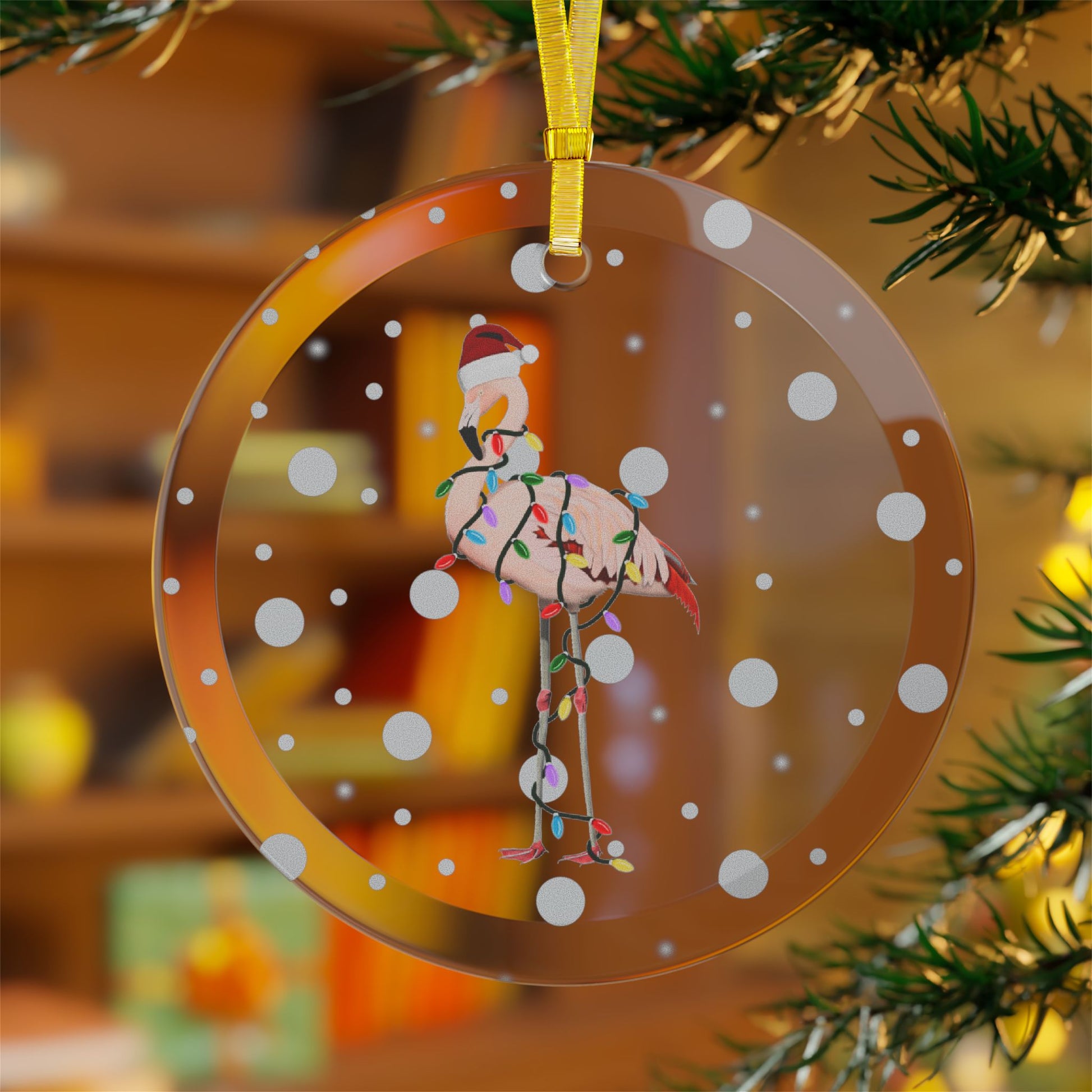 This glass ornament features a festive Christmas Flamingo with Fairy Lights design, with a bird dressed as Santa Claus. A perfect addition to your holiday decor, this ornament brings a touch of whimsy and charm to any space. Makes a great gift for bird lovers and anyone who loves unique Christmas decorations.