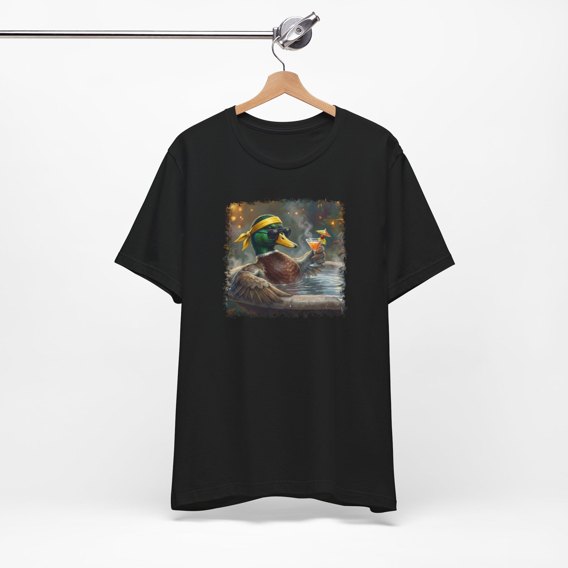 Meet your new favorite tee! This hilariously unique design features a cool Mallard living its best life—chilling in a birdbath, rocking sunglasses, and enjoying a refreshing cold drink.