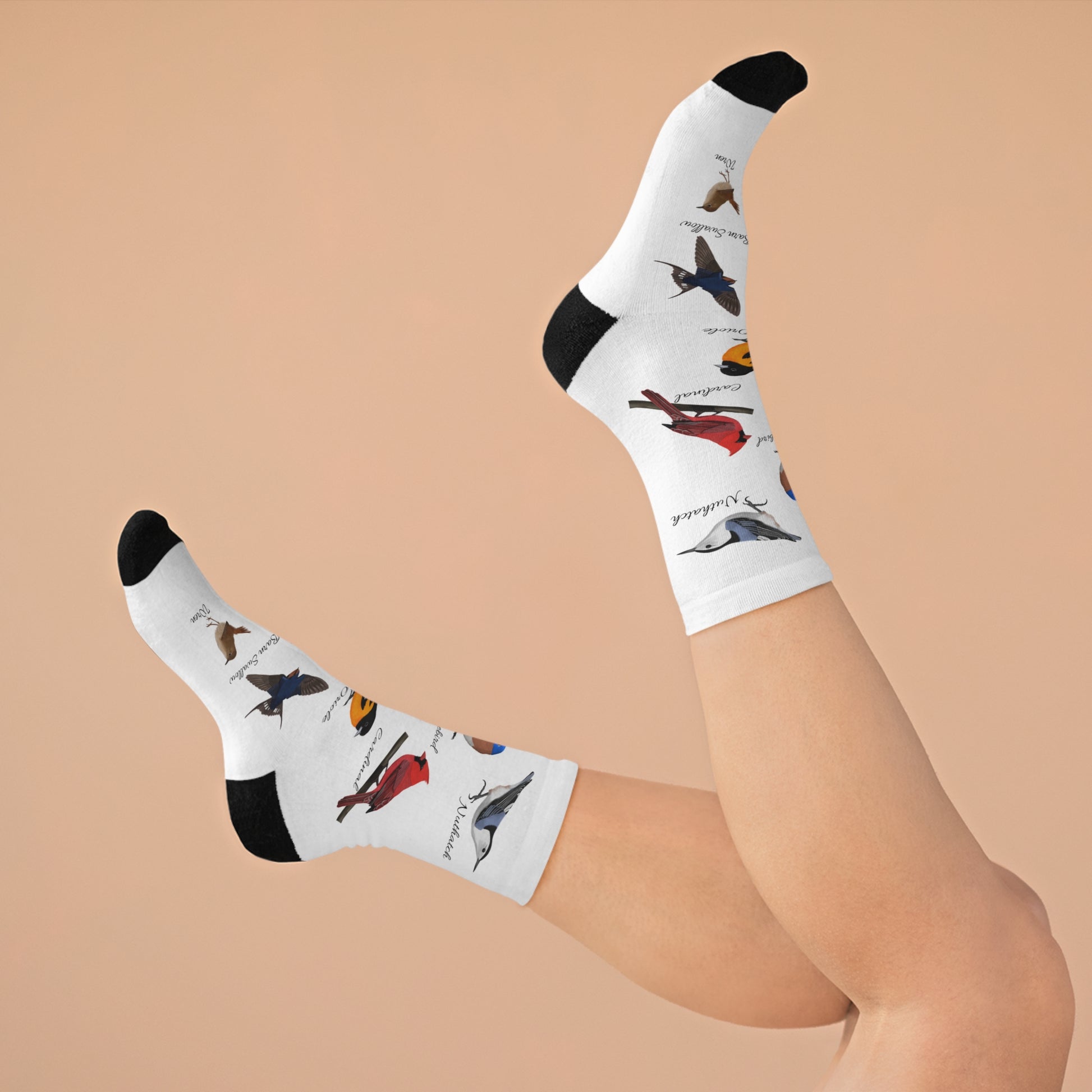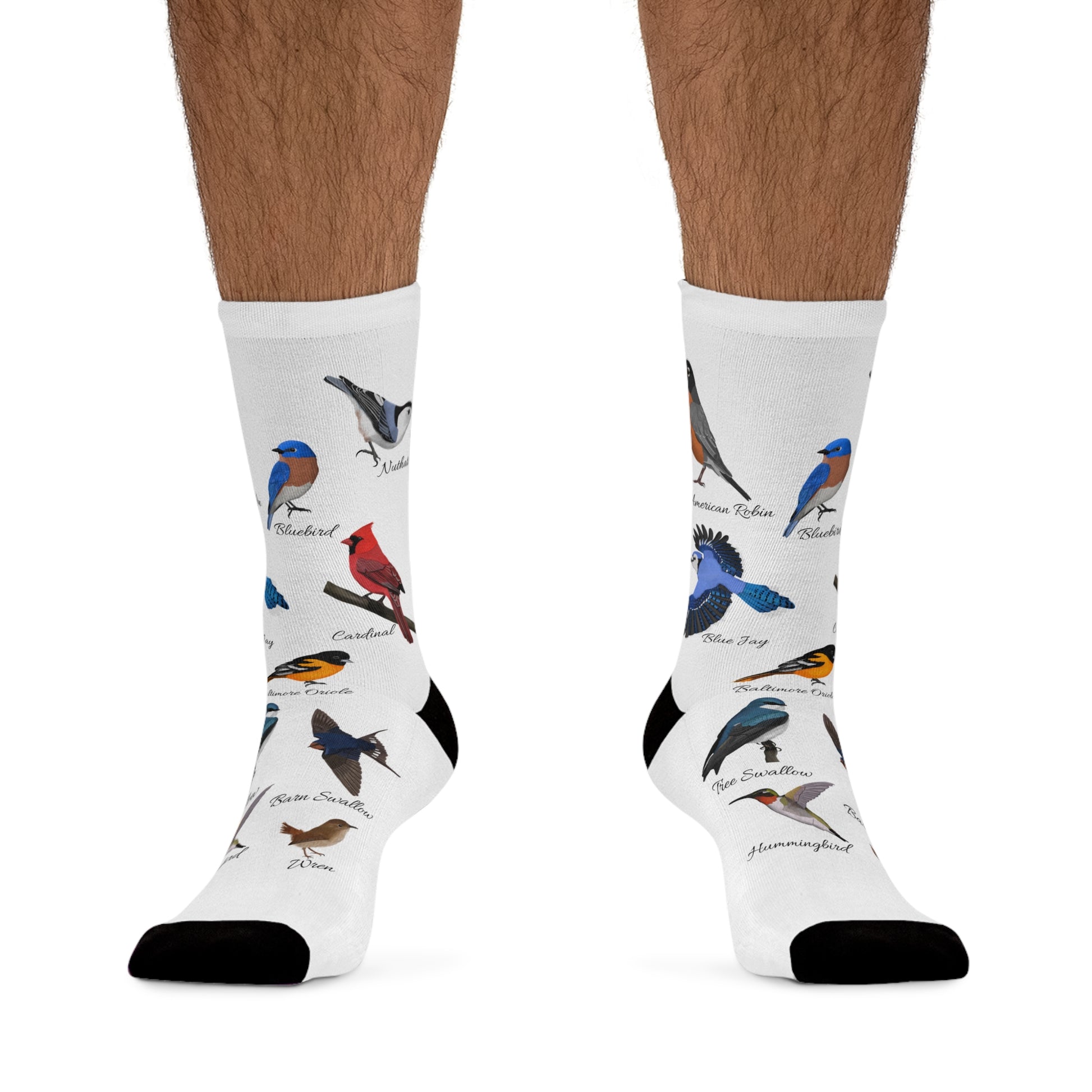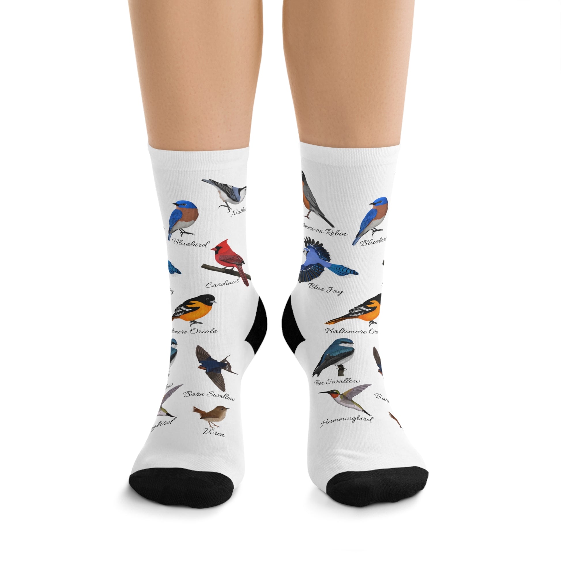 Elevate your birding experience with our Garden Birds, Blue Jay, Cardinal, Robin, Nuthatch, Wren, Tree Swallow, Barn Swallow, Oriole, Bluebird, Hummingbird bird socks - designed specifically for birdwatchers. These socks are perfect for long treks, providing comfort and support while you explore. The ideal gift for any avid birdwatcher, these socks will add joy and functionality to their outdoor adventures.