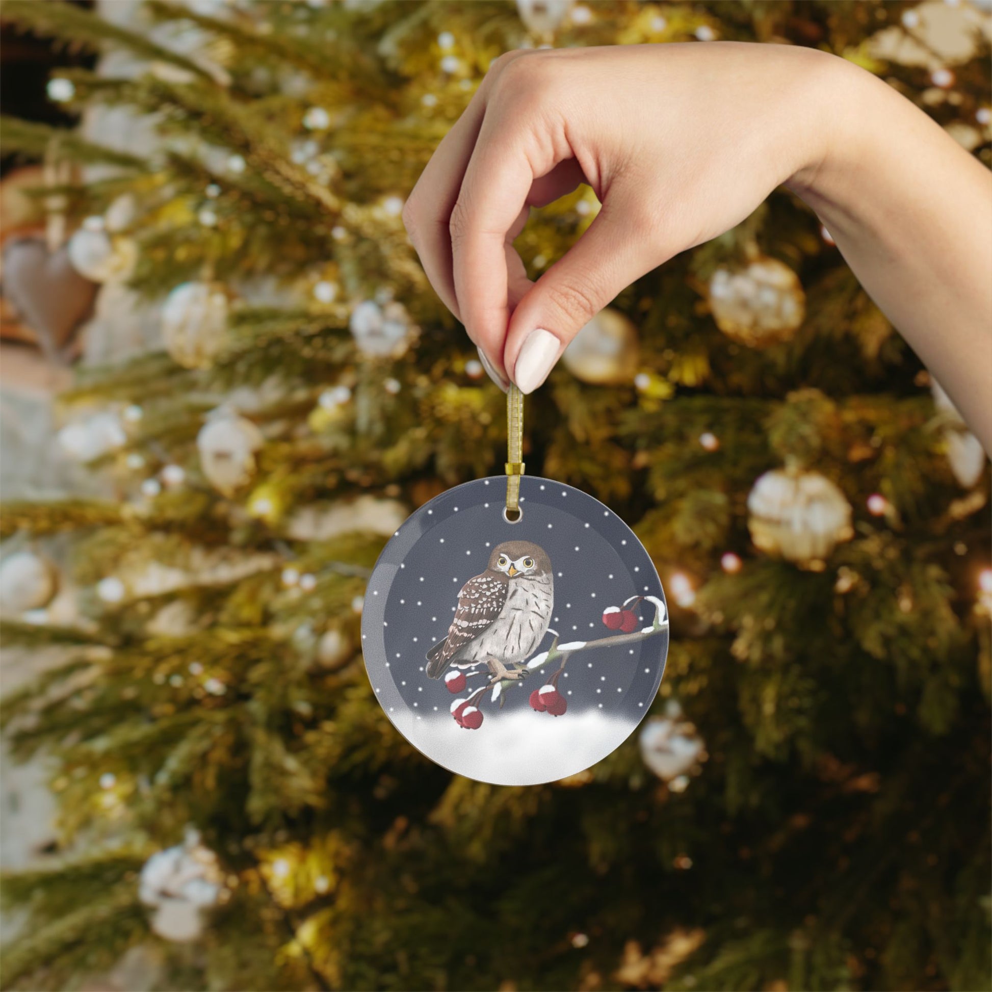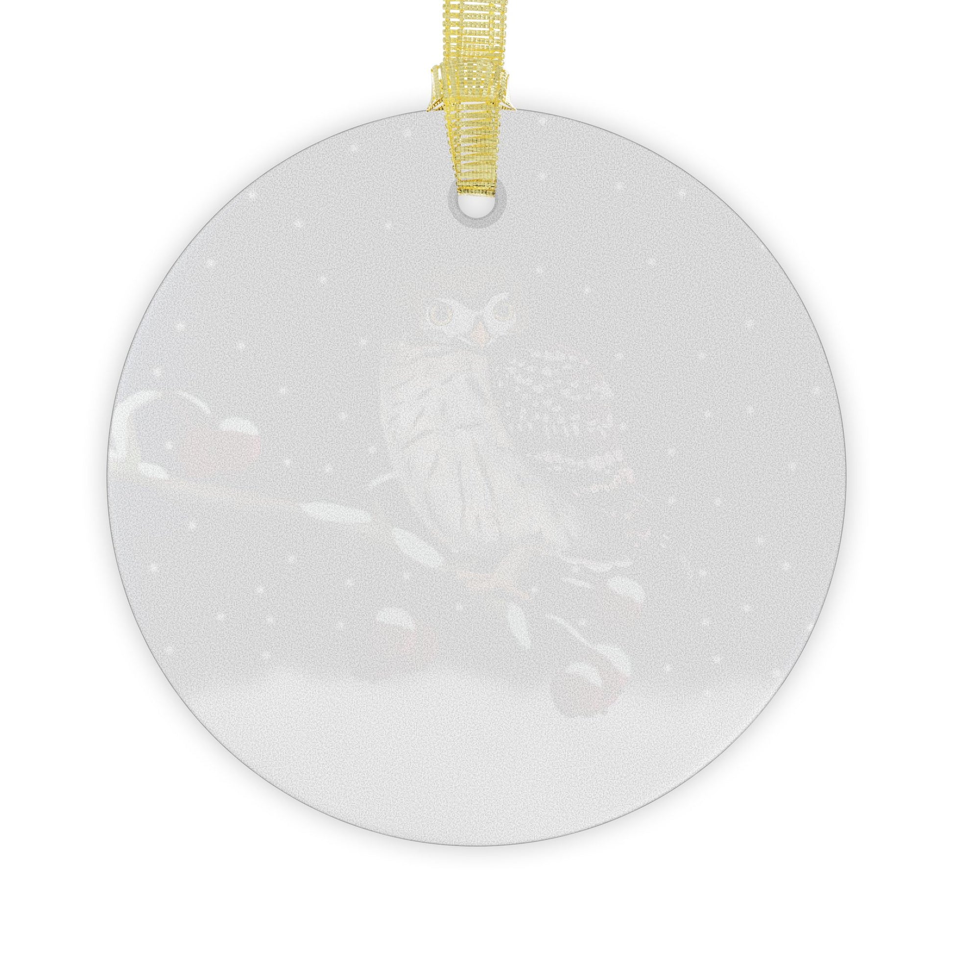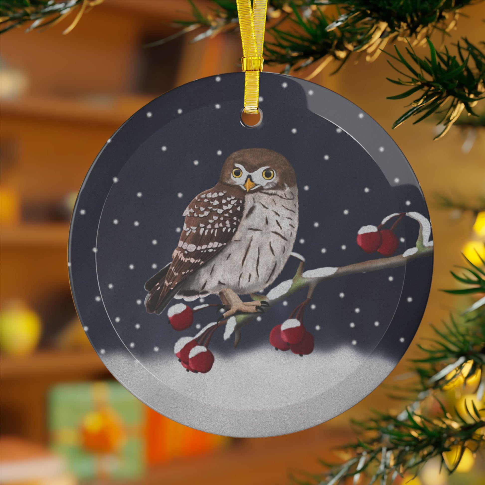 Little Owl on a Winter Branch Christmas Bird Glass Ornament