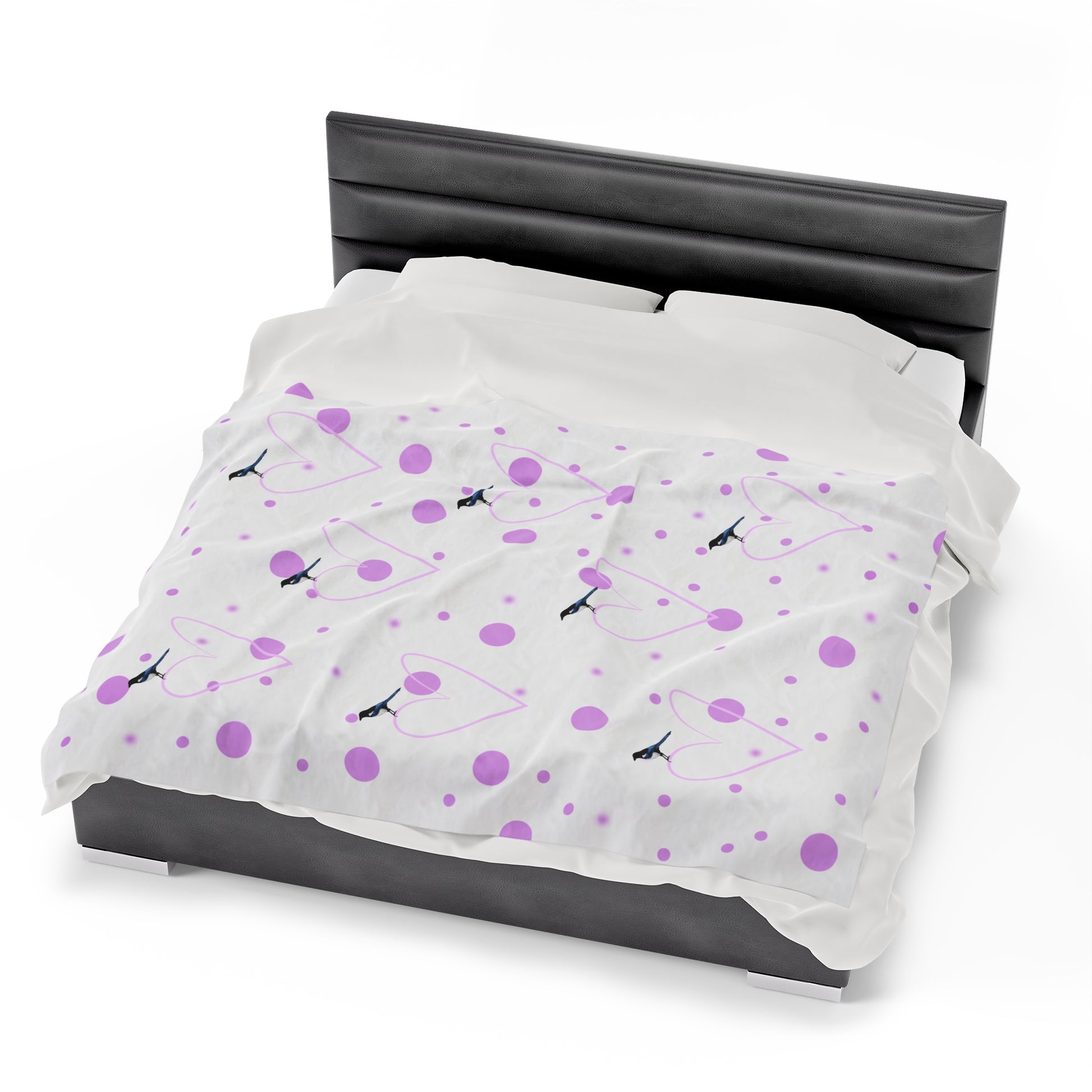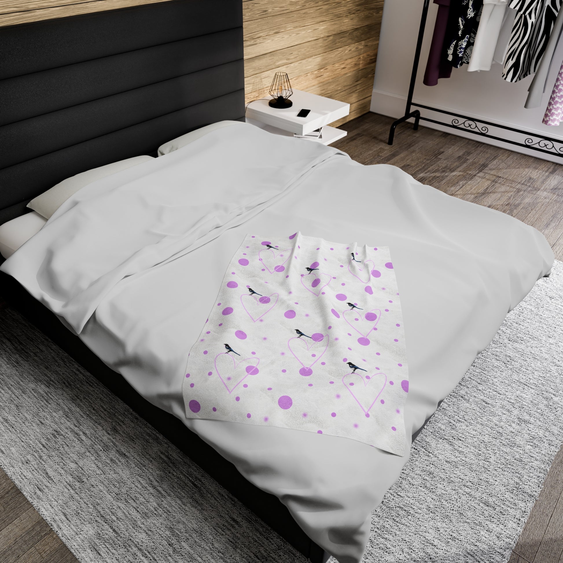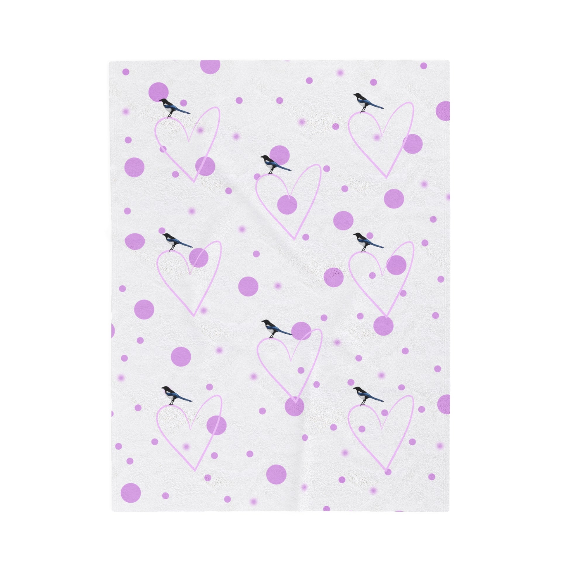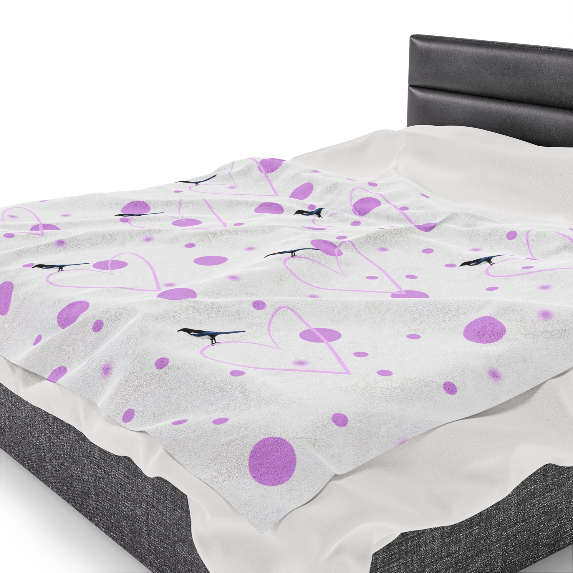 Magpie Valentine's Day Bird Velveteen Plush Blanket Pink Hearts and Dots