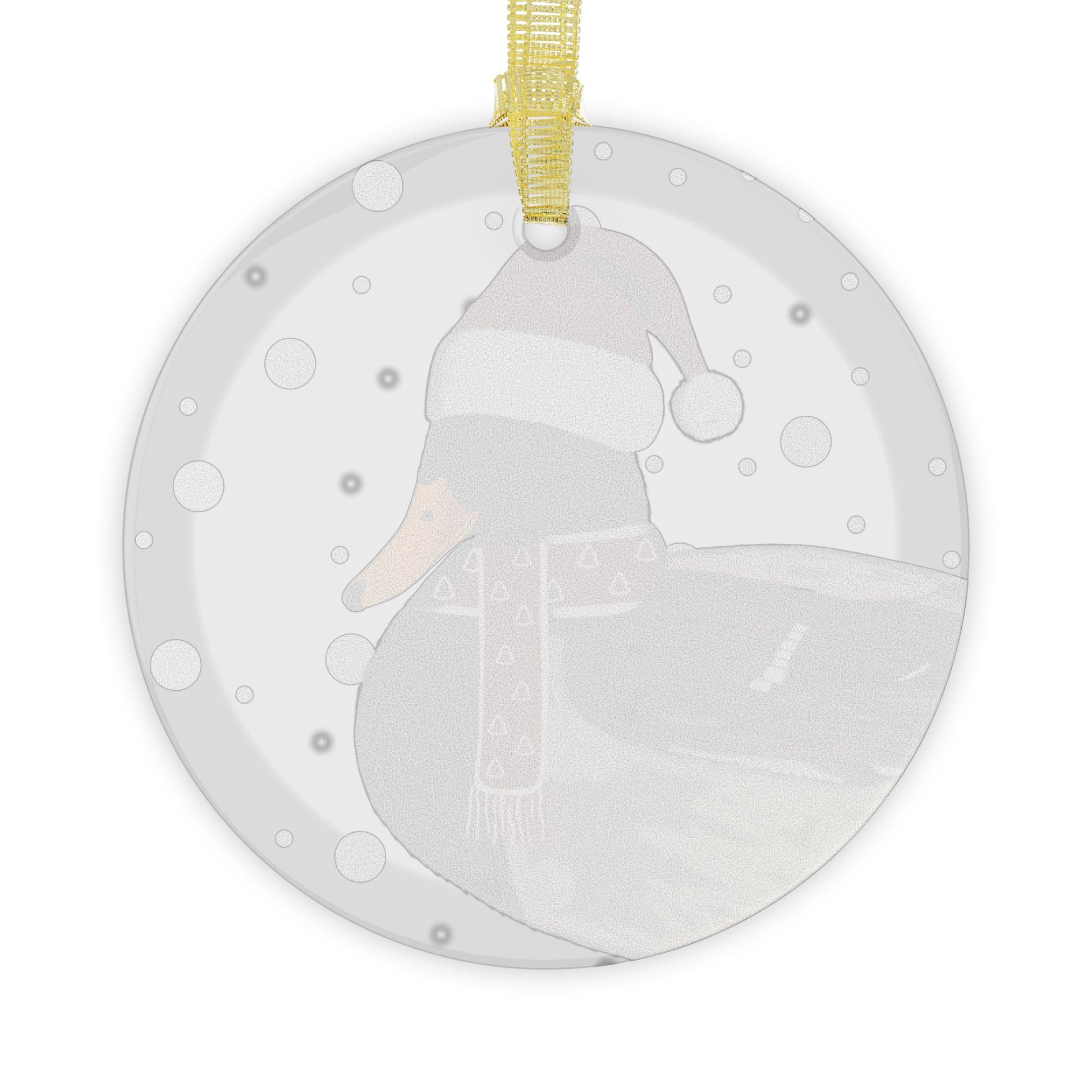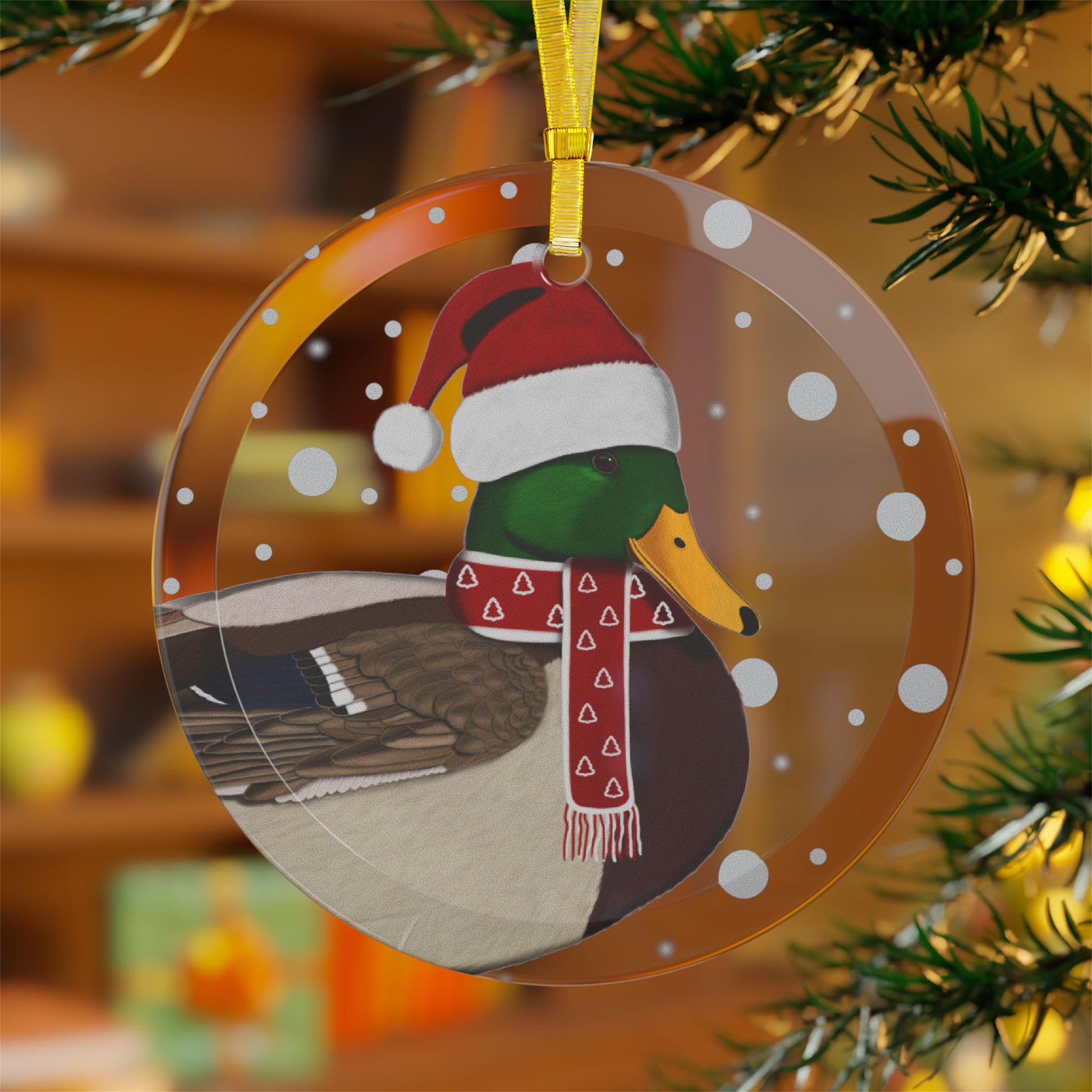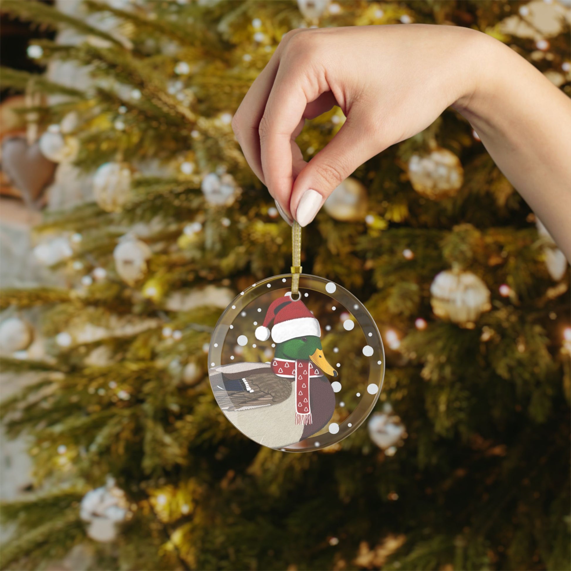 This glass ornament features a festive Christmas Mallard design, with a bird dressed as Santa Claus. A perfect addition to your holiday decor, this ornament brings a touch of whimsy and charm to any space. Makes a great gift for bird lovers and anyone who loves unique Christmas decorations.